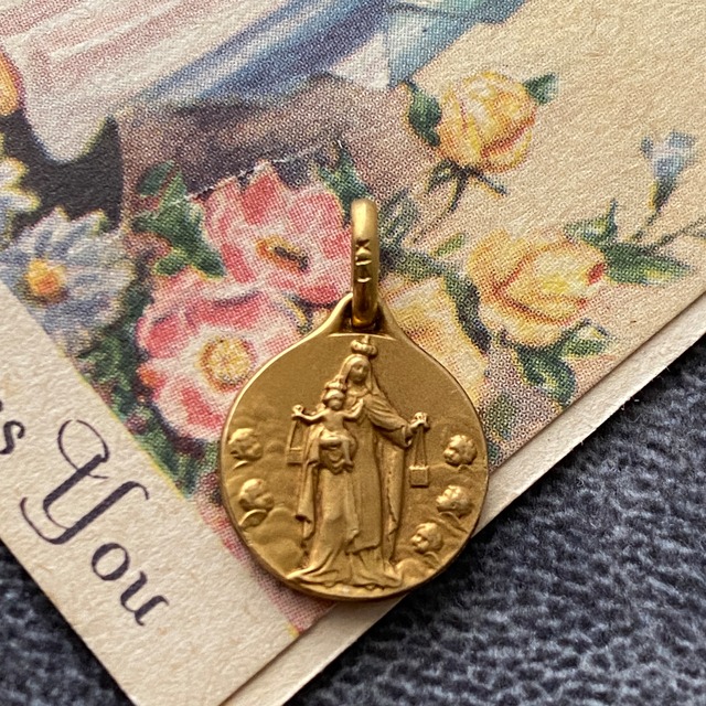 スカプラリオを手にするカルメル山の聖母と幼子イエス。 その足元には守護天使(ケルビム)が囲む様子が描かれ、救いと守護の象徴として信頼されてきたスカプラリオ信心を伝えています。 背面には、聖心を示すイエス。 燃える御心は無限の愛と慈しみを象徴し、人々を赦しと癒しへ導くしるしです。 フランスの名門ジュエリーブランド「FIX」による1920年代の作品。 上質な金色の輝きと緻密な造形美が、聖なるものでありながらジュエリーとしての魅力も放っています。 このメダイは「愛と守護の二つの力」をひとつに宿すもの。 母なる優しさと、赦しの心を常に身近に感じることで、私たちの祈りと意識が静かに整えられ、光へと導かれていきます。 ♱⋰ ⋱✮⋰ ⋱♱⋰ ⋱✮⋰ ⋱♱⋰ ⋱✮⋰ ⋱♱⋰ フランス製(FIX刻印あり) 1920年代頃 ゴールドフィルド 直径 約1.25cm(バチカン含まず)