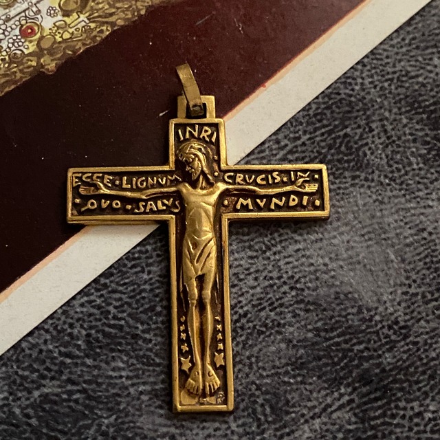 存在感のある大きさのクロスですが、厚みはなく、その分前面のキリスト像が際立ちます。 フランス製でありながらも、東方キリスト教美術の抽象文様を連想させるパターンの浮き彫りが美しい作品です。 キリスト像も、肉付きや全体的なプロポーションが大変優れた造形美を感じられます。 性別関係なく身につけていただけるデザインです。 ♱⋰ ⋱✮⋰ ⋱♱⋰ ⋱✮⋰ ⋱♱⋰ ⋱✮⋰ ⋱♱⋰ フランス製 1920年頃 合金製 5.6×3.2cm