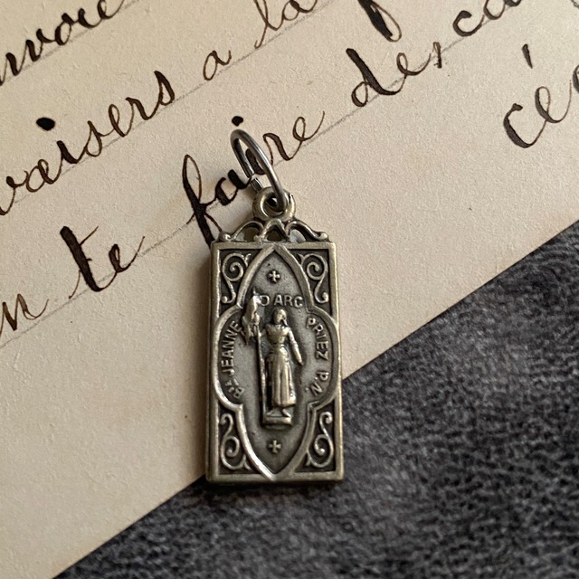 絵画のように彫りが細かく美しいこちらの作品は、背景には大聖堂の柱が見えます。 シャルル7世の戴冠(神のご使命)を果たしたジャンヌですが、どんな時も心にあったのはキリストと聖母マリアへの信仰心でした。 そのことがジャンヌの所作からも伝わります。 背面は、「デュ・リス」(du Lys) 家の紋章が刻まれています。 「デュ・リス」家とは、国に貢献したジャンヌの活躍を評価したシャルル7世が、1429年頃、ジャンヌとその家族に、貴族の地位と紋章と共に授けたものです。 ジャンヌの紋章は、フランスの色である青の背景にフランスの象徴フルール・ド・リスの間に置かれた剣が王冠を支えるデザインで、お告げから始まり、シャルル7世の戴冠を果たした栄光が讃えられています。 ジャンヌの死刑をきっかけに、「再裁判を、、ジャンヌの名誉の回復を!」とフランスは訴えながら、国はやがて一つにまとまっていきました。 【神を信じないで生きることは、 若くして死ぬより悲しい】 剣を胸に当て、両手を重ねる彼女の迷いなく、穏やかな強さ。 これが神を信じ行動する者なのだと伝わる素晴らしい作品です。 ♱⋰ ⋱✮⋰ ⋱♱⋰ ⋱✮⋰ ⋱♱⋰ ⋱✮⋰ ⋱♱⋰ フランス製 1930年前後 シルバーメッキ 直径2.6cm