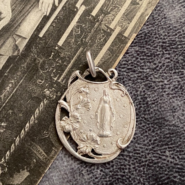 奇跡の聖母とは、マリアさまご自身が啓示された不思議のメダイのデザインの『無原罪の御宿りの聖母』のことを意味します。 アールデコ調の花の透かし細工に囲まれた大変希少な作品です。 マリアさまの両手から恩寵が流れ、神聖さと静けさが伝わります。 一般的な不思議のメダイのデザインと異なりますが、とても趣のある素晴らしいアート作品であり、聖品といえるでしょう。 ♱⋰ ⋱✮⋰ ⋱♱⋰ ⋱✮⋰ ⋱♱⋰ ⋱✮⋰ ⋱♱⋰ フランス製 1900年頃 シルバー製(刻印有り) 2.4×1.6