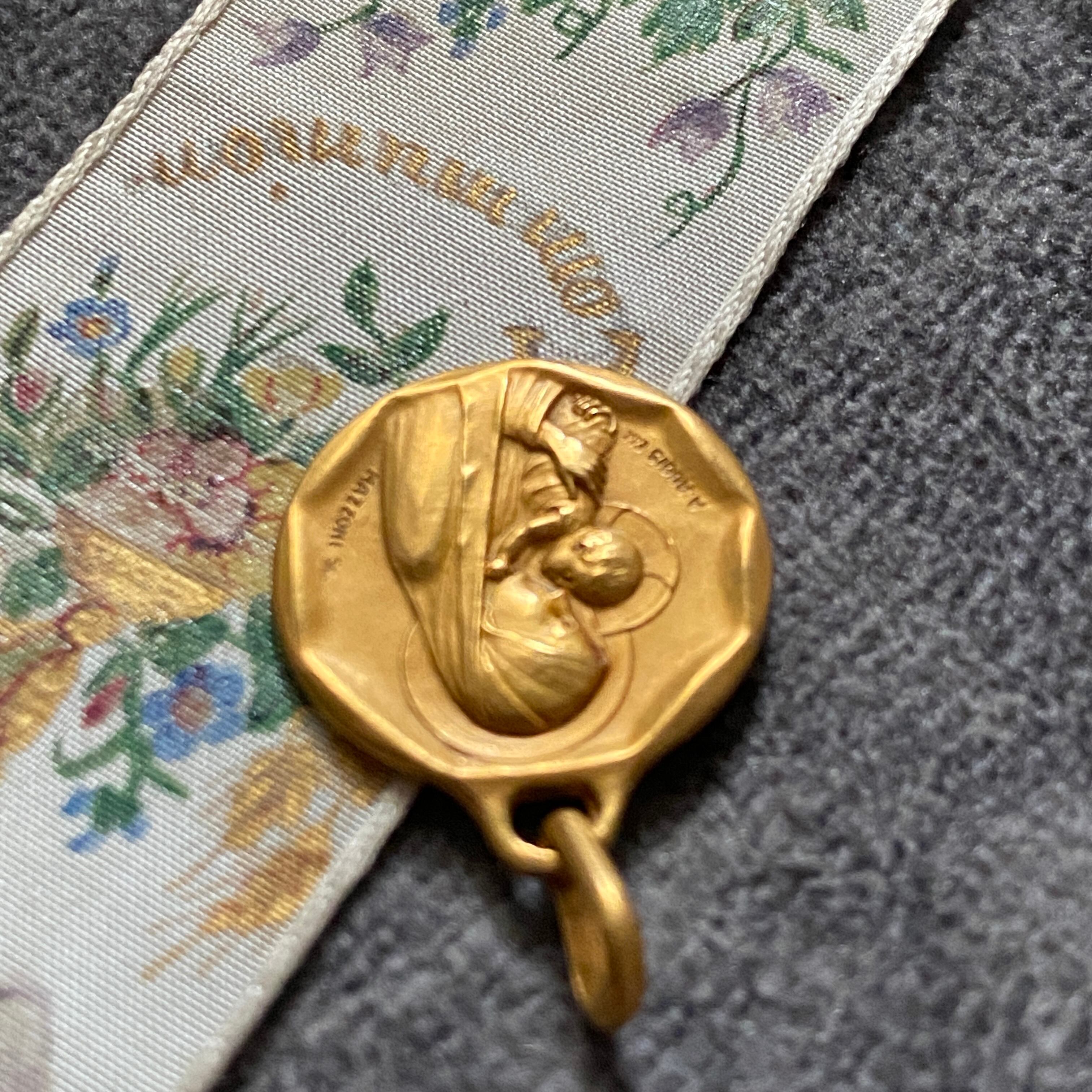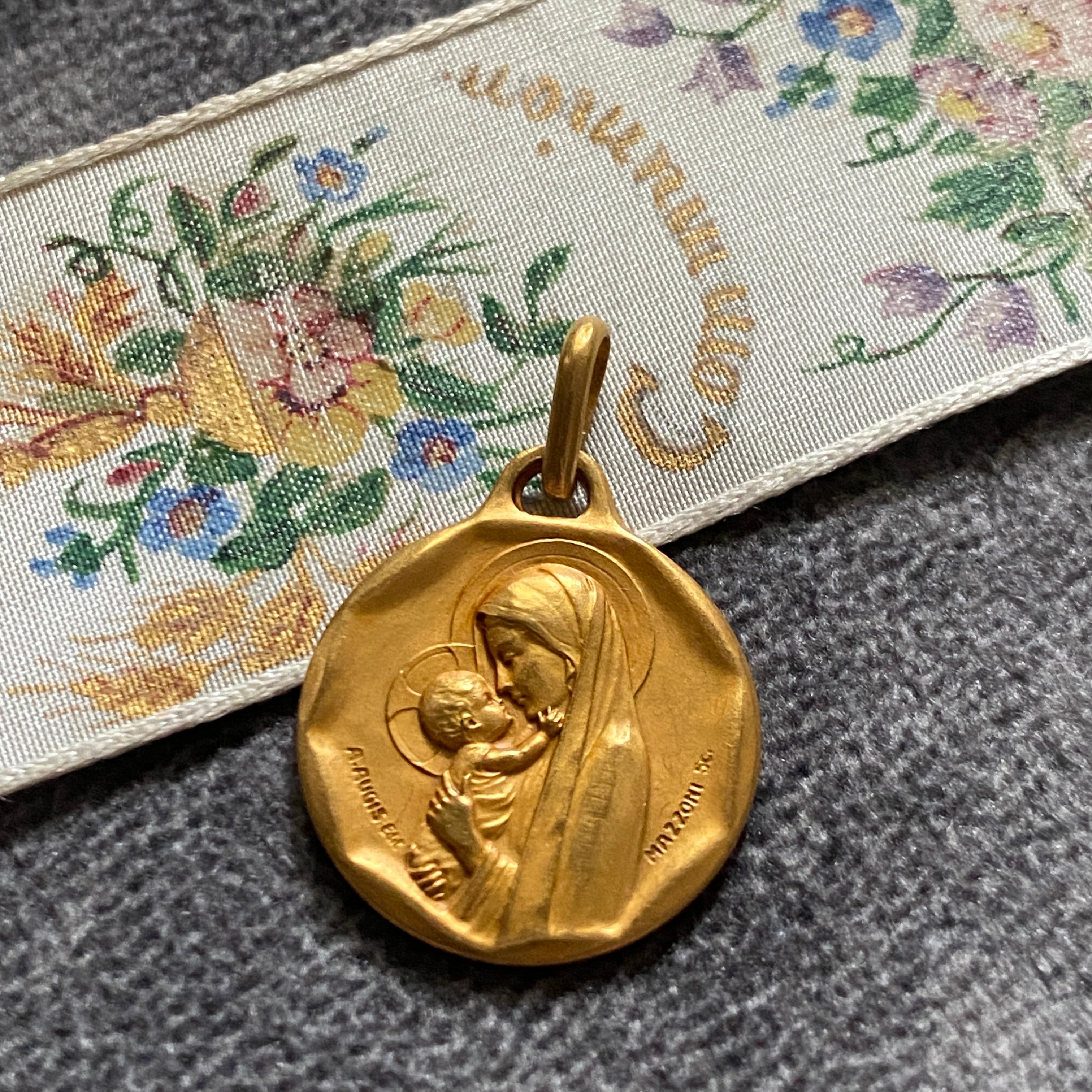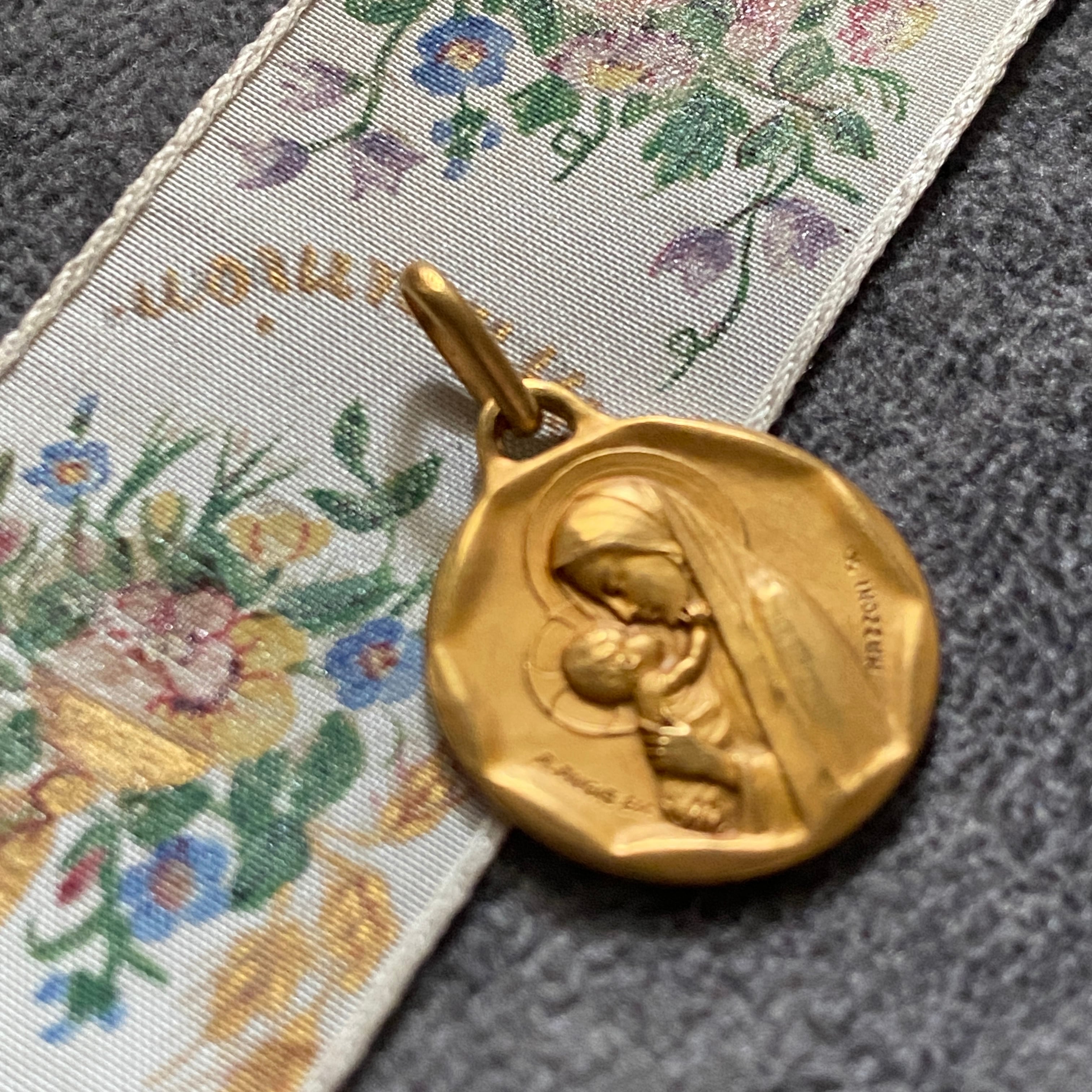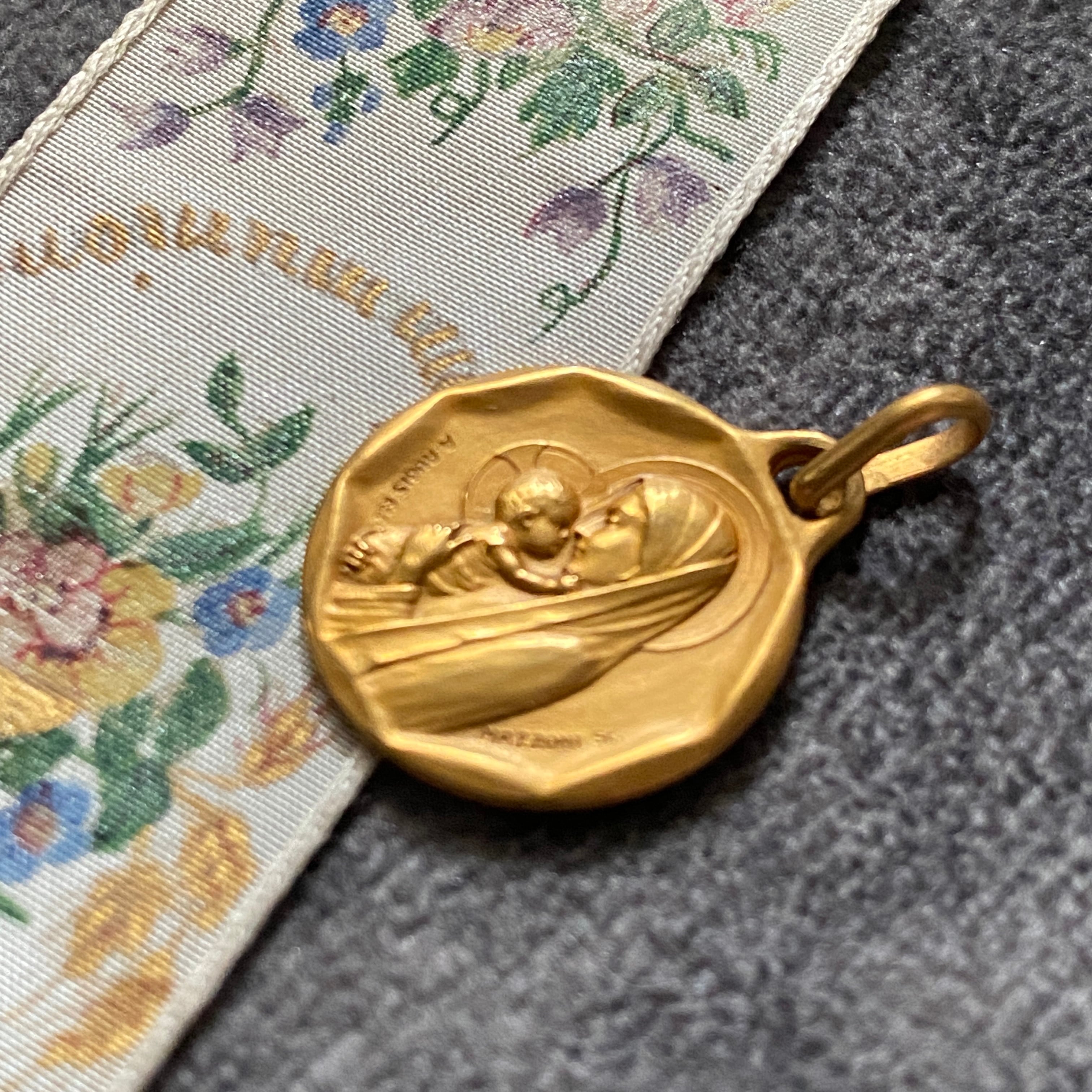 横向きに顔を寄せ合う聖母子デザインは、とても希少で、親子の絆と愛、神聖さが伝わる温かみのある作品です。