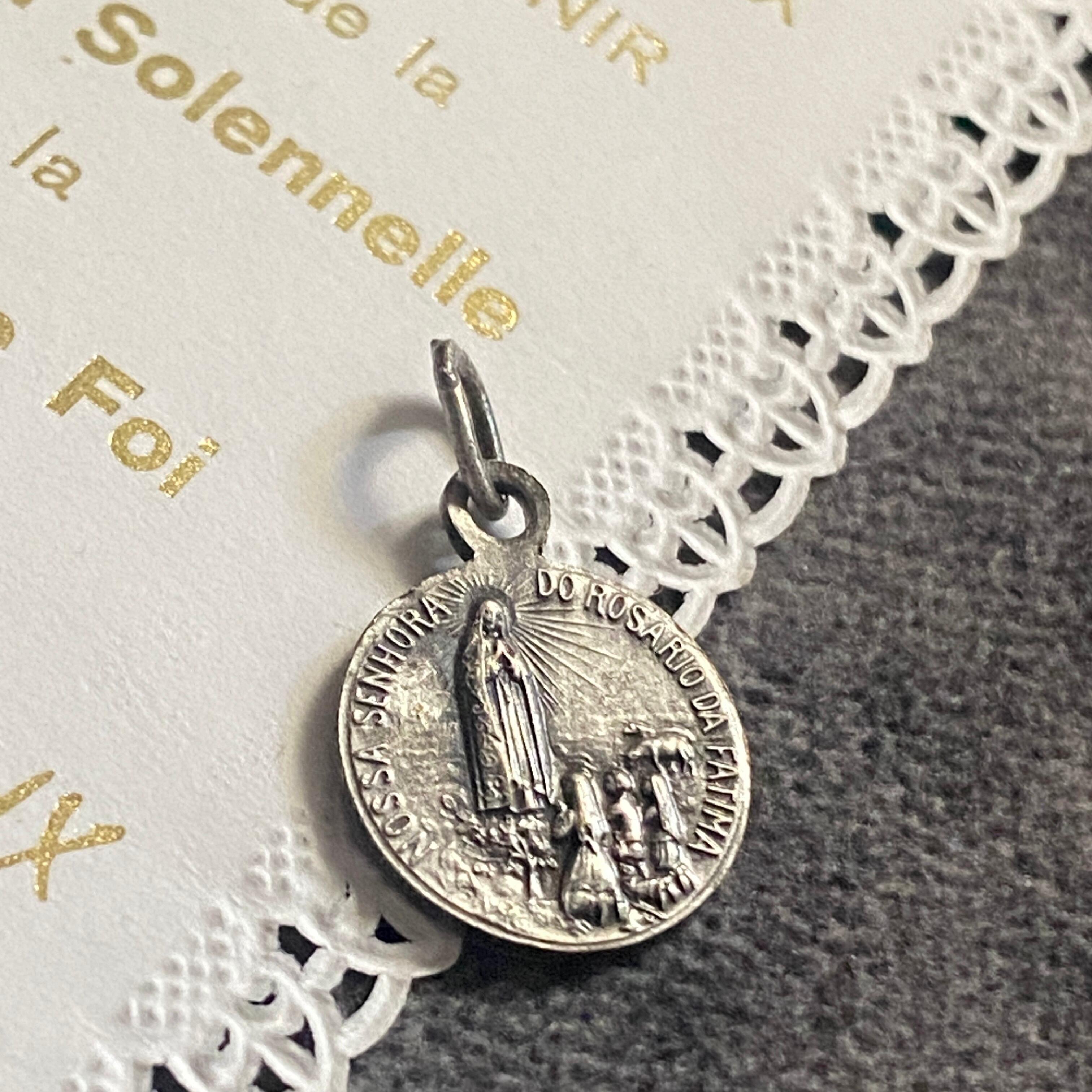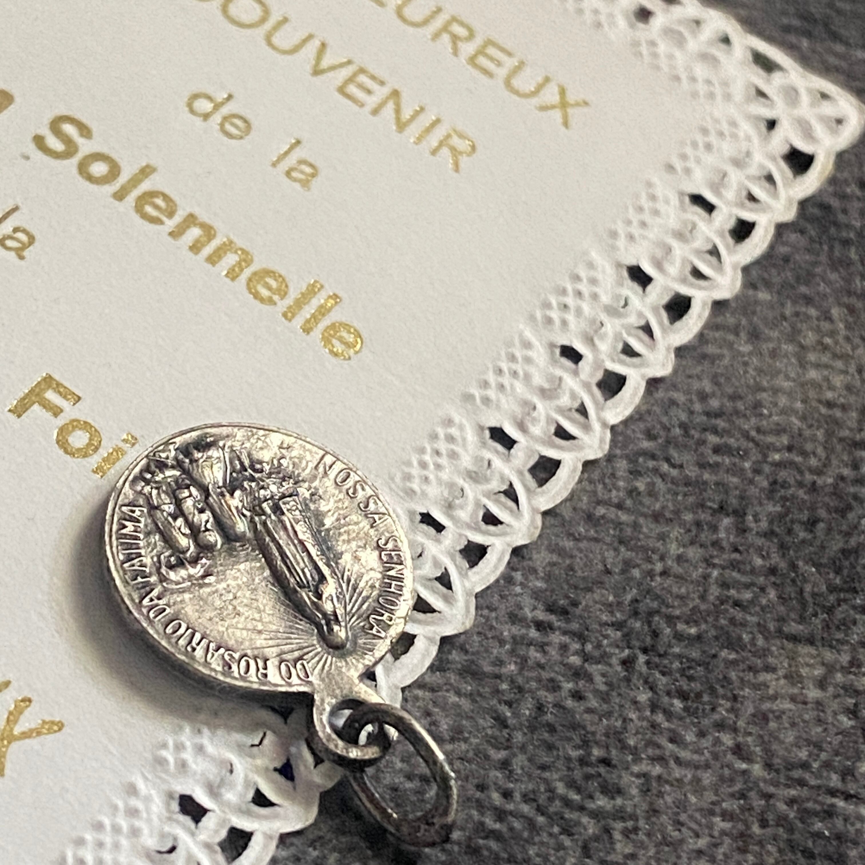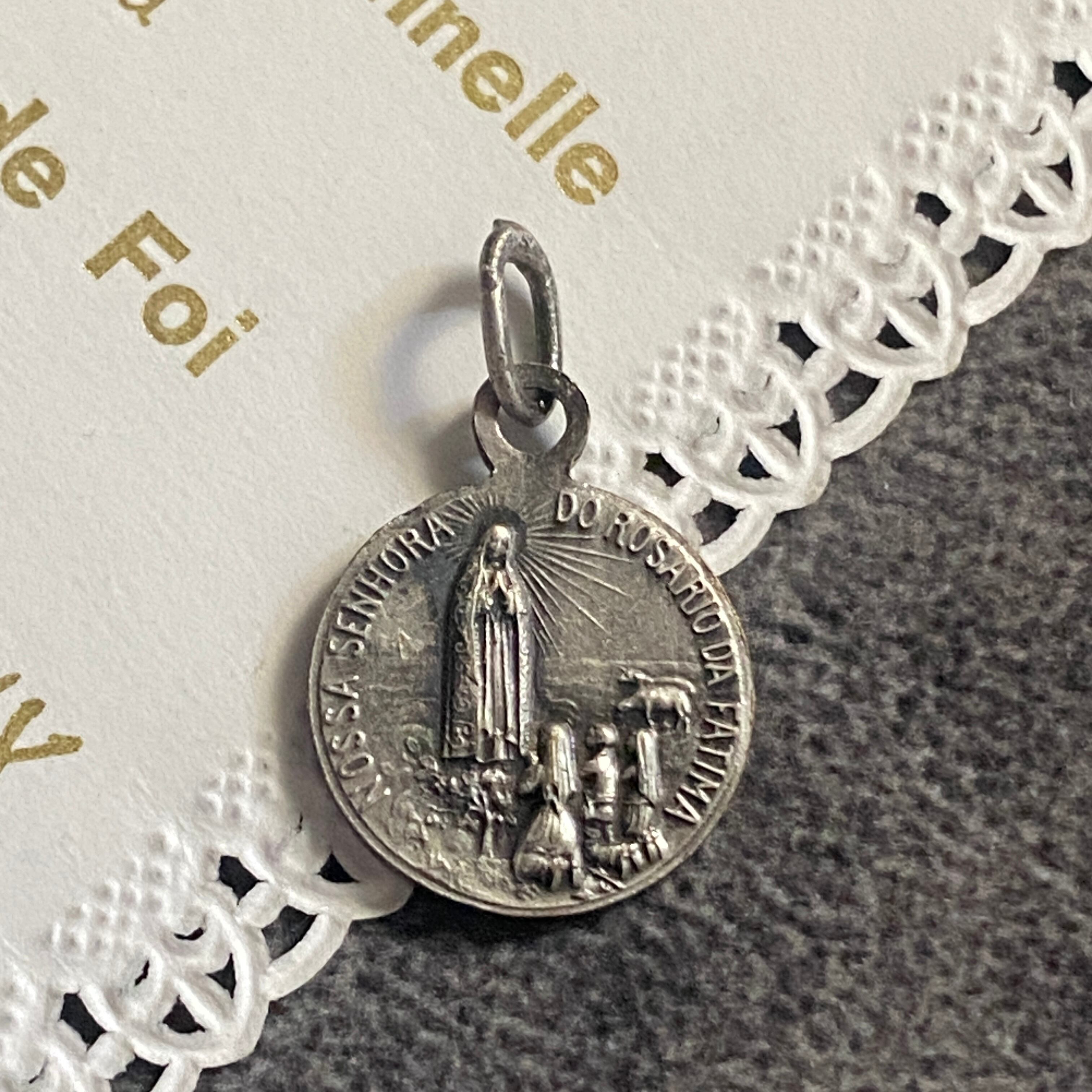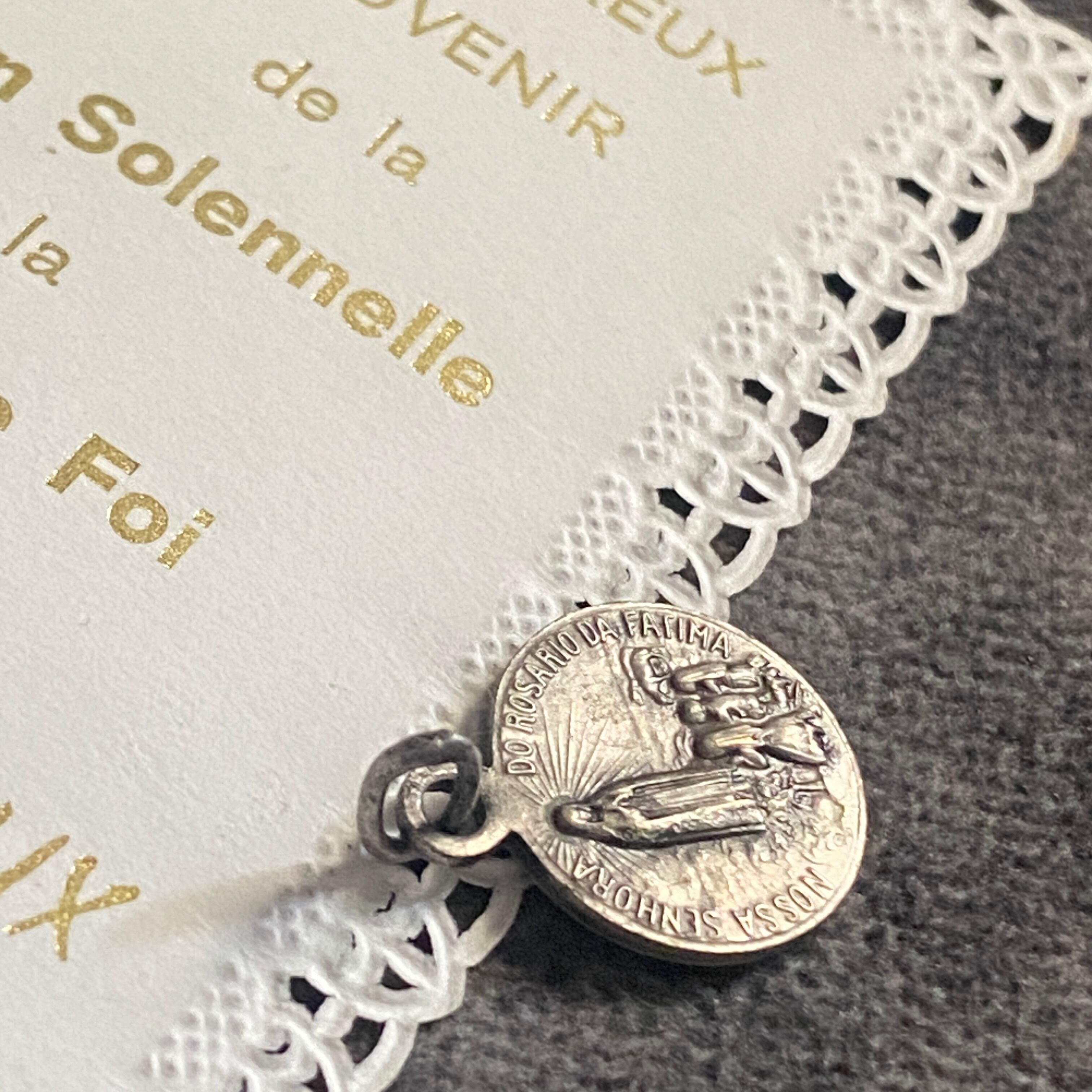 メダイの片面には、放射状の光に包まれながらファティマにご出現された聖母マリアと、祈りを捧げる3人の子どもたち。もう一方には、雲間から姿を現した聖心のマリアが、穏やかなまなざしで胸元に炎の灯る御心を示しています。