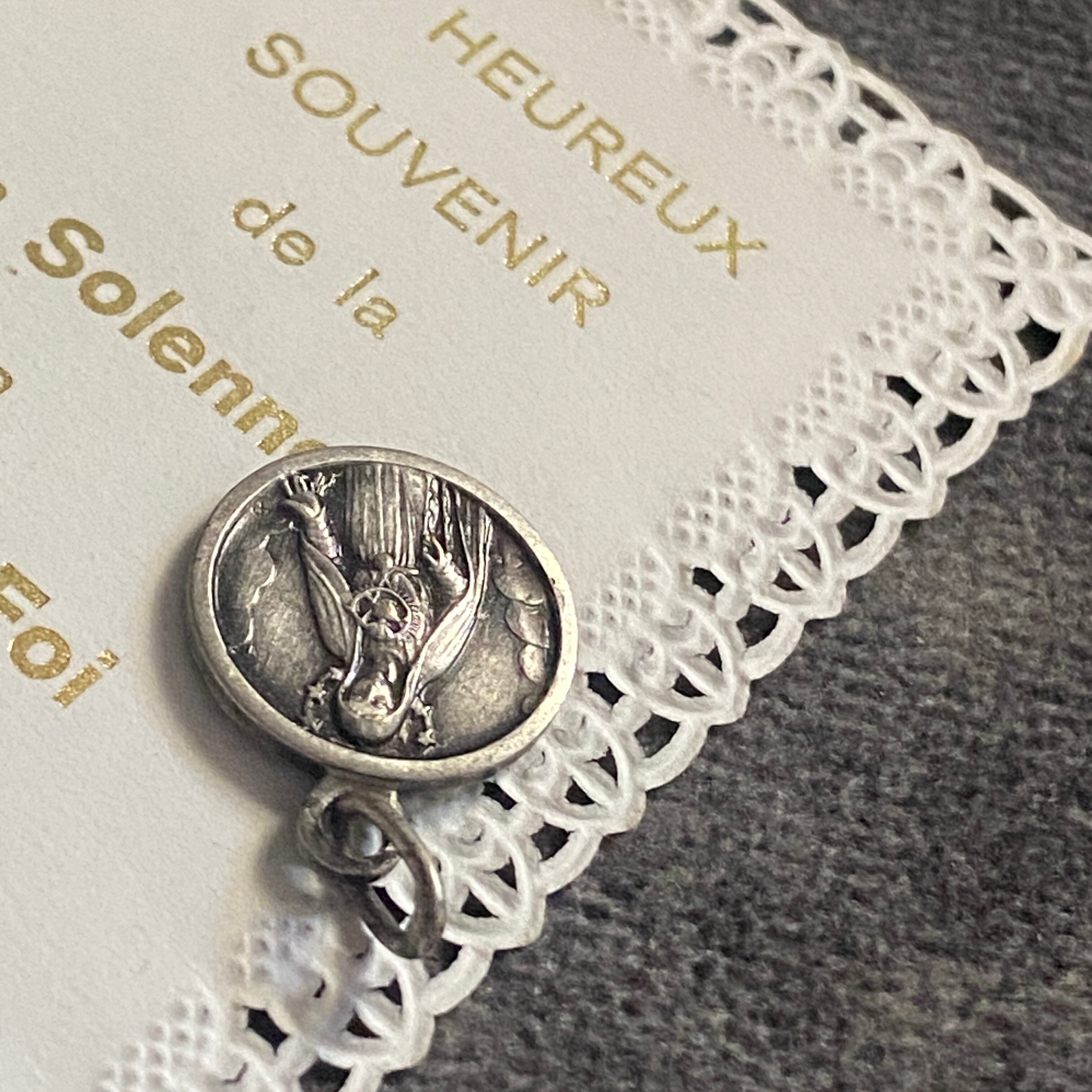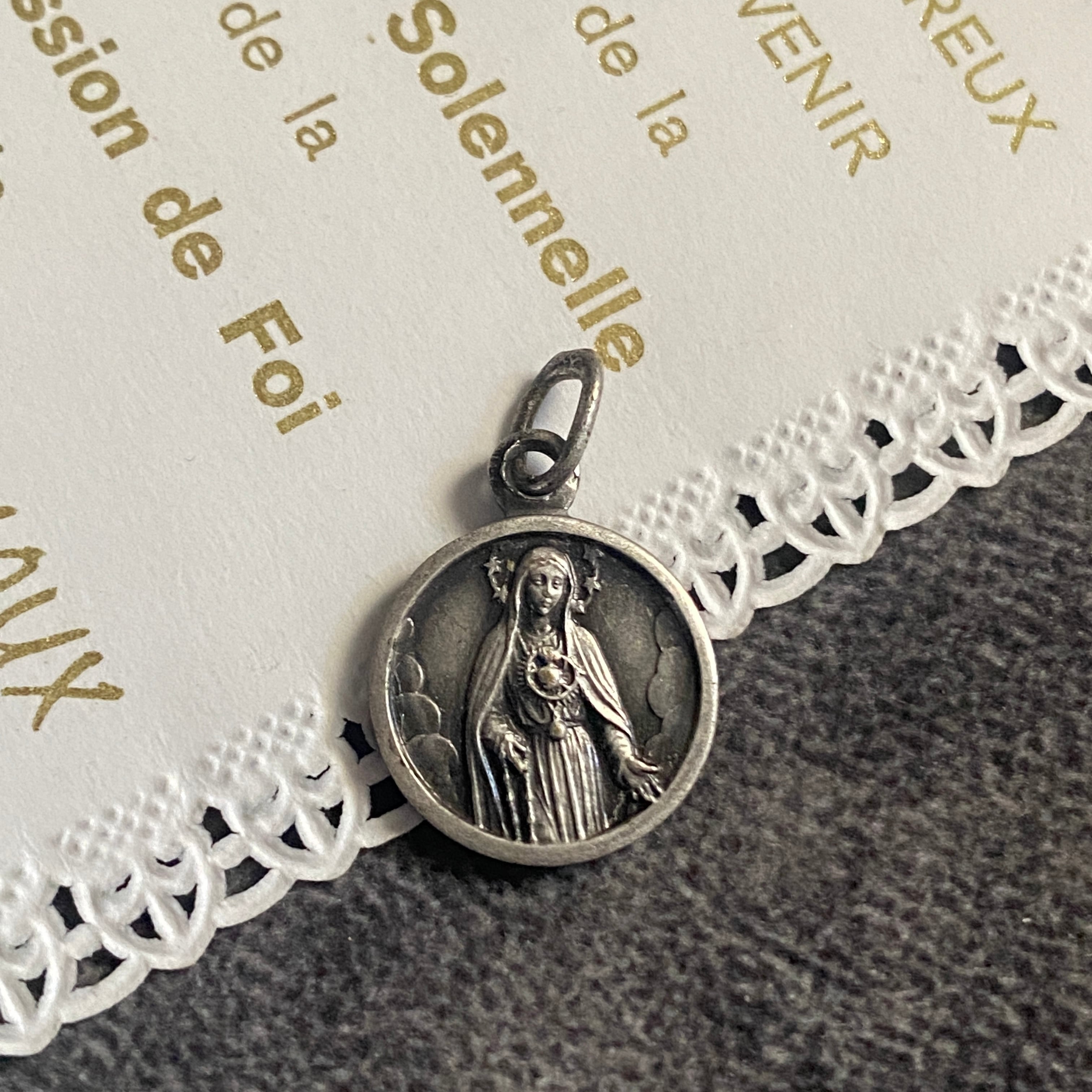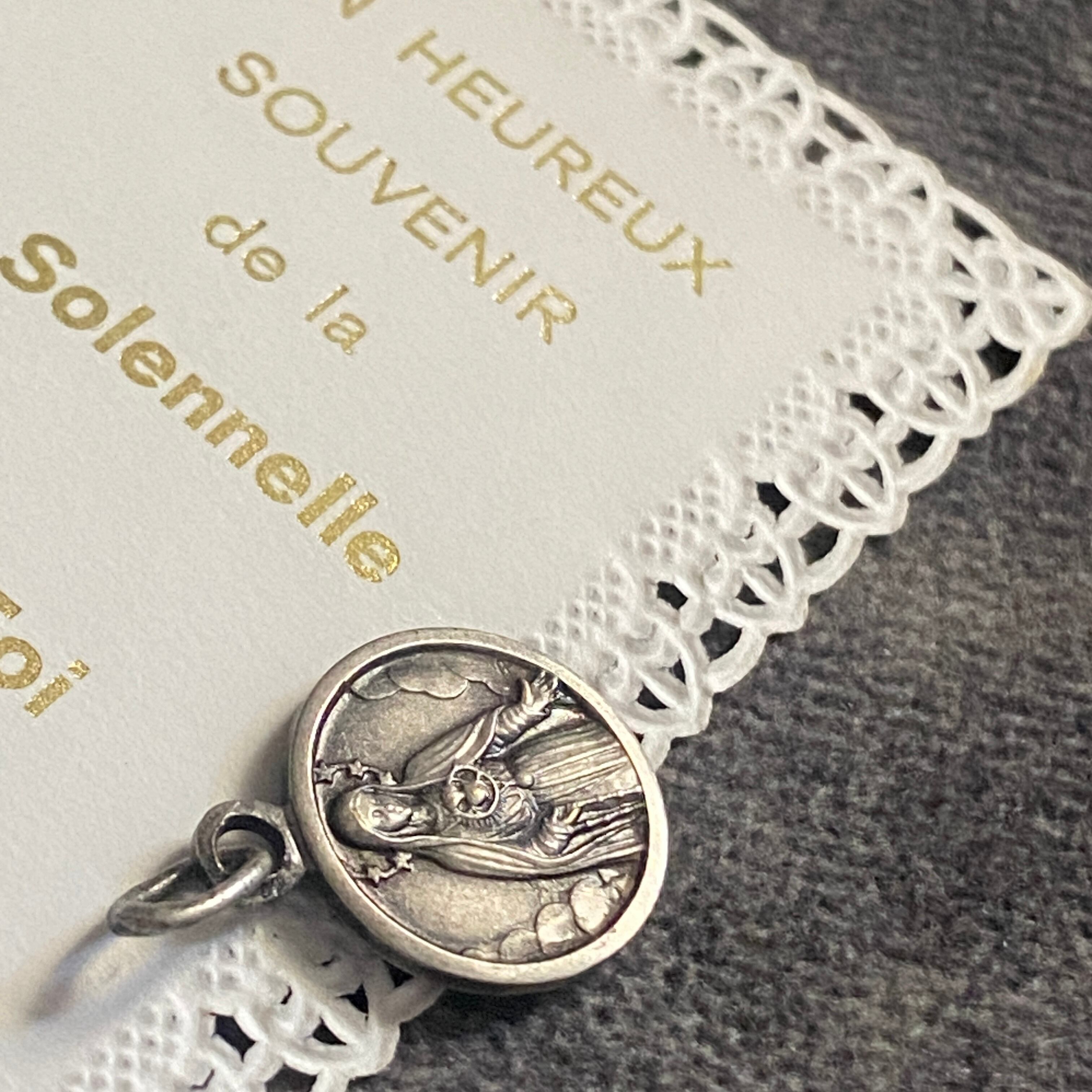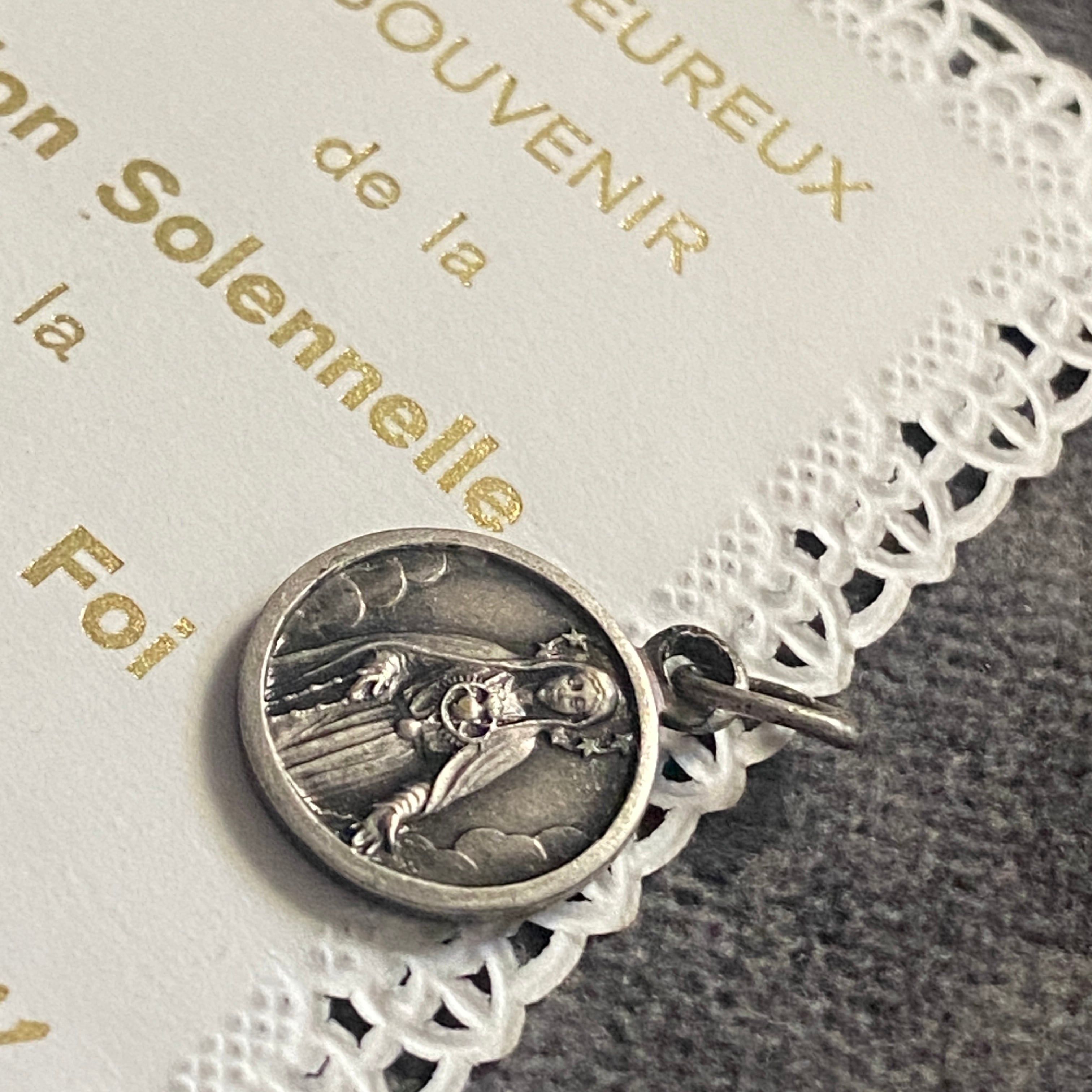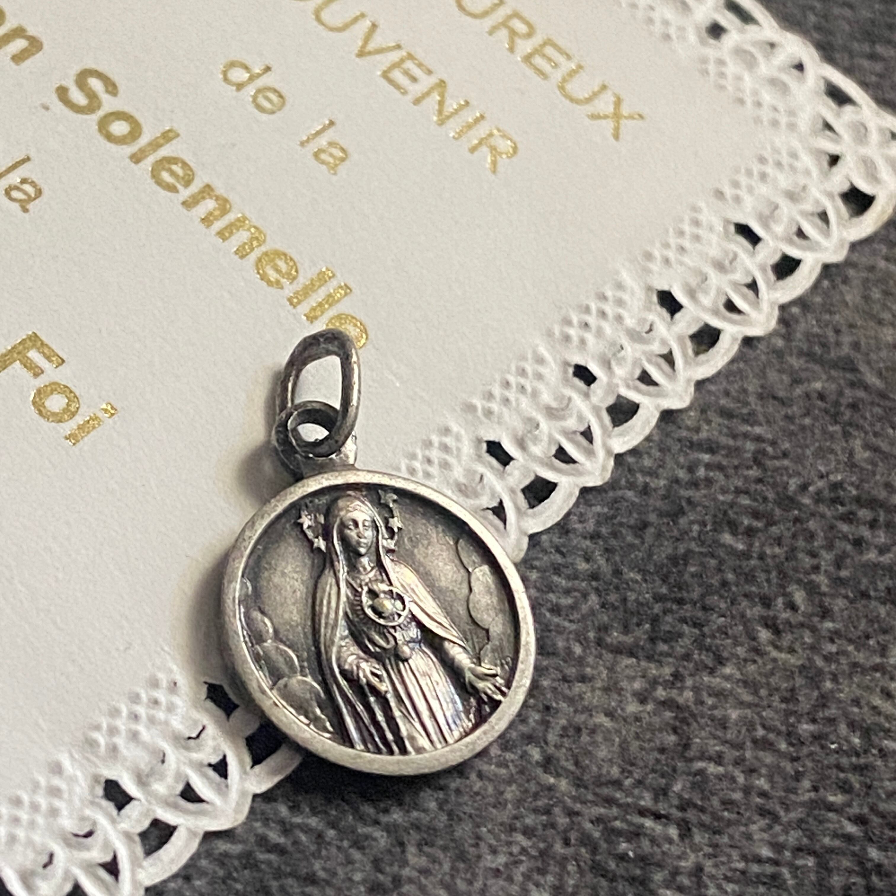 メダイの片面には、放射状の光に包まれながらファティマにご出現された聖母マリアと、祈りを捧げる3人の子どもたち。もう一方には、雲間から姿を現した聖心のマリアが、穏やかなまなざしで胸元に炎の灯る御心を示しています。