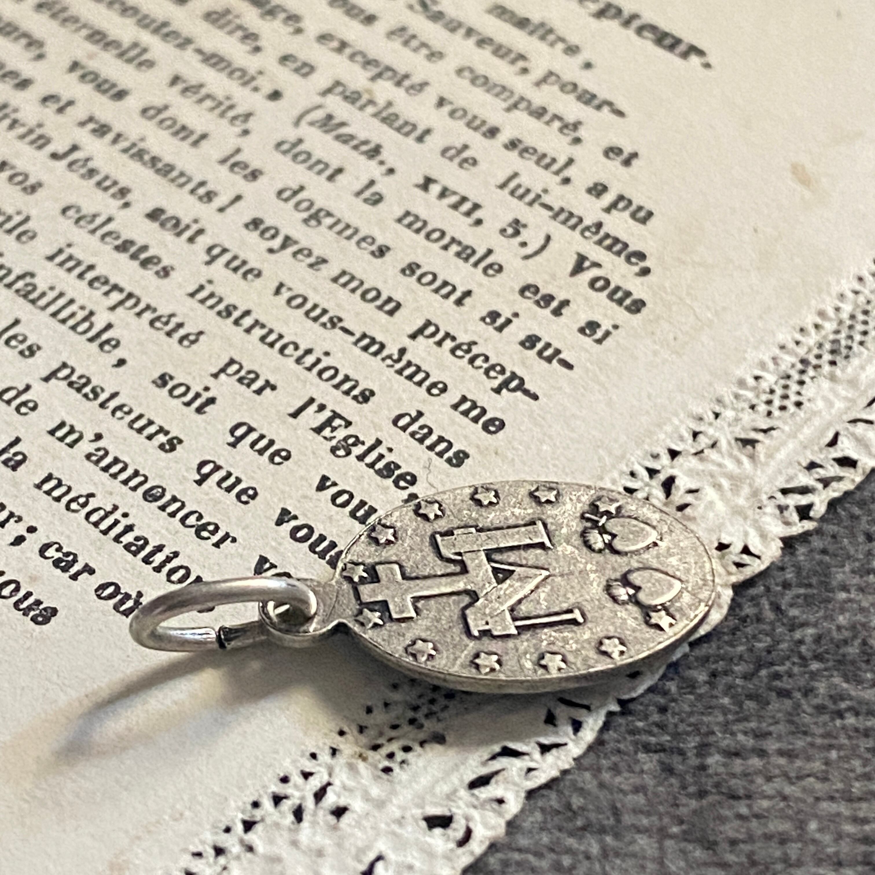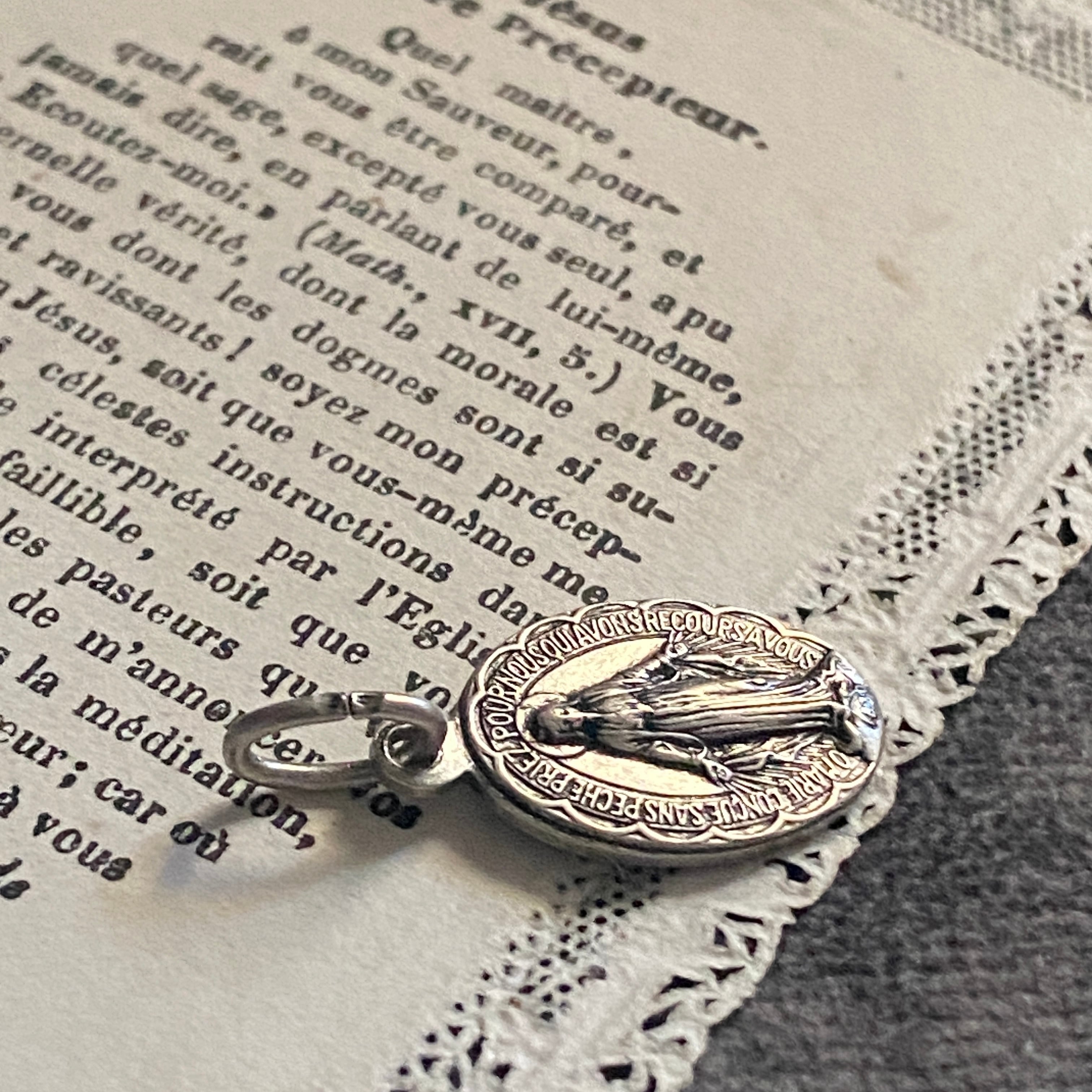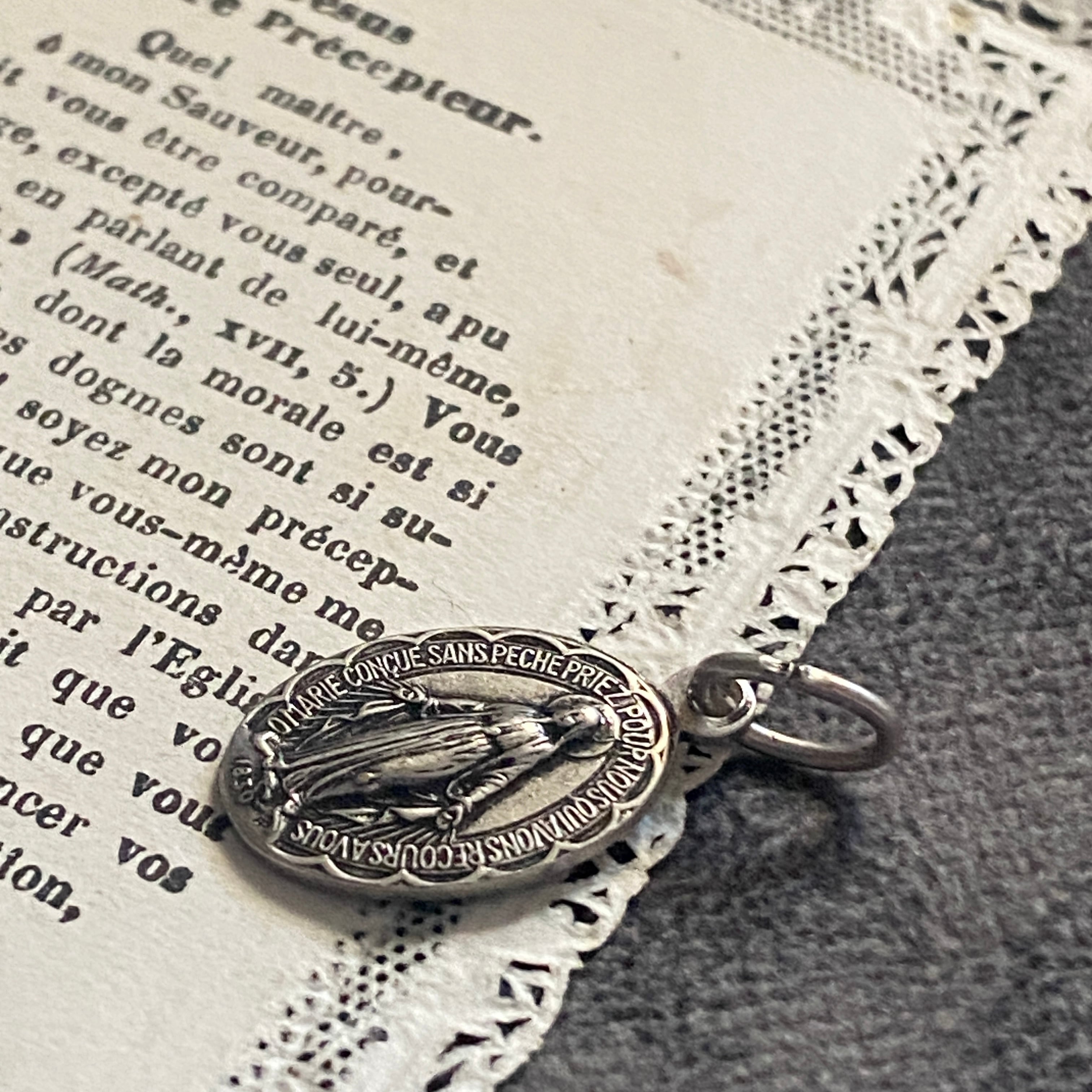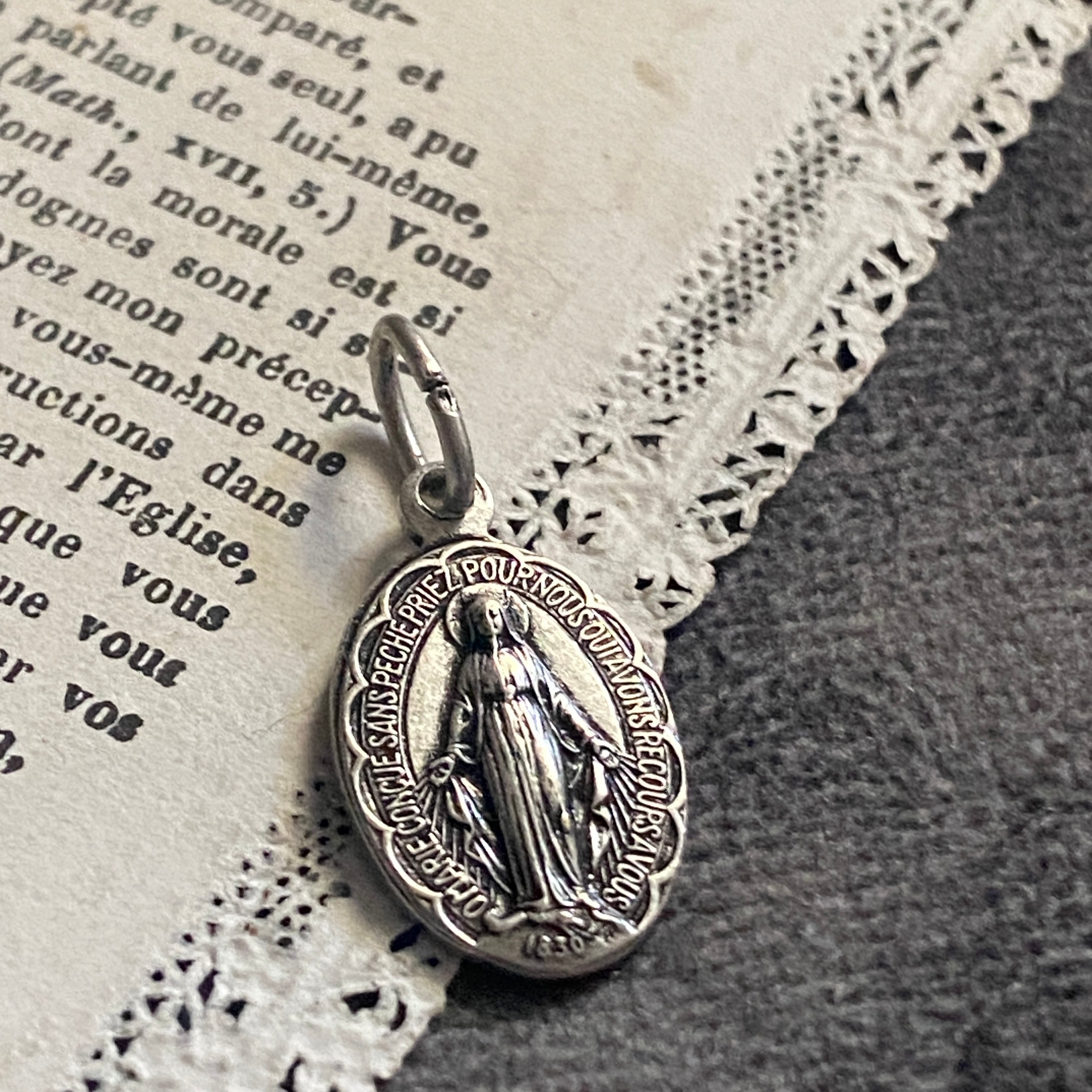 その祈りの象徴であるマリアさまのお姿が、わずか1.6cmほどの小さな銀色の楕円に、精緻なレリーフとして刻まれています。