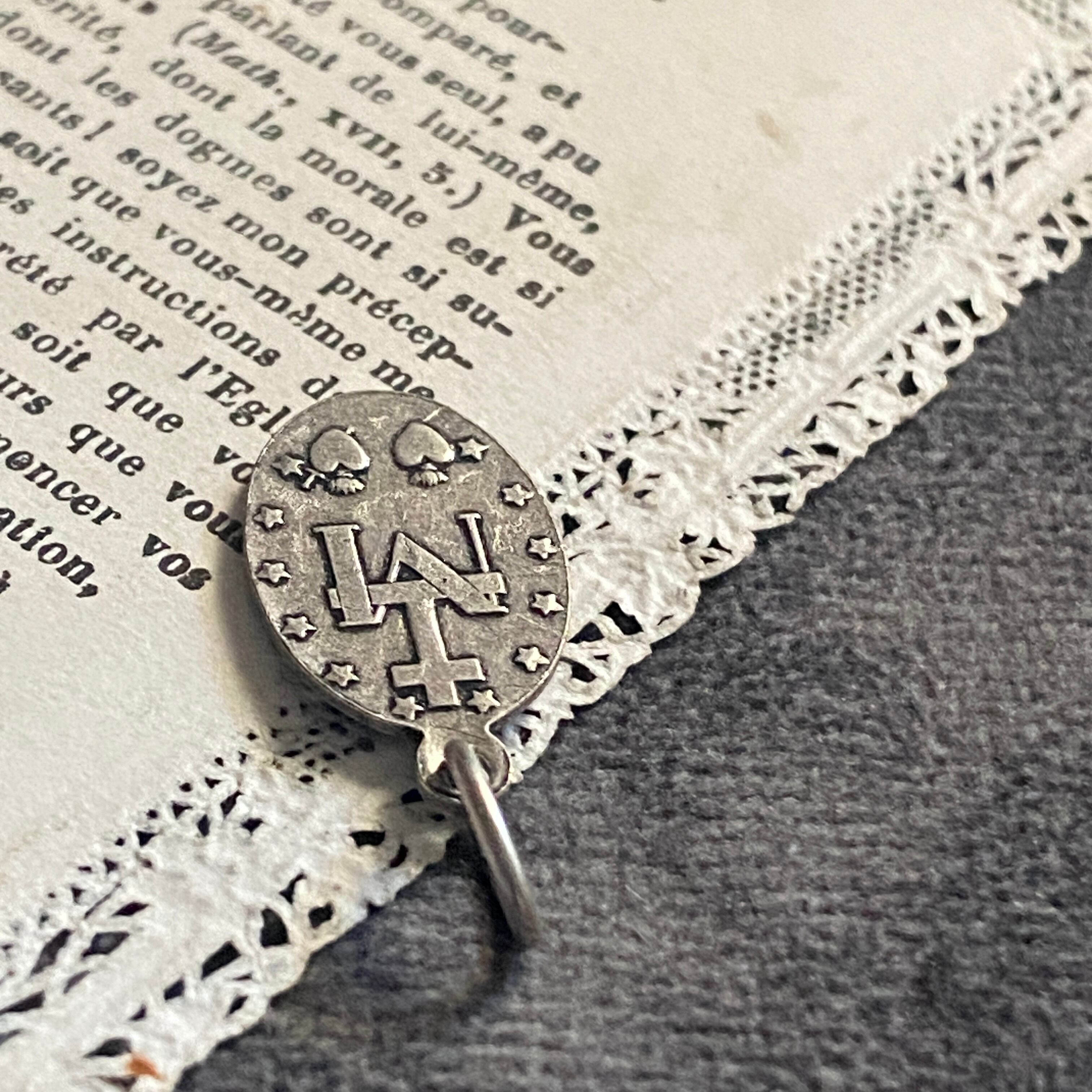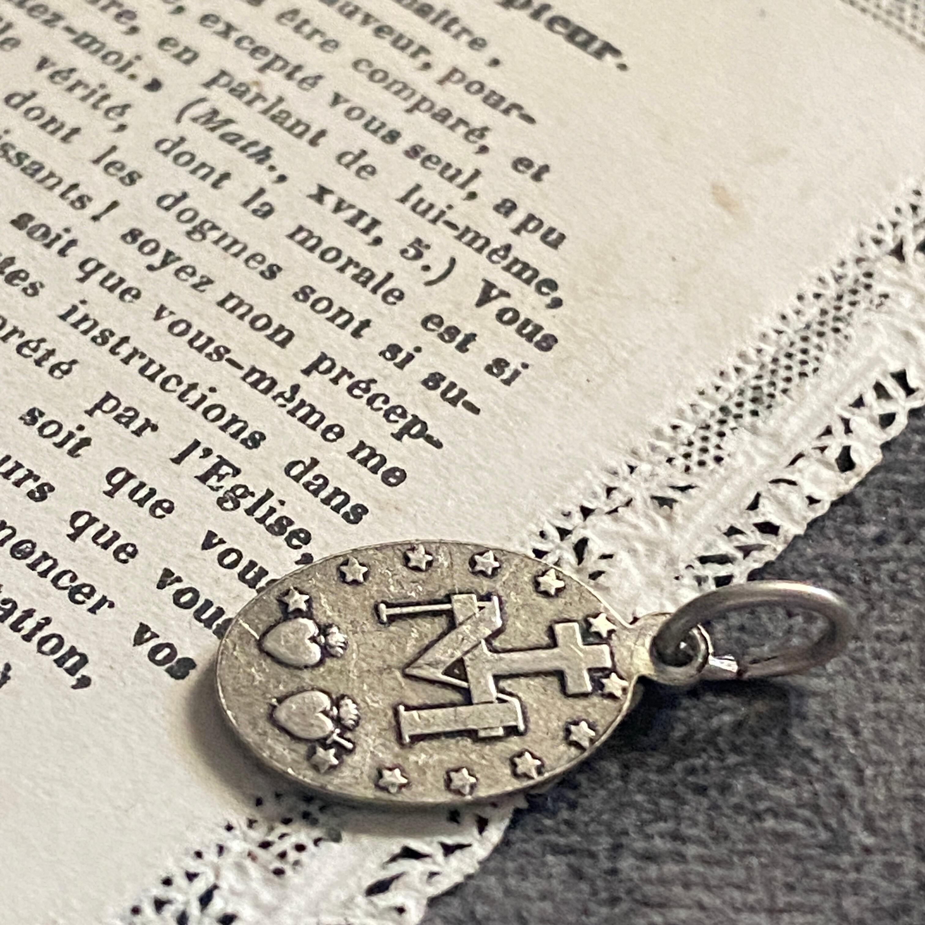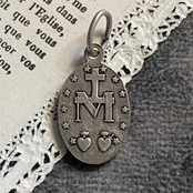背面には、聖母マリアを象徴する「M」と十字架、そして二つの聖心のモチーフ。信仰と愛のシンボルが、日々に静かな祝福をそっと届けてくれるようです。