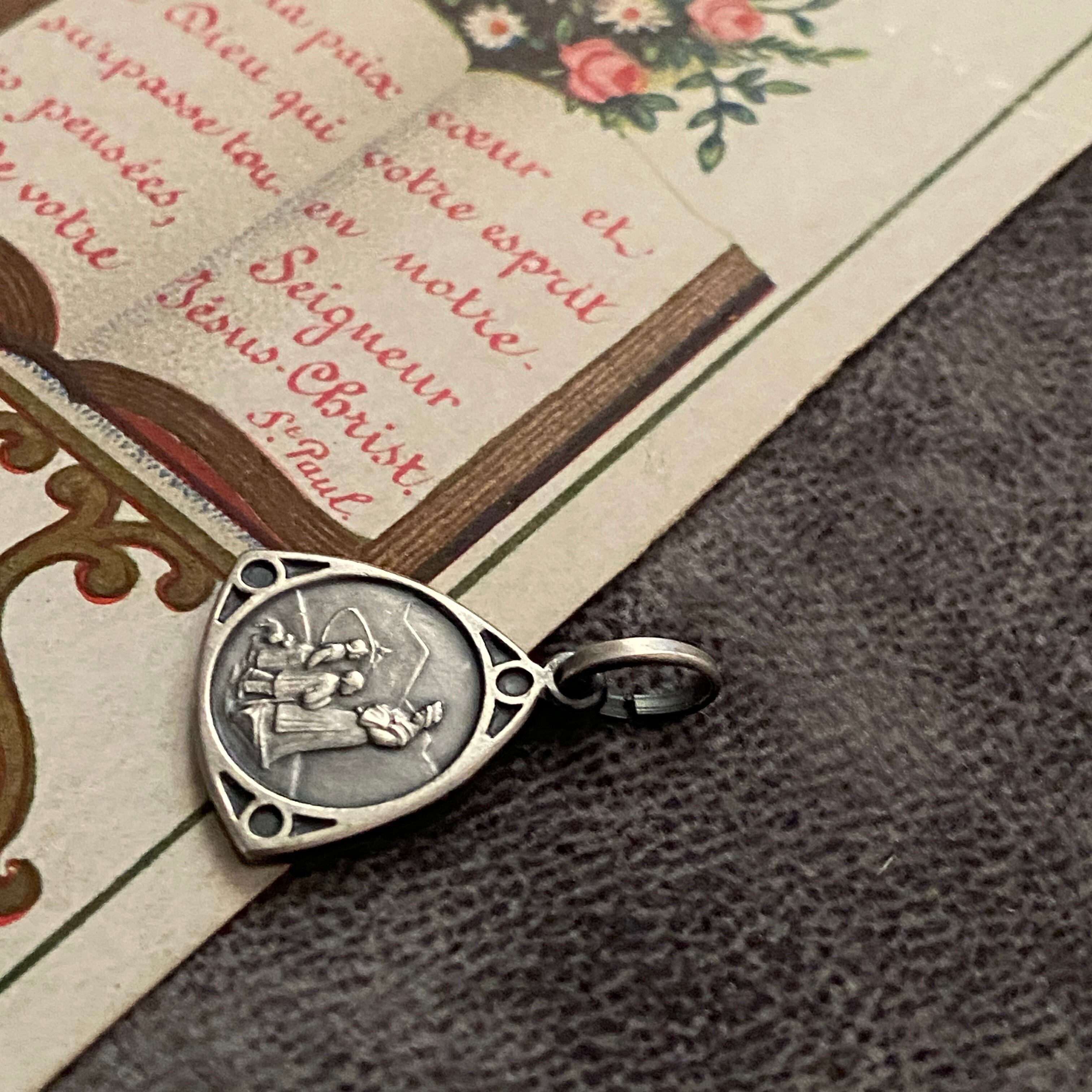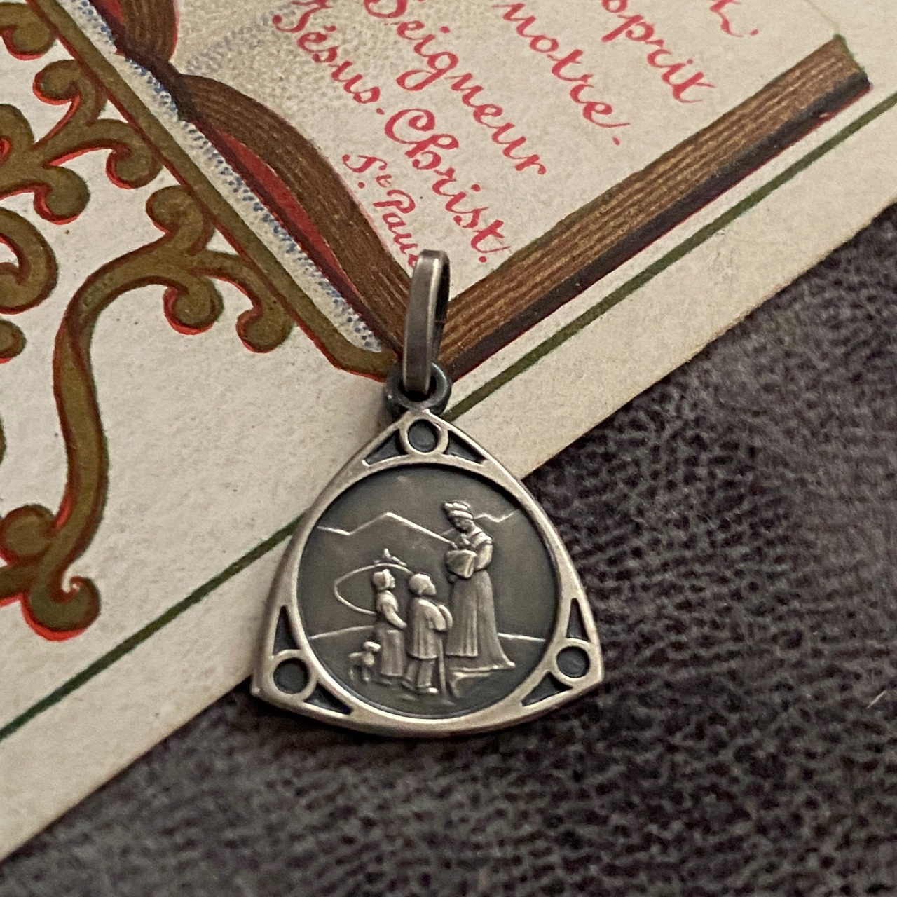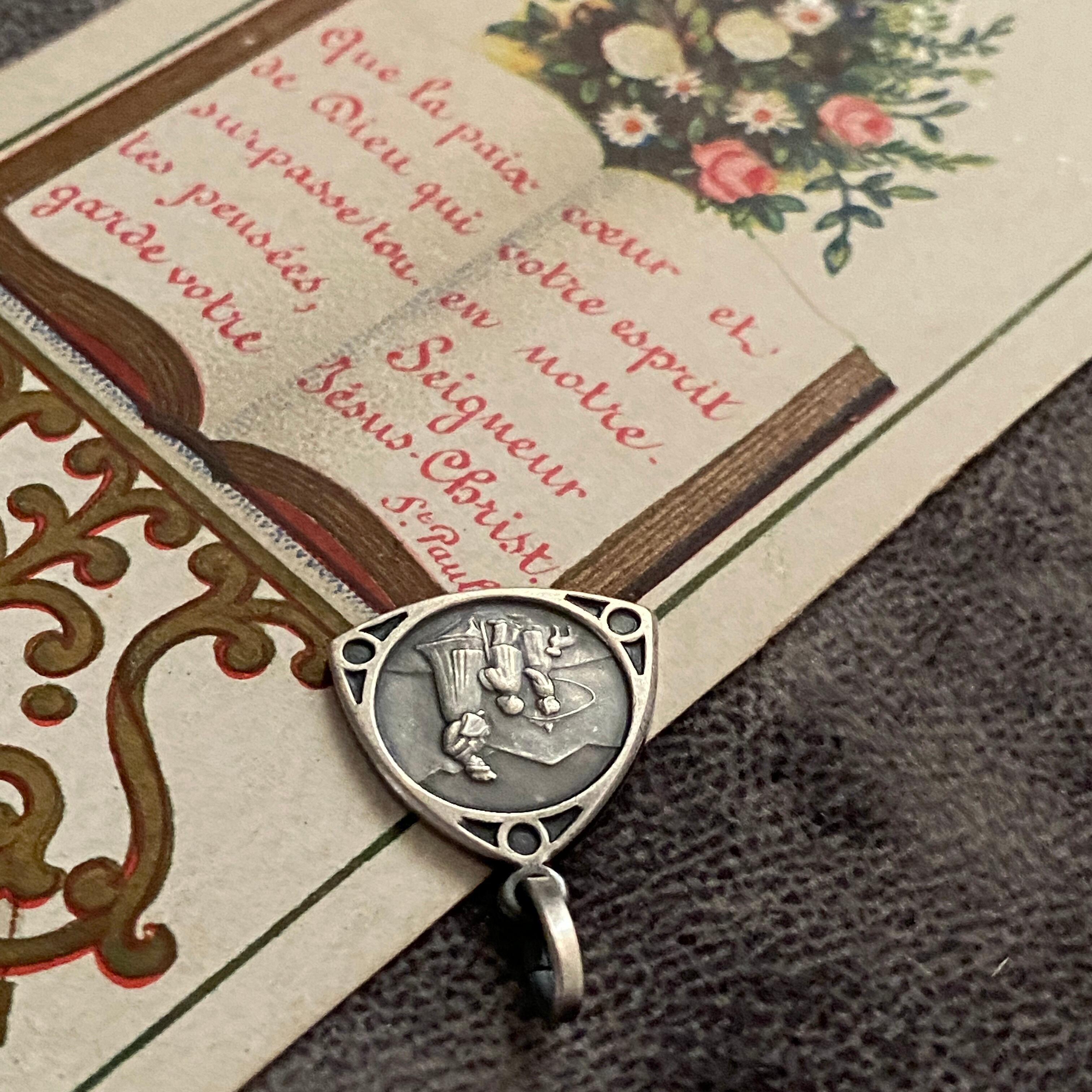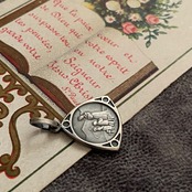 1846年9月19日、フランスのラ・サレット (La Salette) にて、牛飼いの少女メラニー・カルヴァと11歳の牛飼いの少年マクシマン・ジローの2人の子供が報告した聖母の御出現のシーンのメダイです。