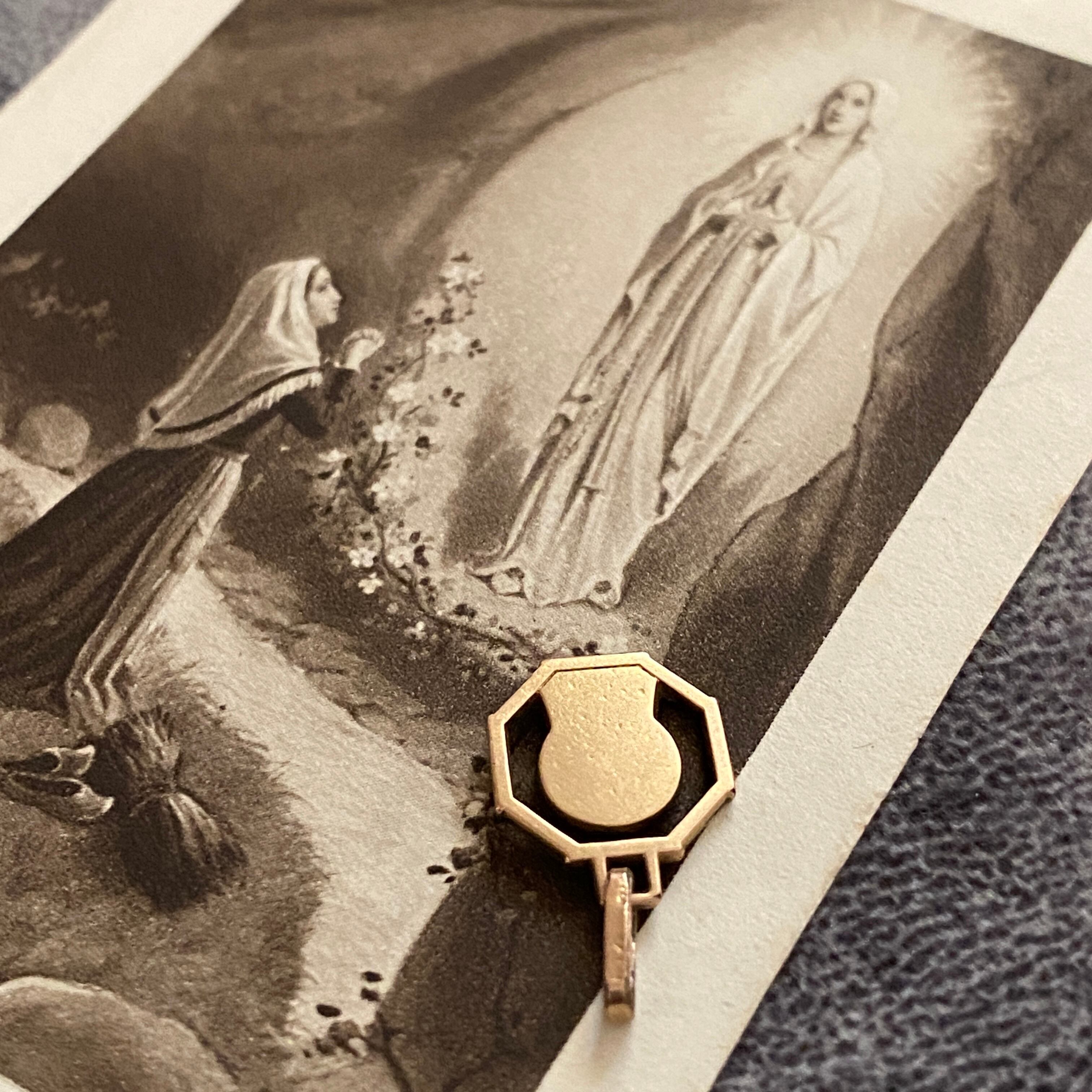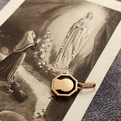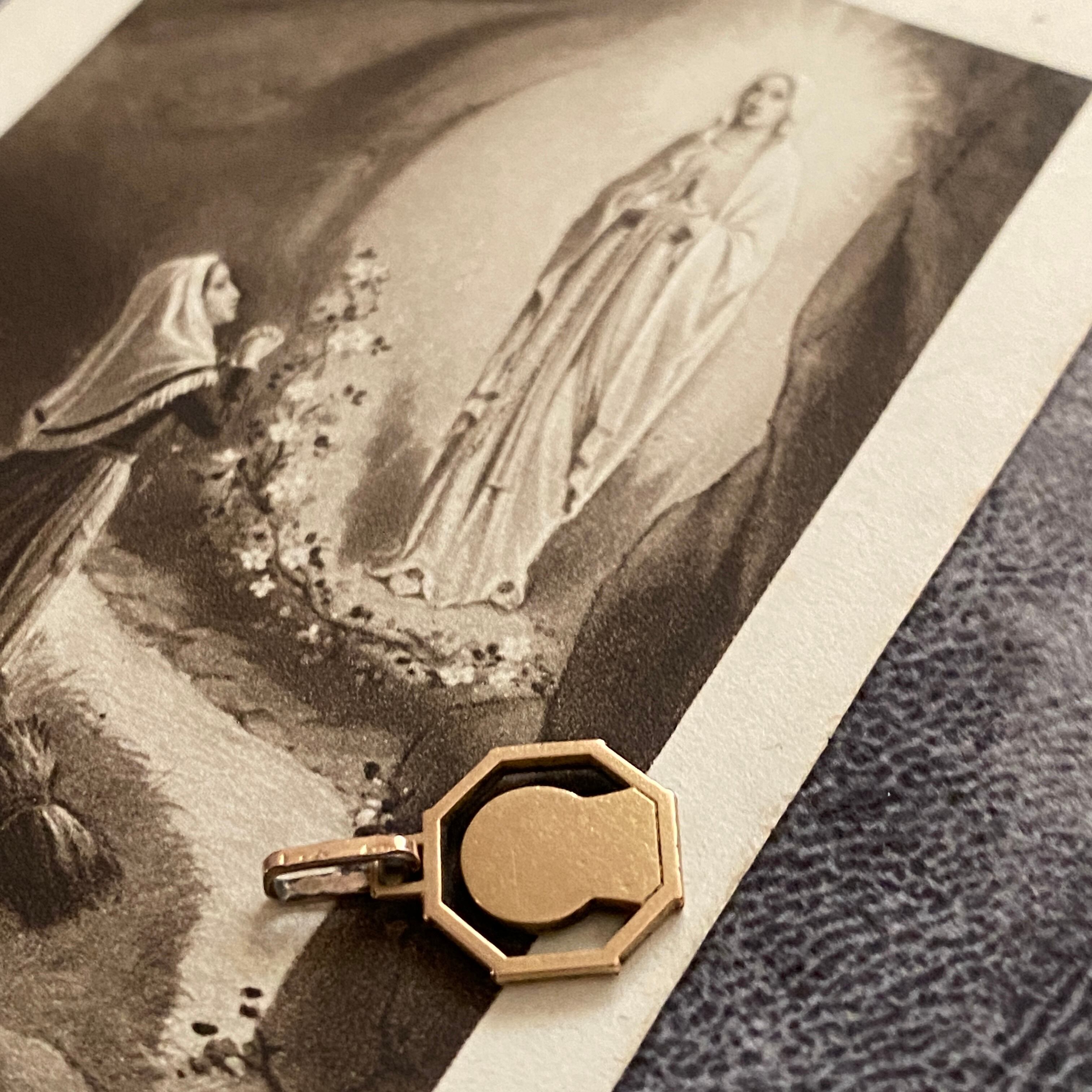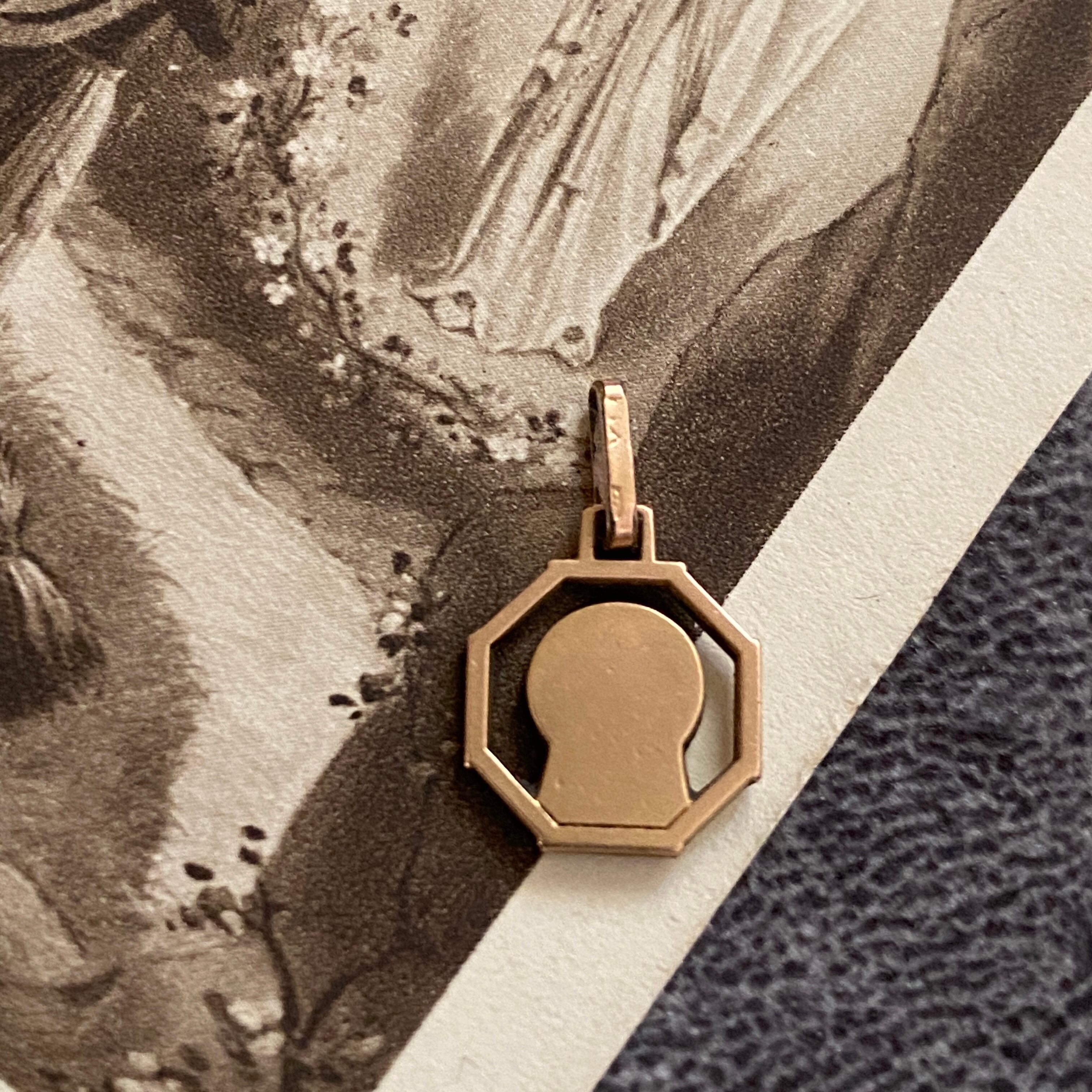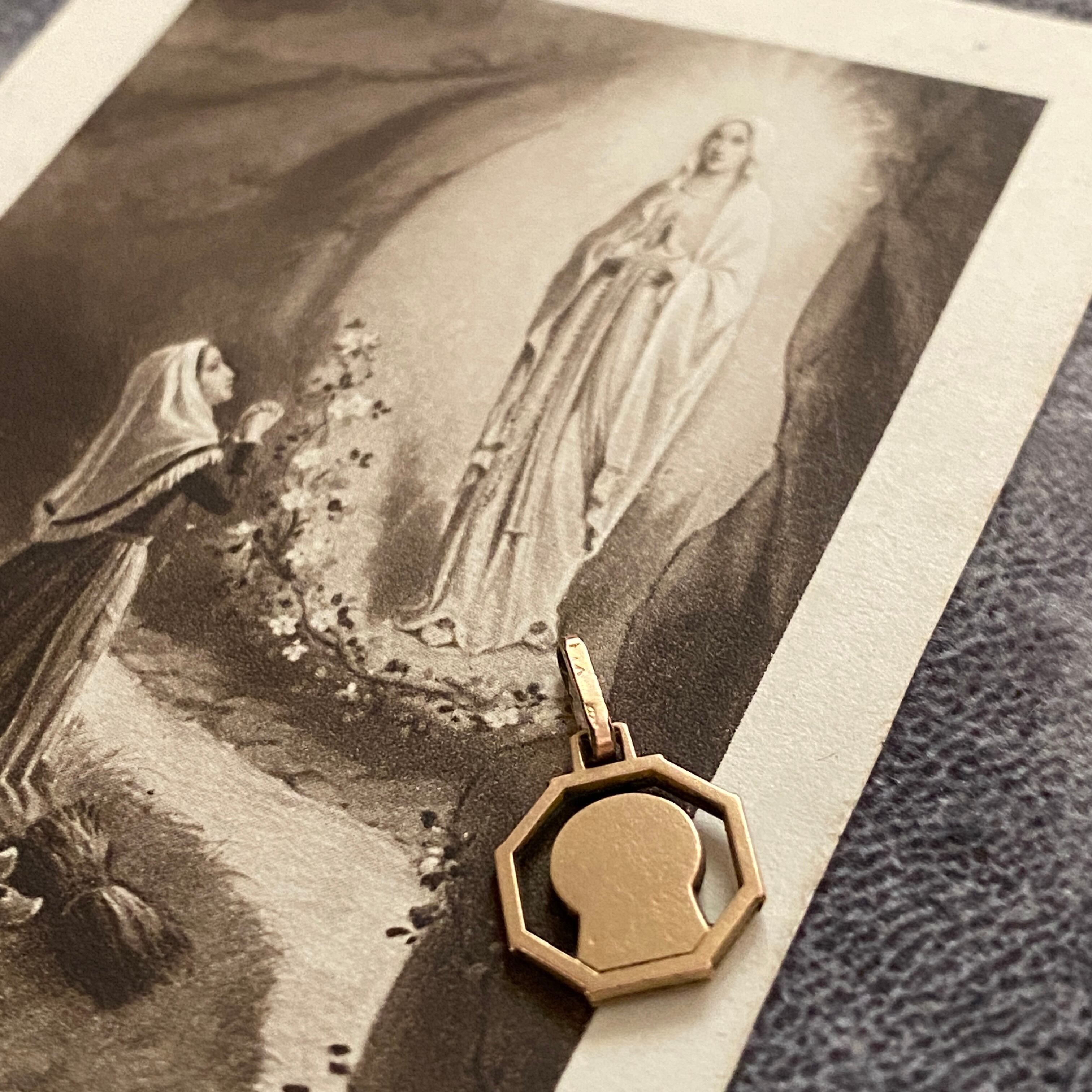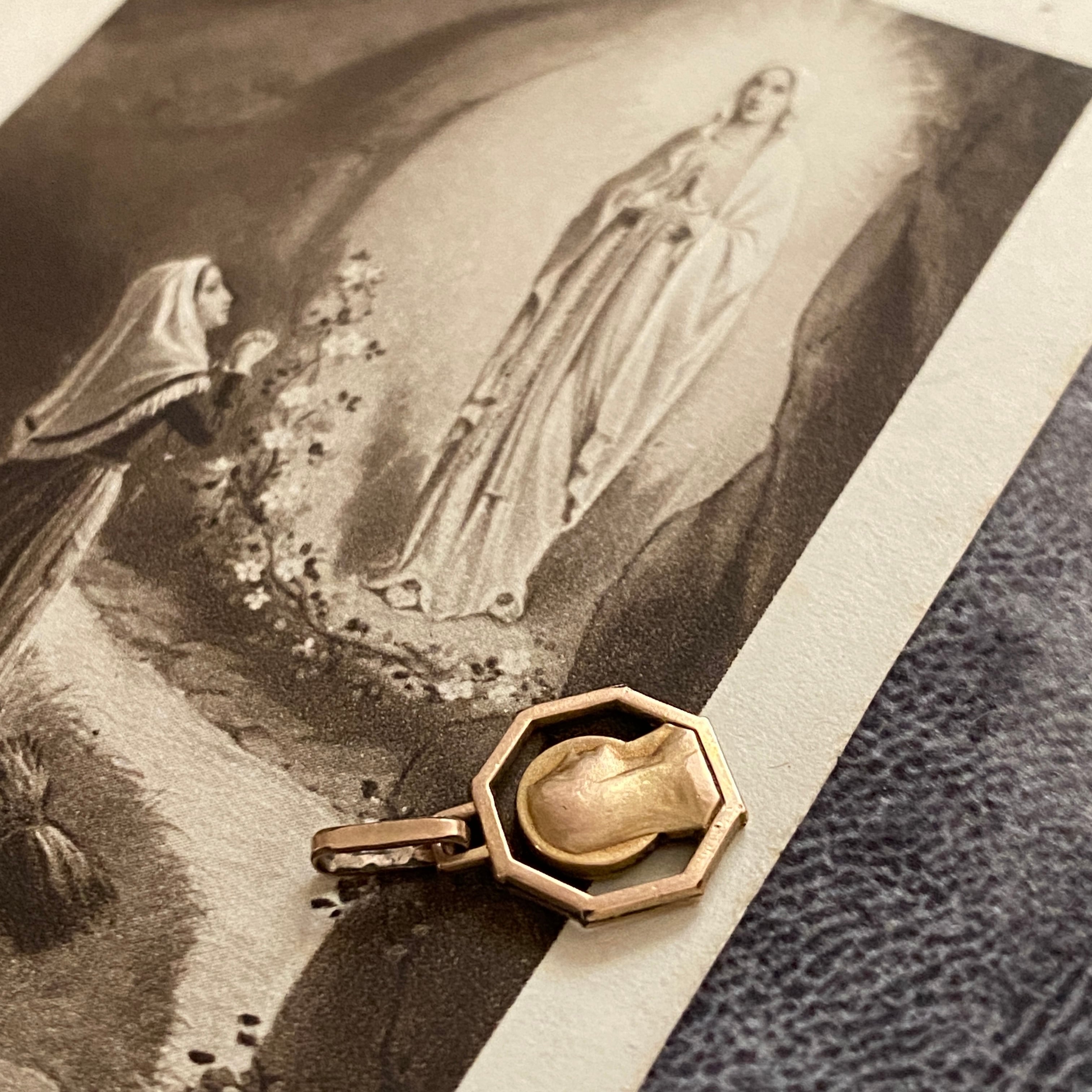 八角形(オクトゴナル)のフレームに、横顔で祈るマリアさまを描いた極小サイズのメダイ。
