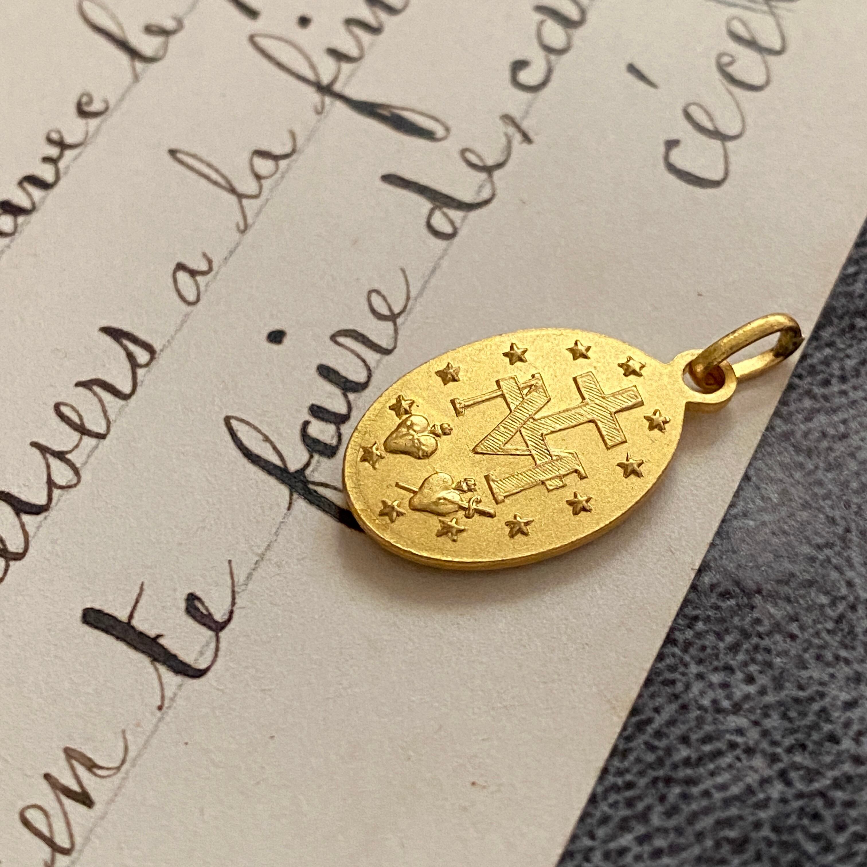 背面には十字架と「M」、そしてイエスとマリアの御心が刻まれ、信仰の核心を映す普遍的なデザインとなっています。