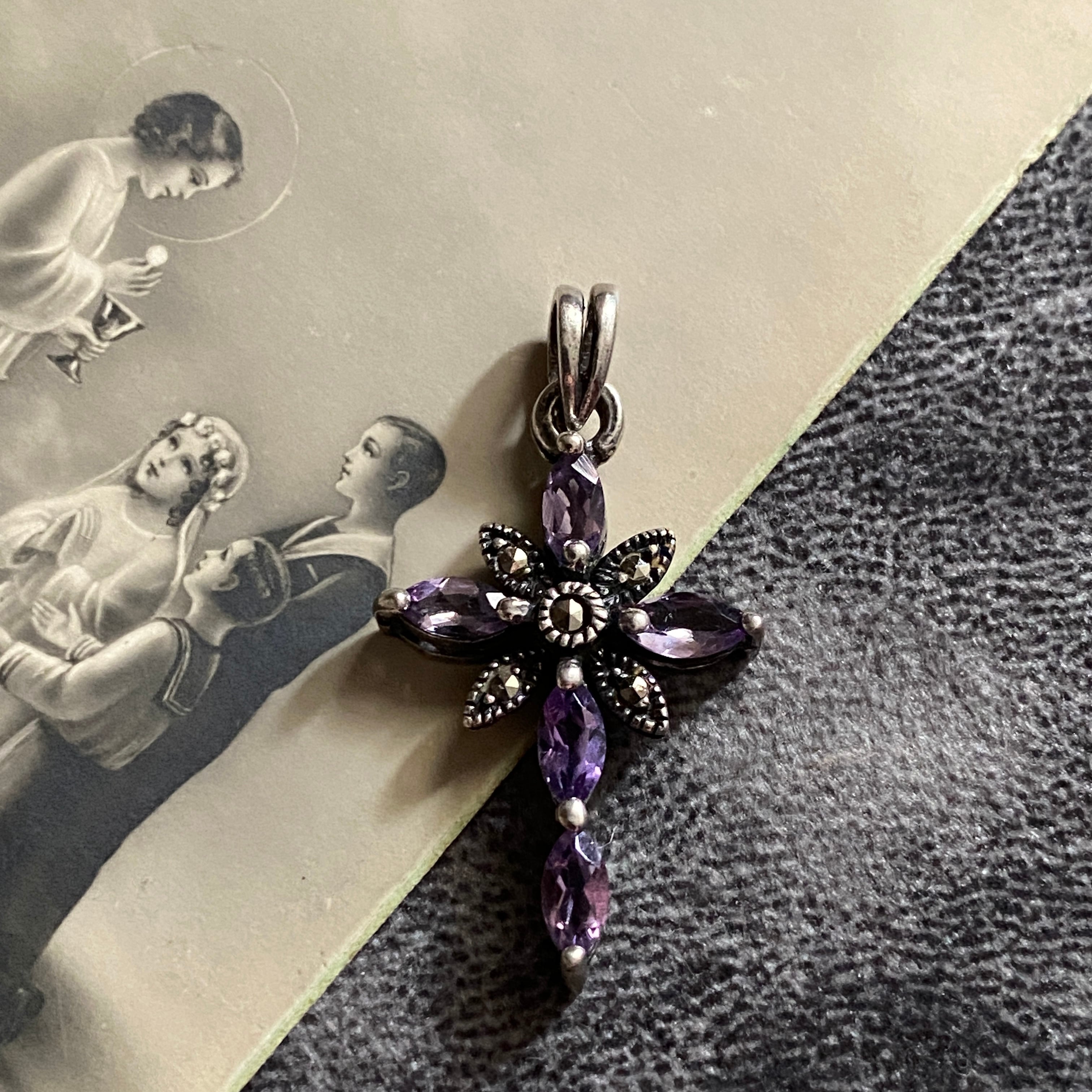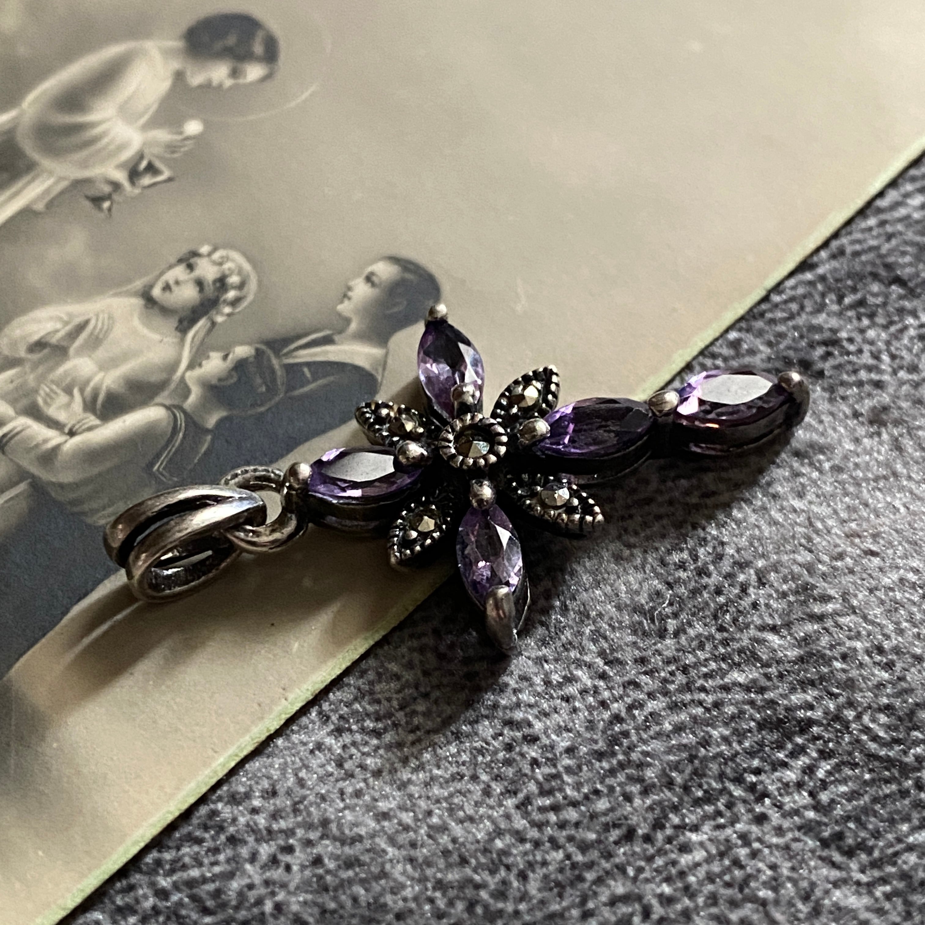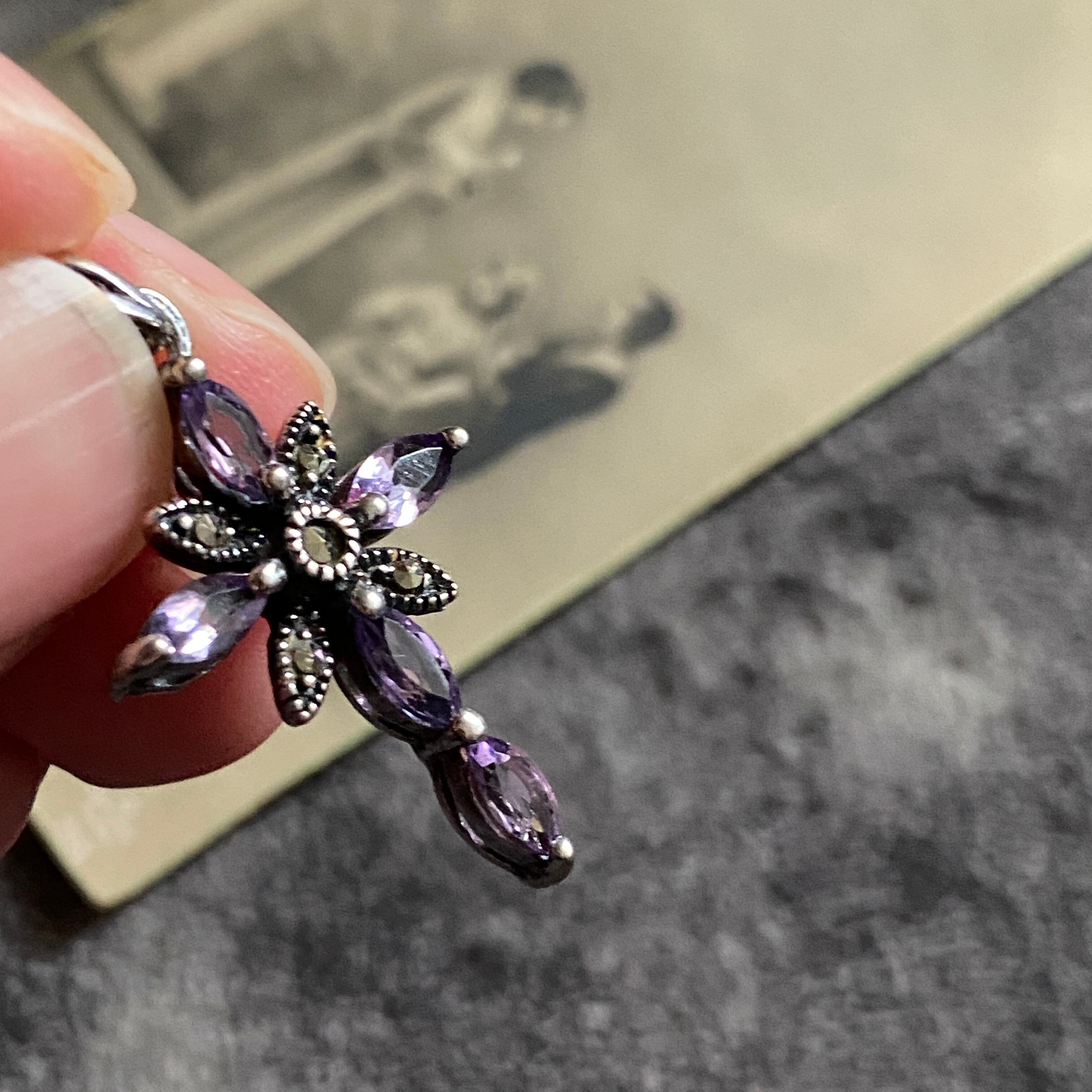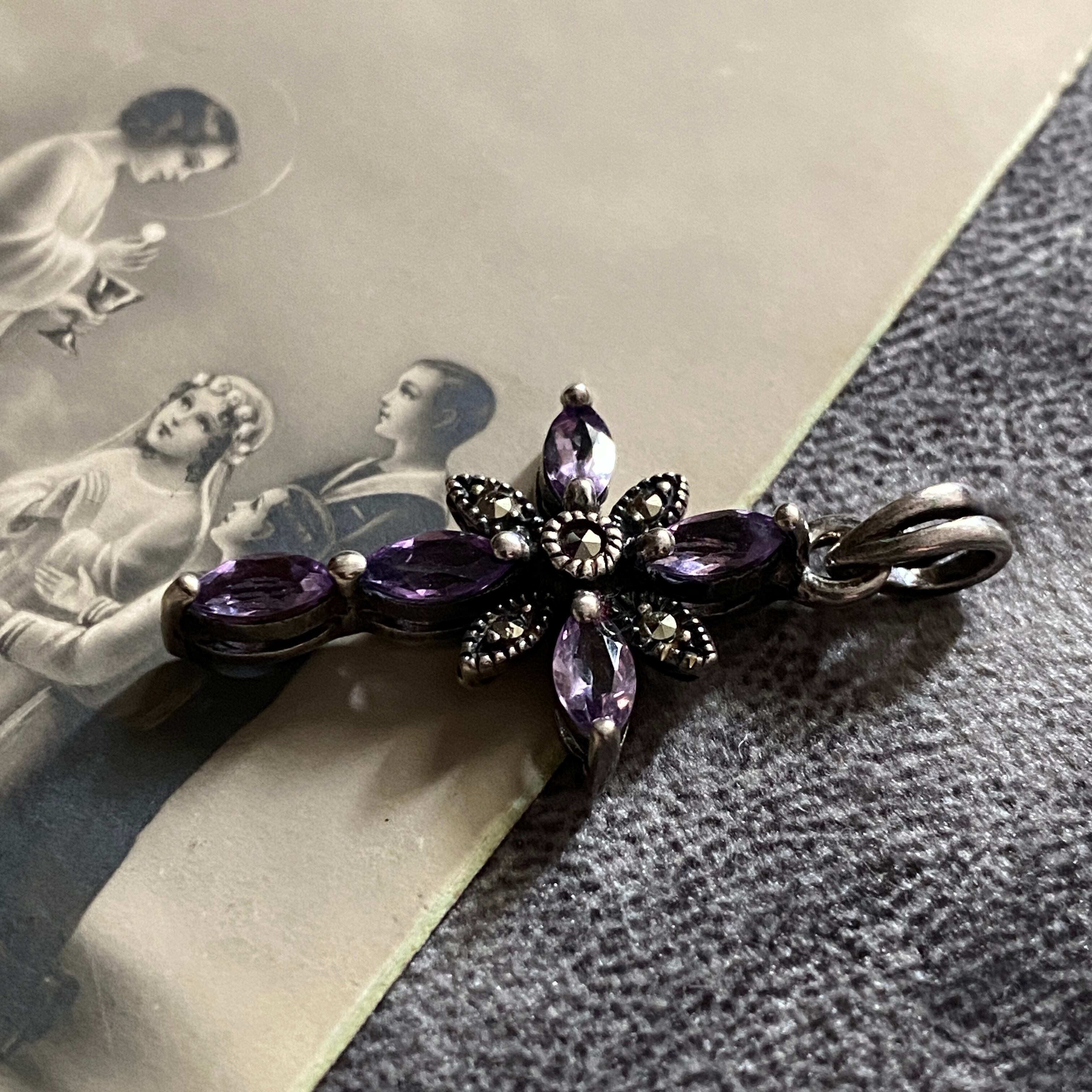 美しい紫が優しく光を返すアメジストに、銀色の輝きを放つマーカサイトを組み合わせた