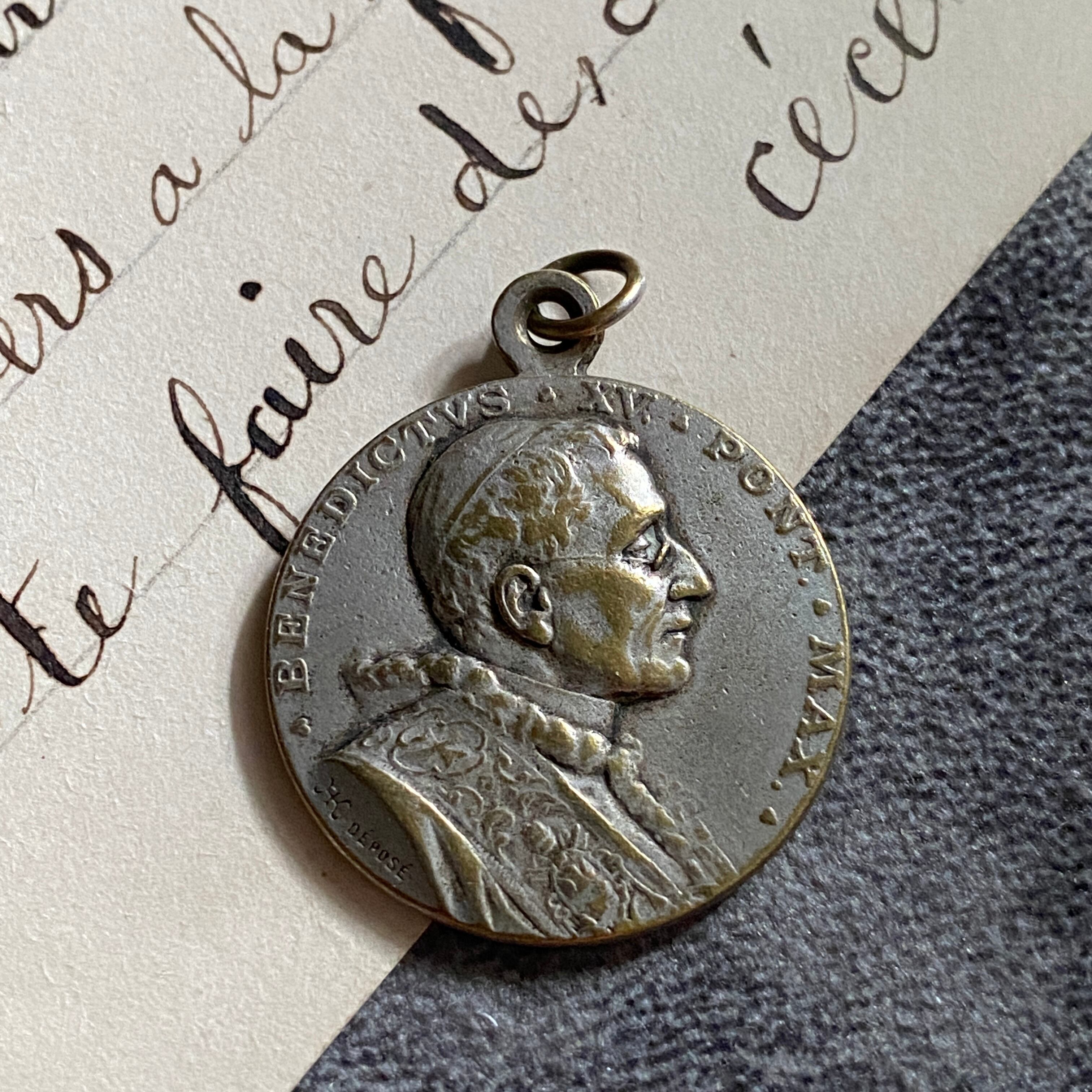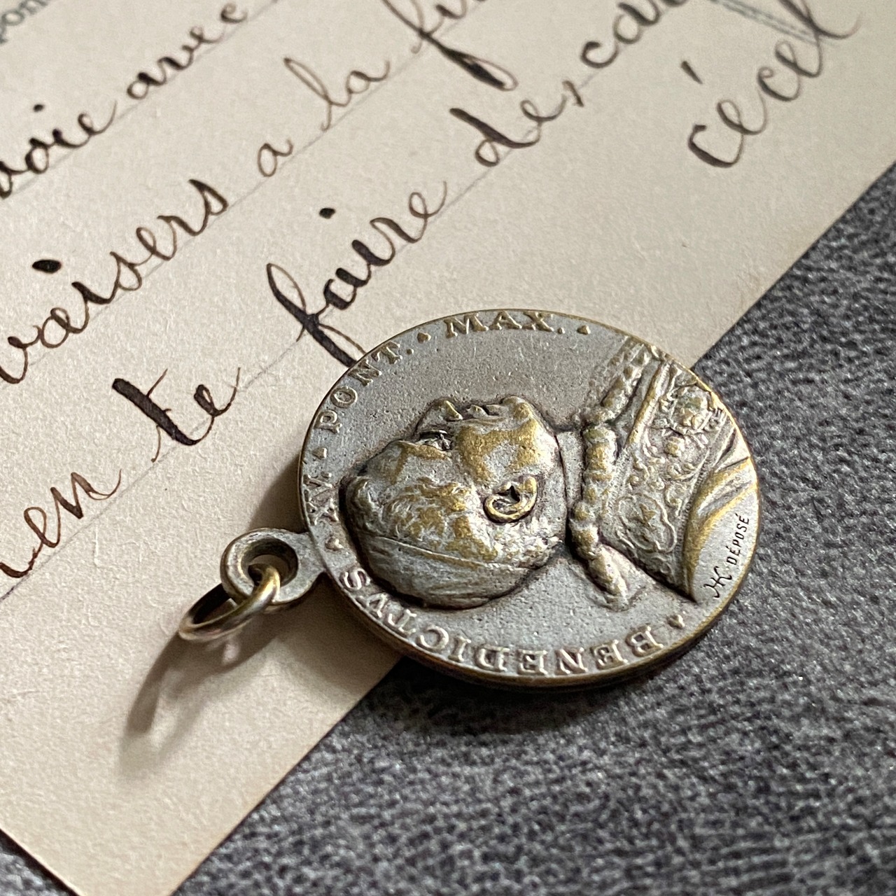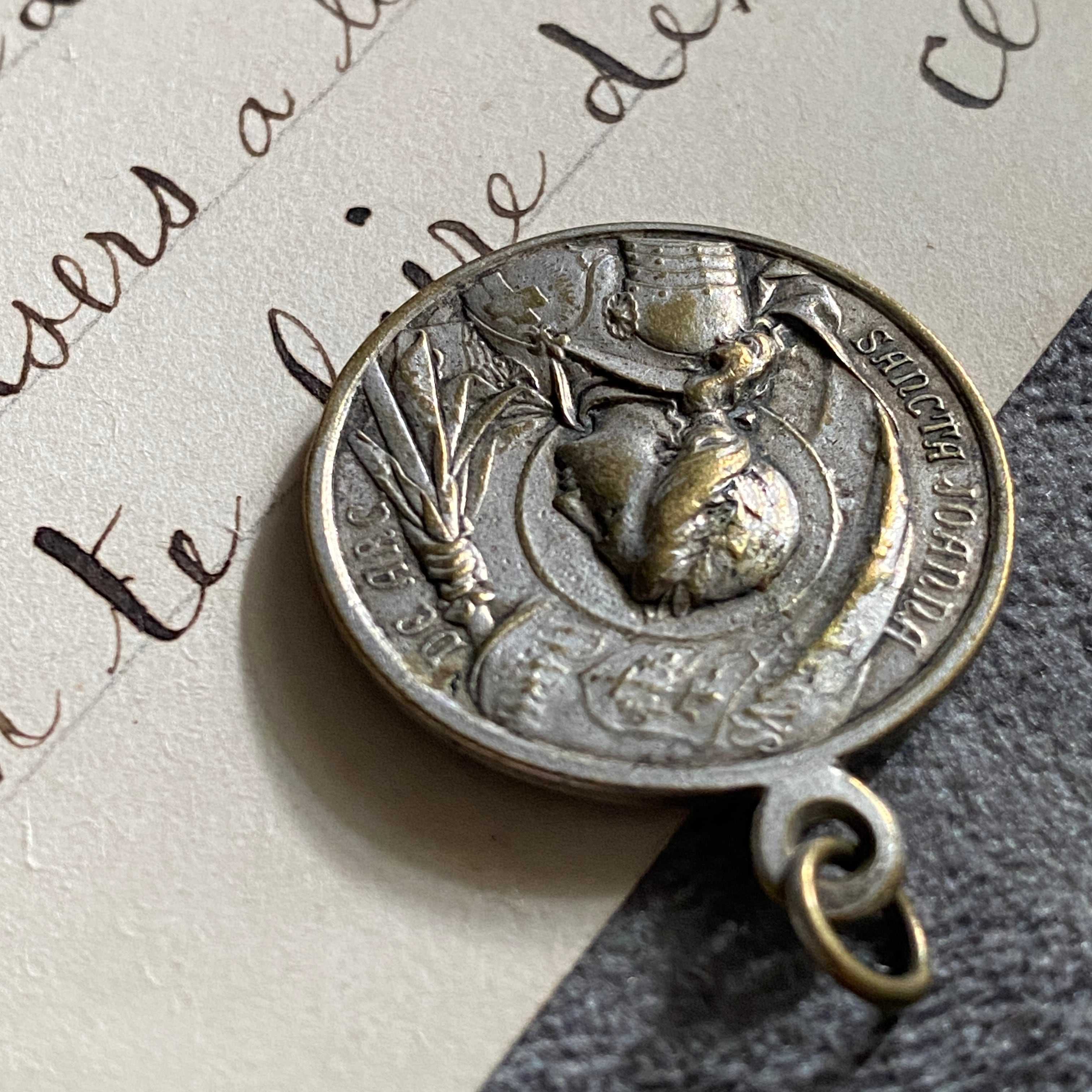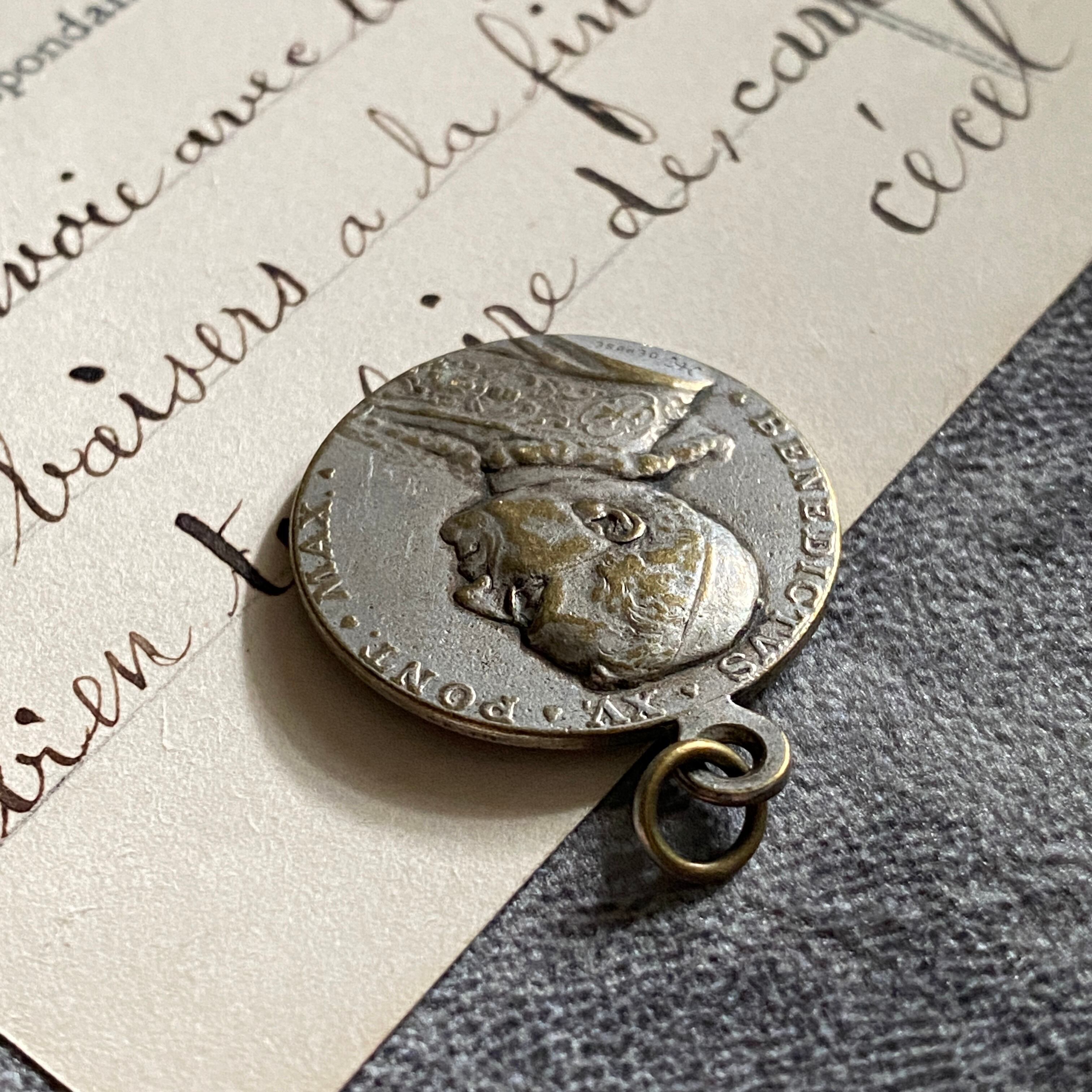 ジャンヌ・ダルクの力強い横顔と、背面には当時のローマ教皇 Benedictus XV が刻まれた、とても珍しいアンティークメダイ。