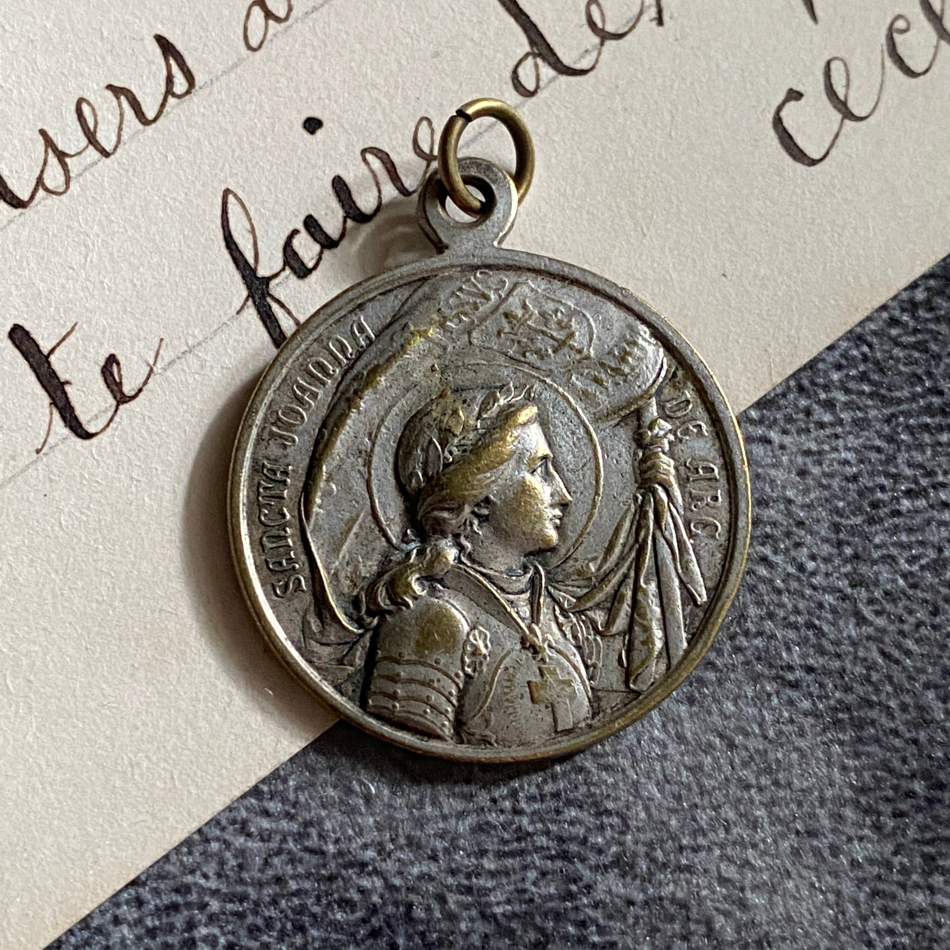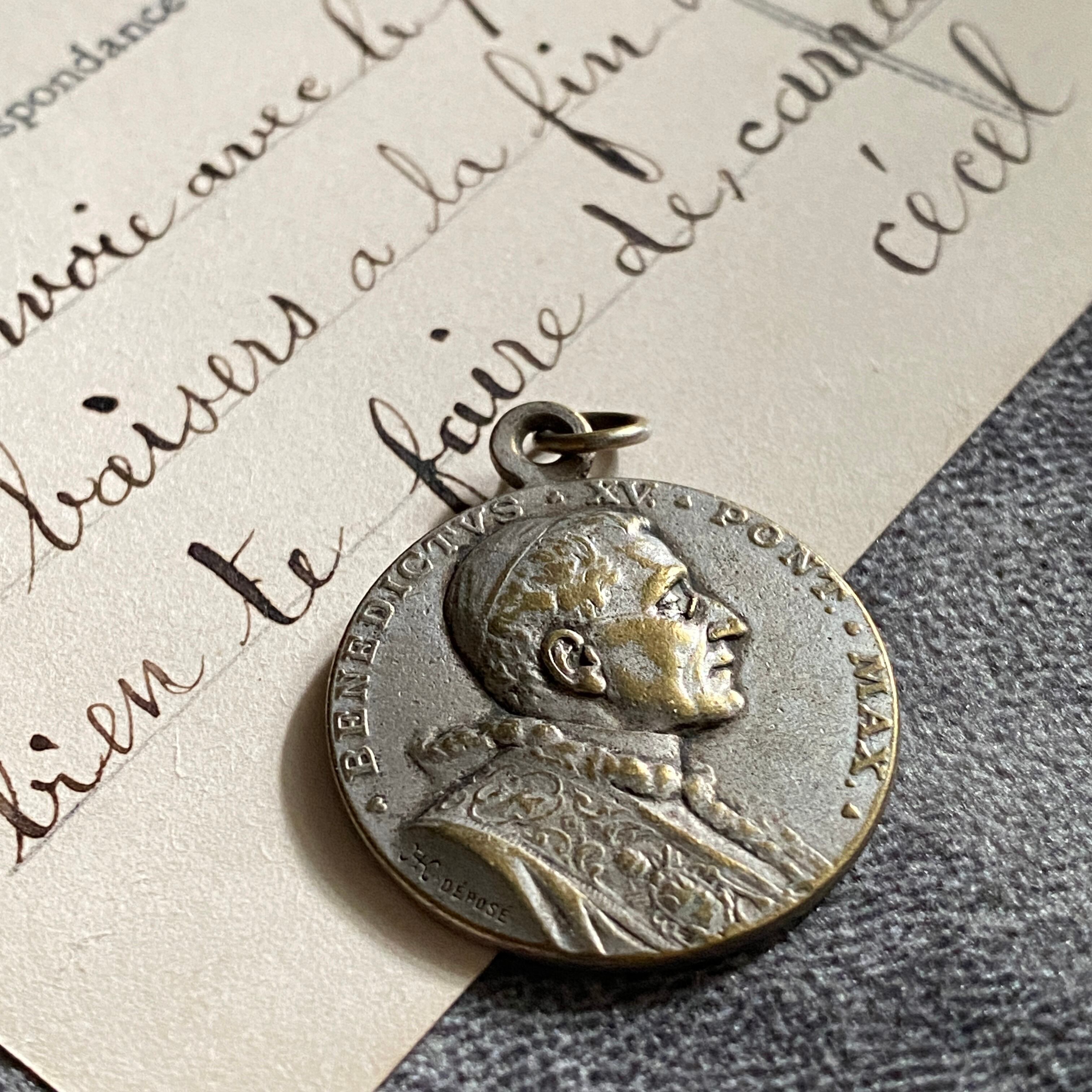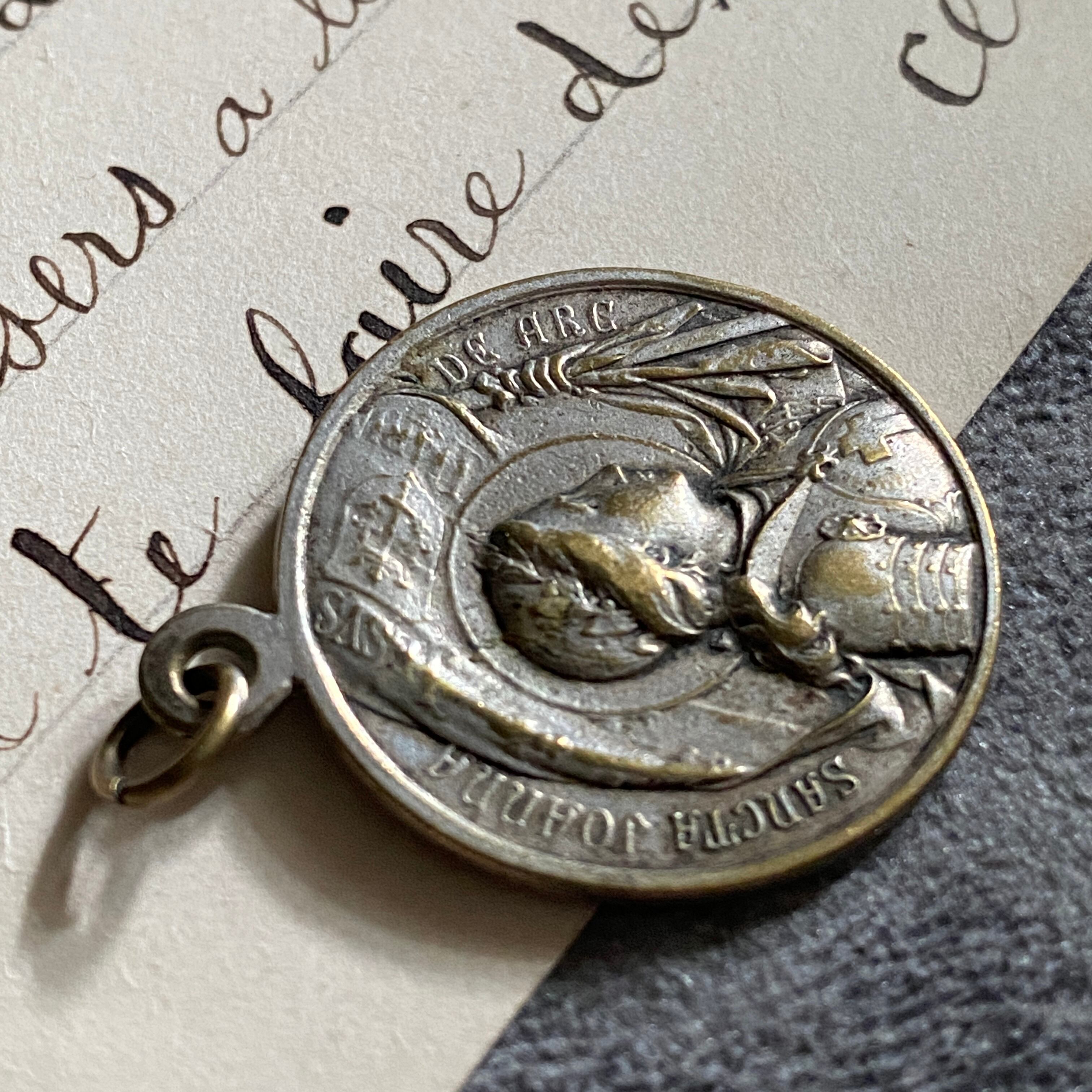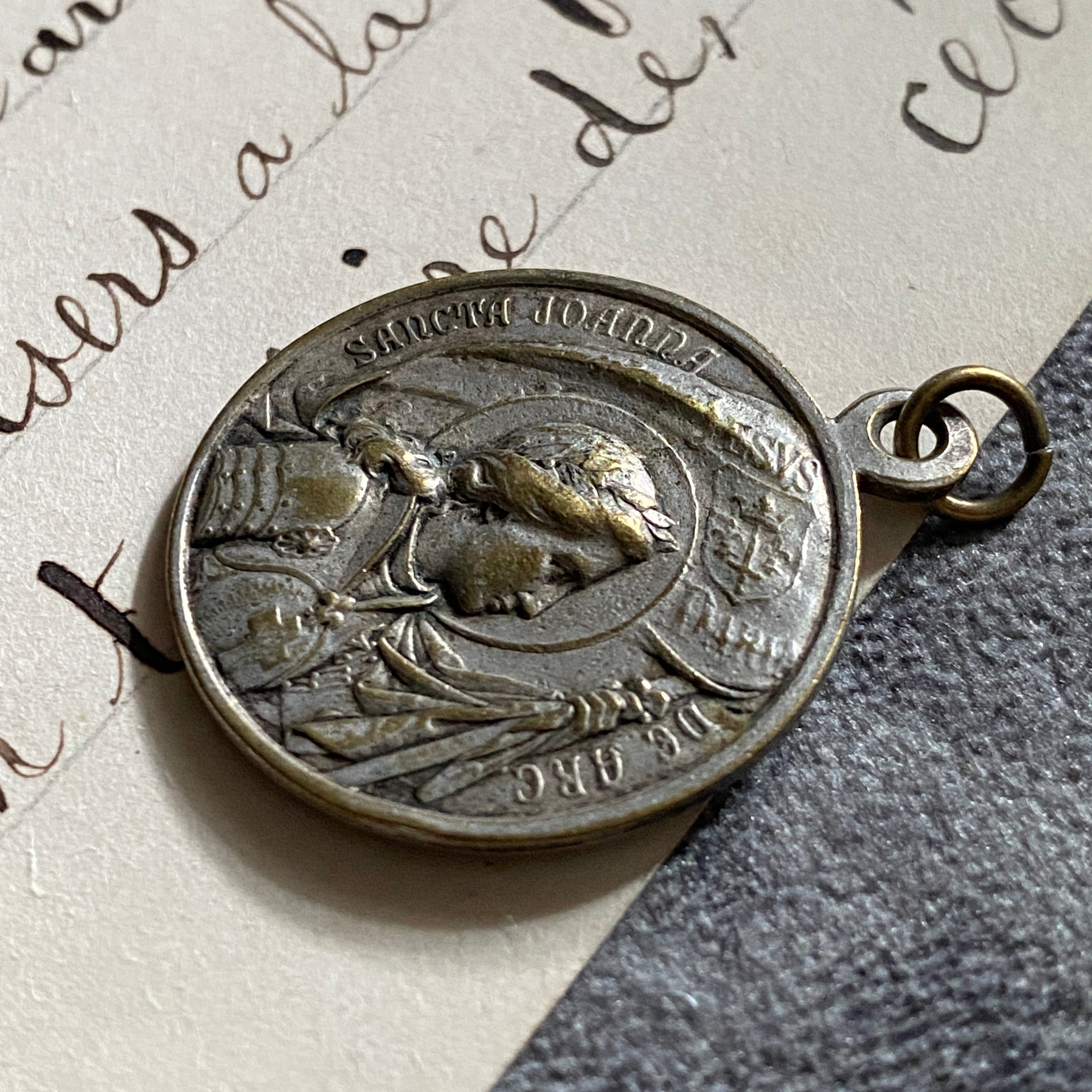 ジャンヌ・ダルクの力強い横顔と、背面には当時のローマ教皇 Benedictus XV が刻まれた、とても珍しいアンティークメダイ。