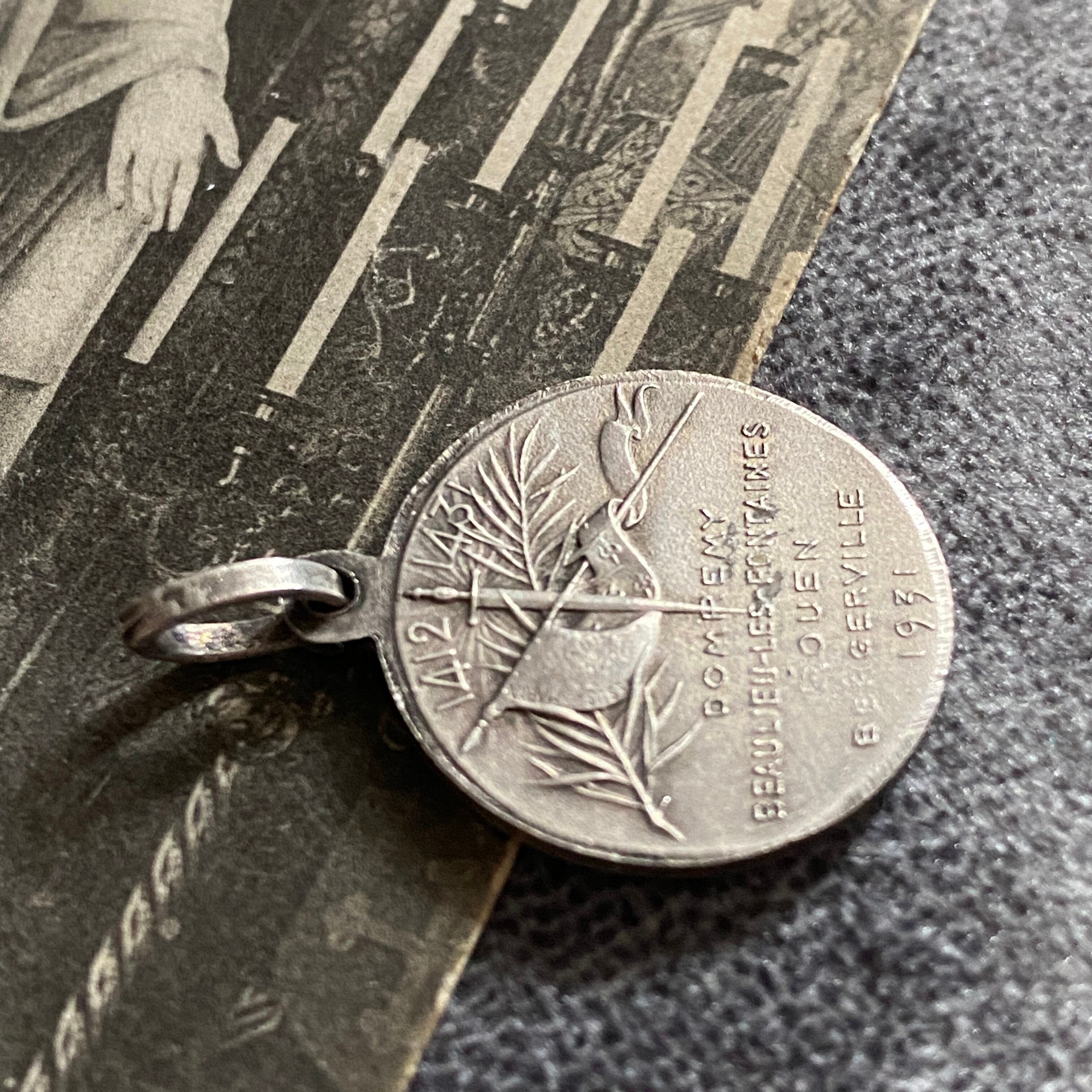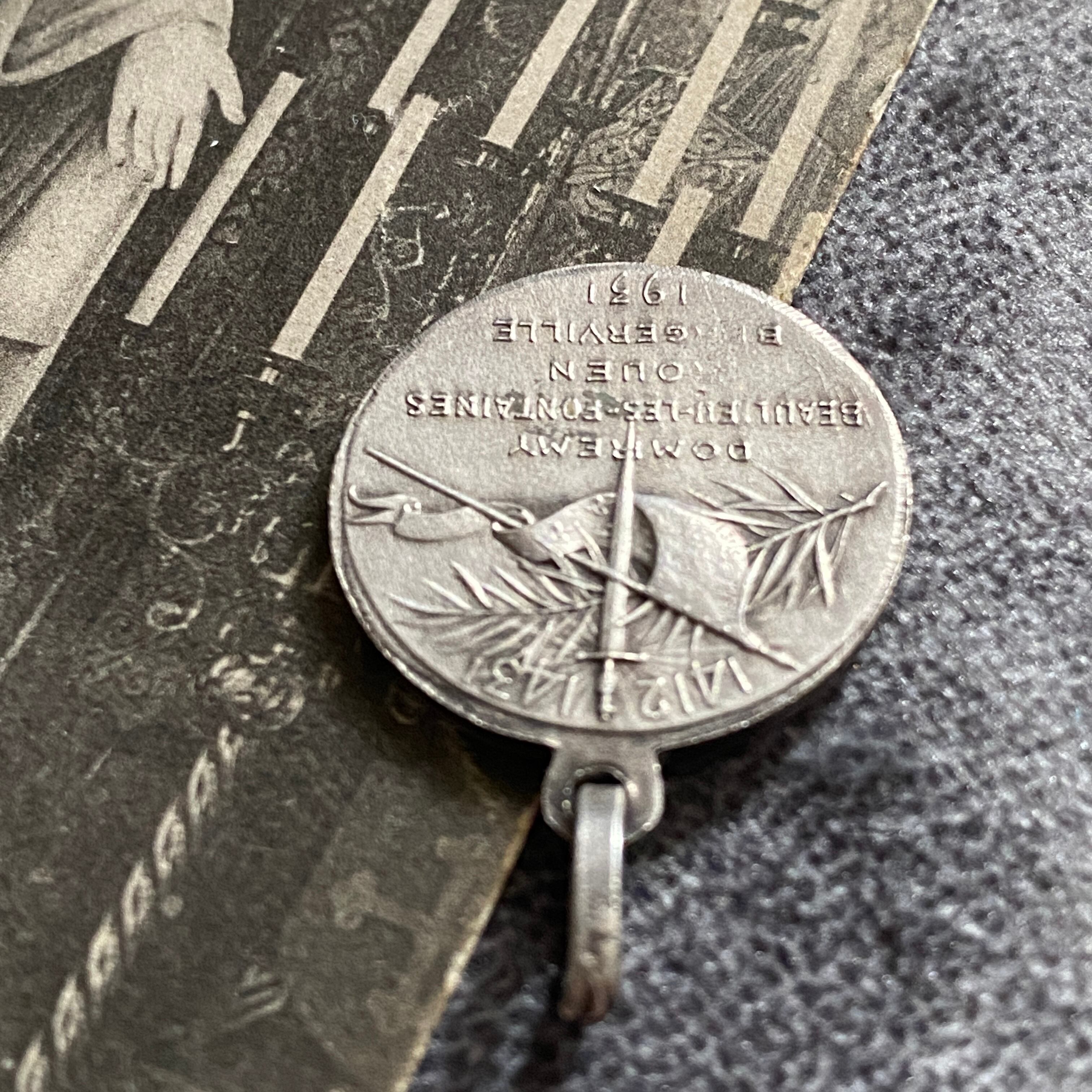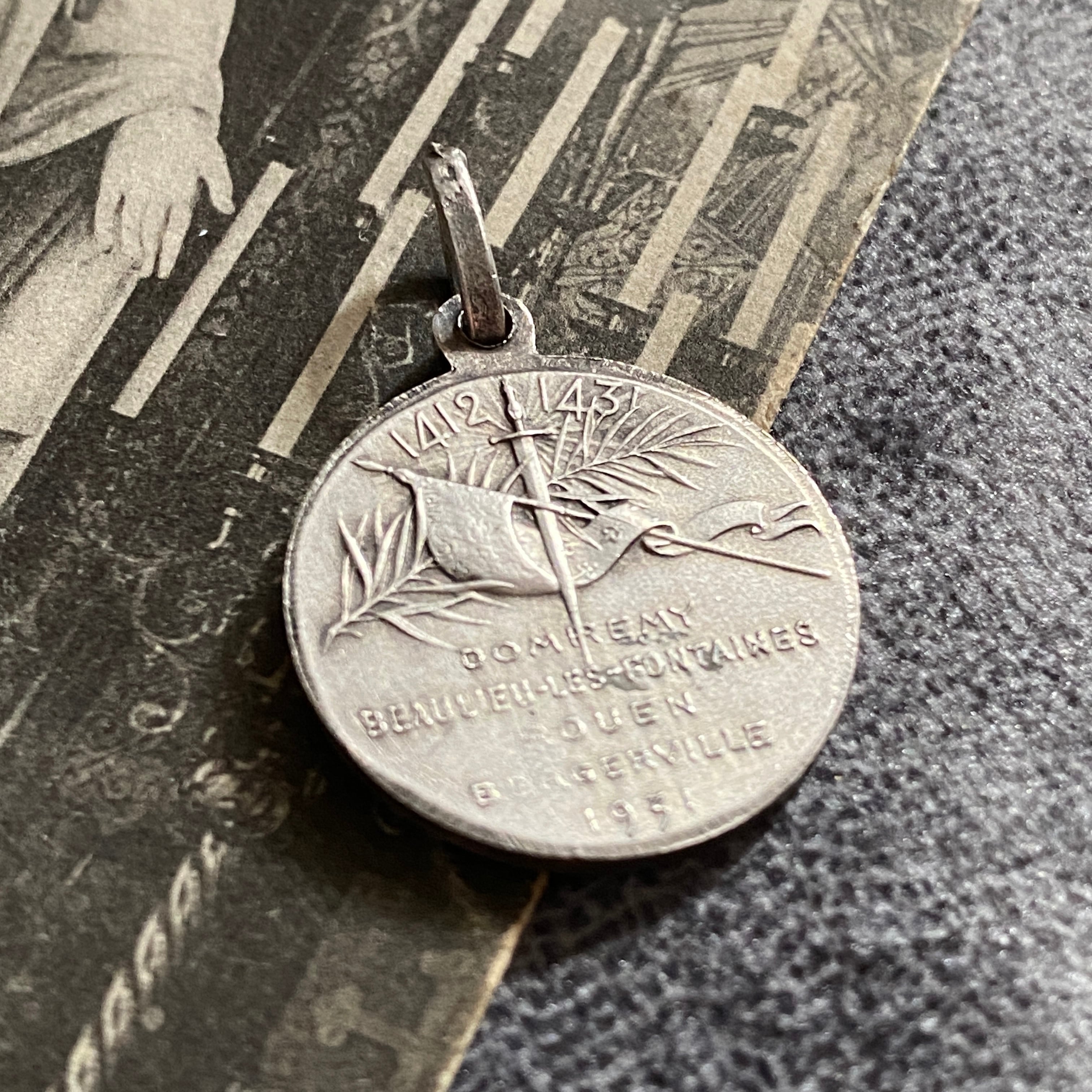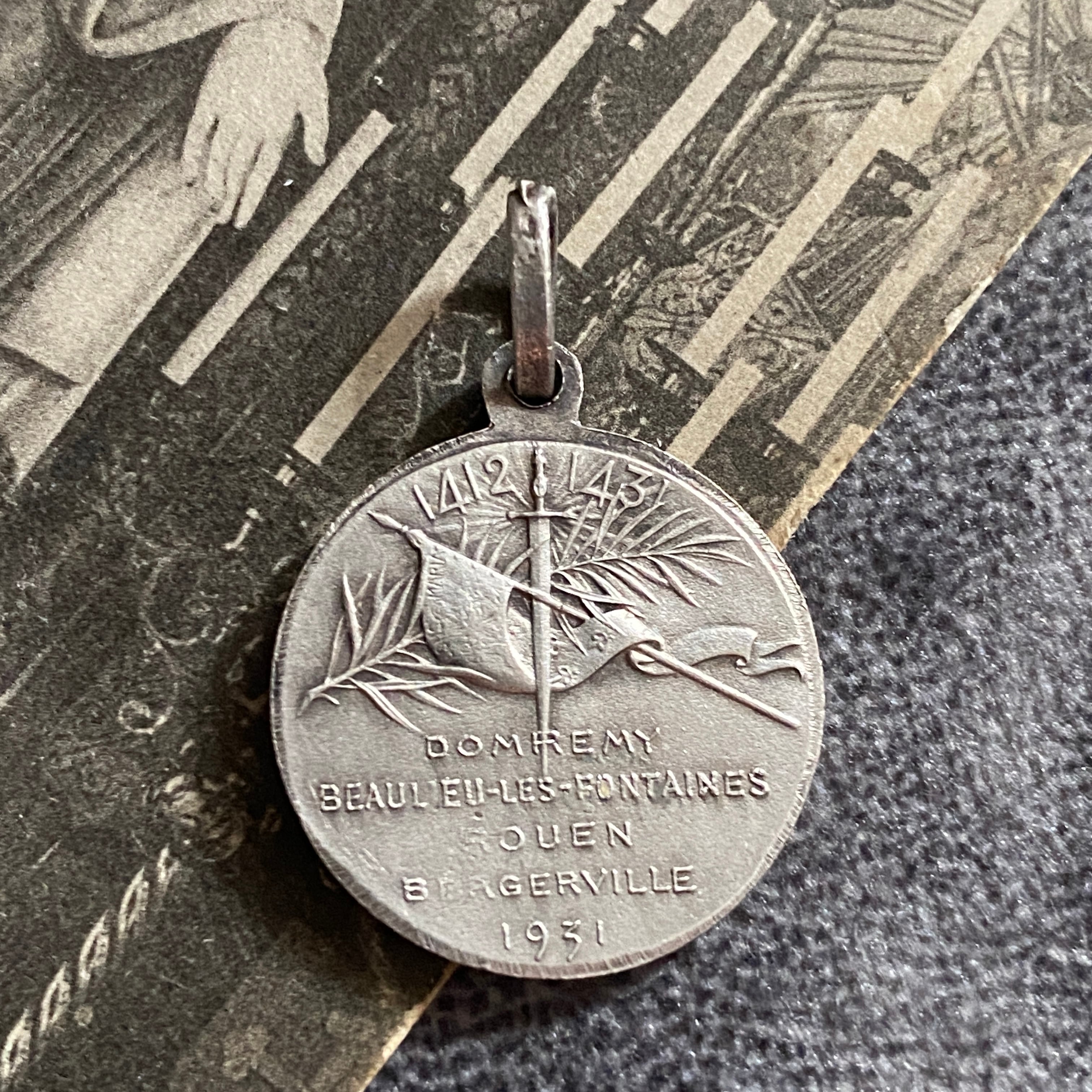 下部の 1931 は、ジャンヌの列聖をきっかけにフランス全土で巡礼・記念祭が行われた年を表し、当時の敬虔な想いがこの小さな世界に息づいています。