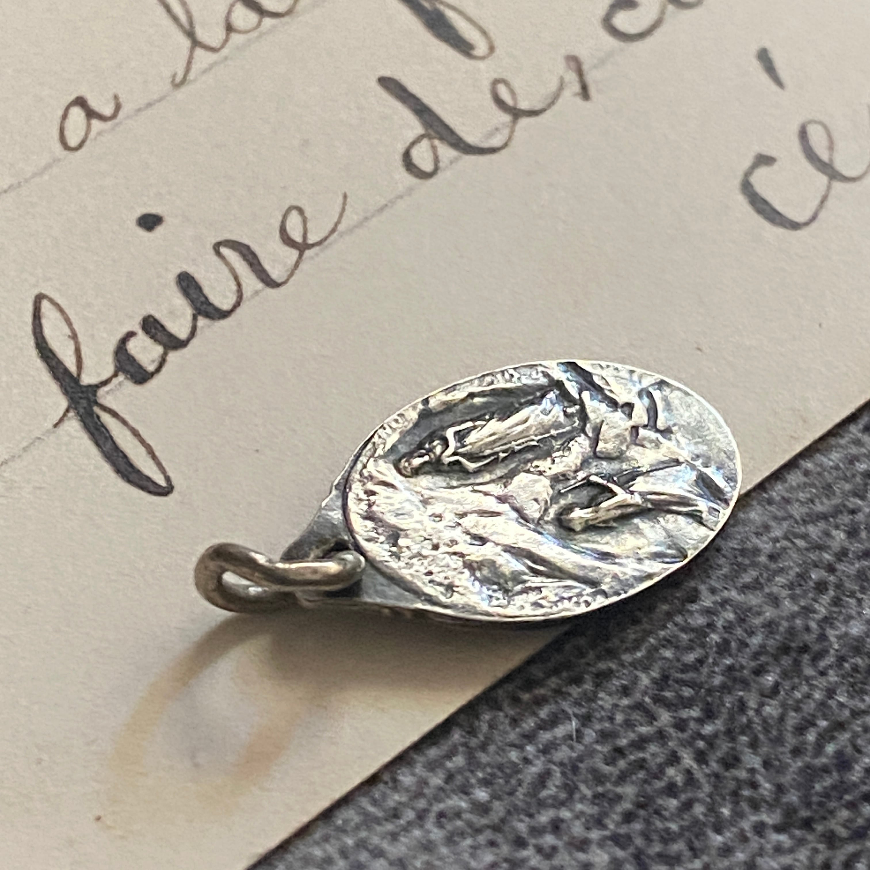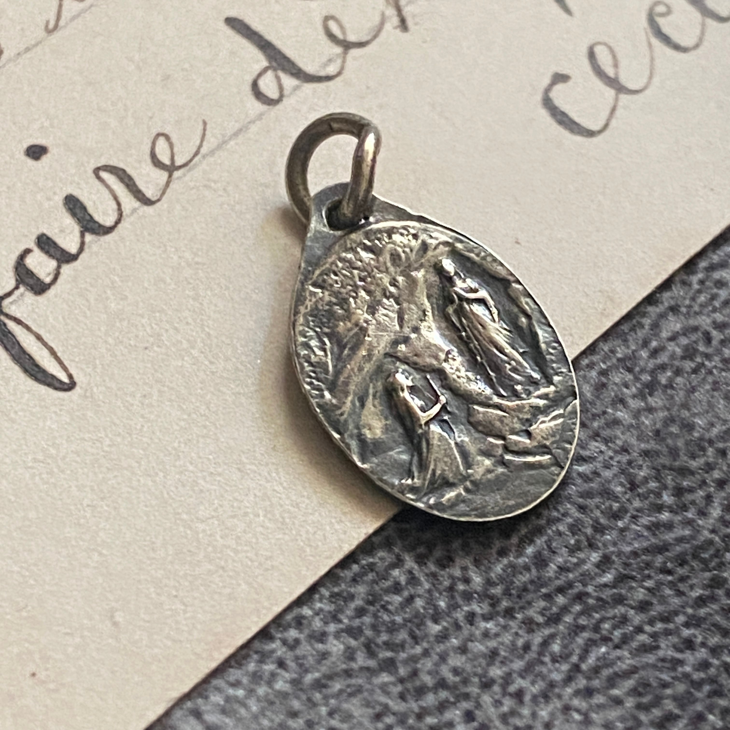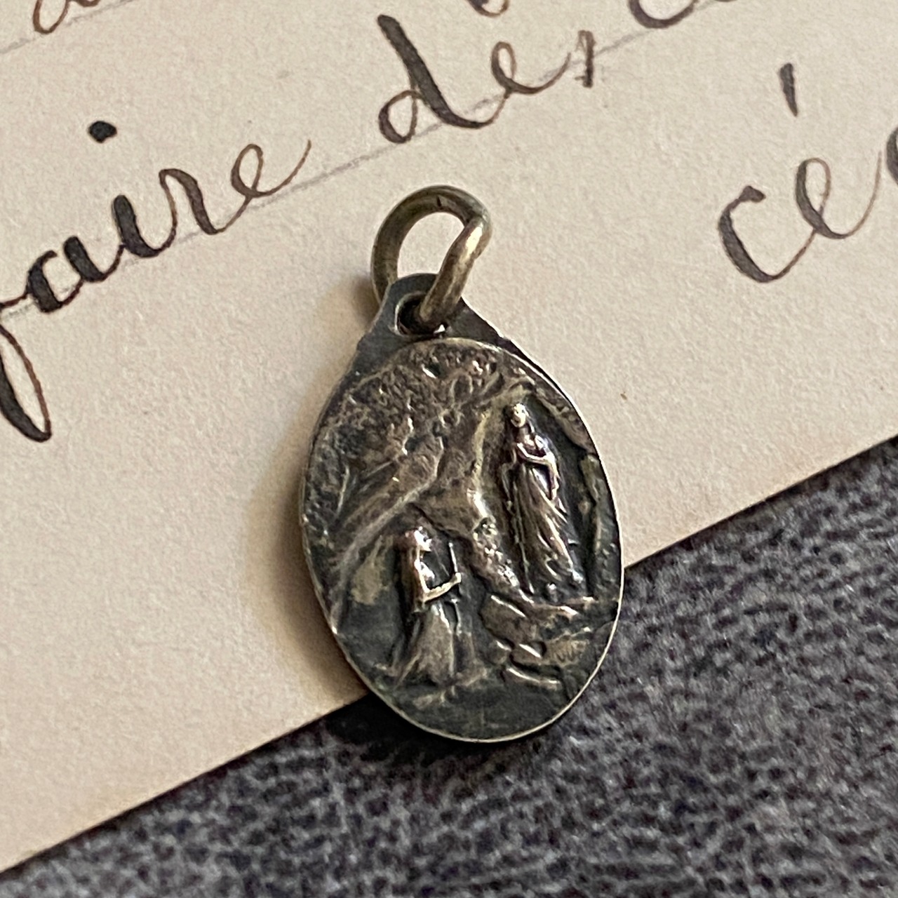 背面には、岩場に御出現された聖母に祈りを向ける少女ベルナデッタの姿。
