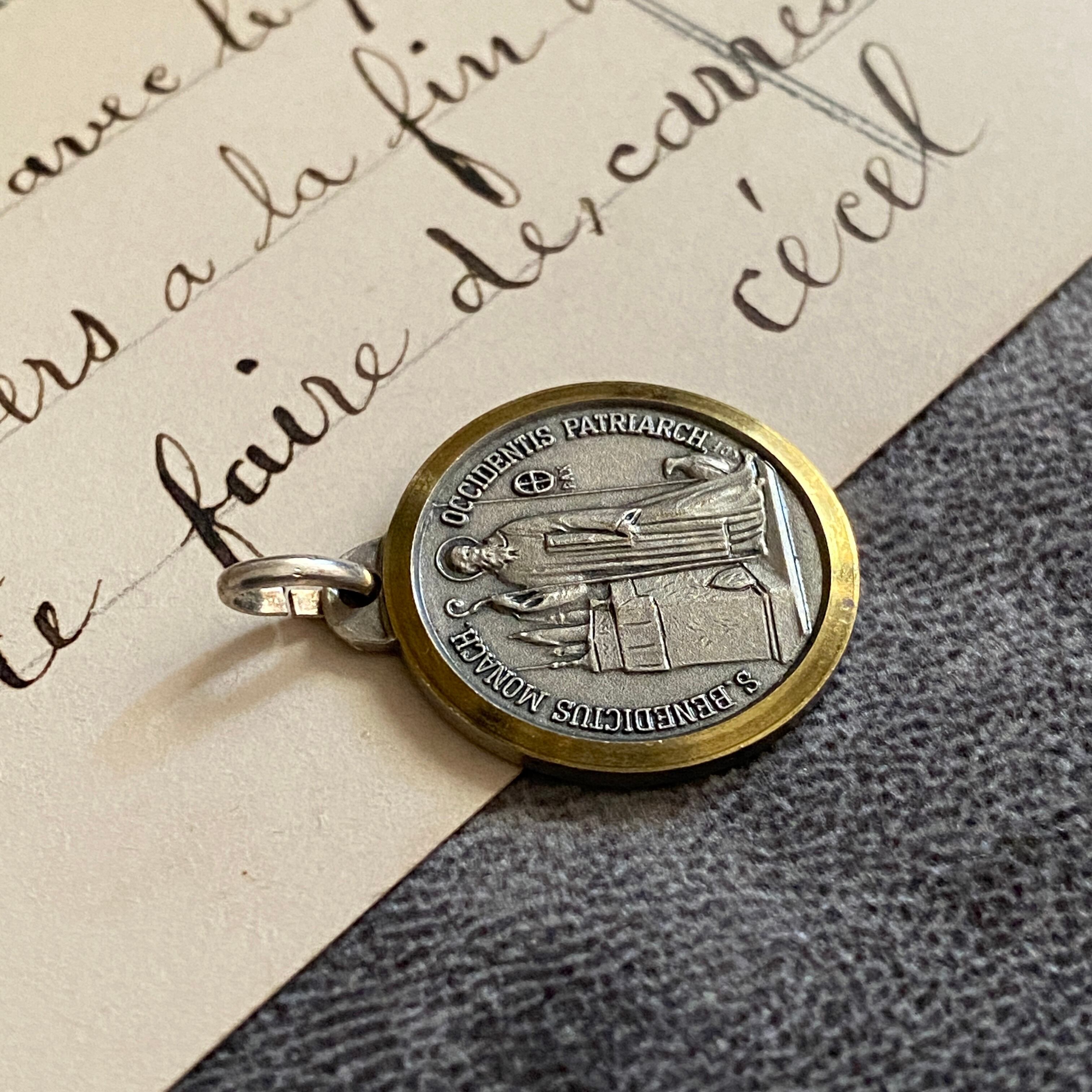 その周囲には「S. BENEDICTUS MONACHORUM PATRONUS(修道士の父、聖ベネディクト)」のラテン語がめぐり、精神的な強さと静かな信仰の力を感じさせます。