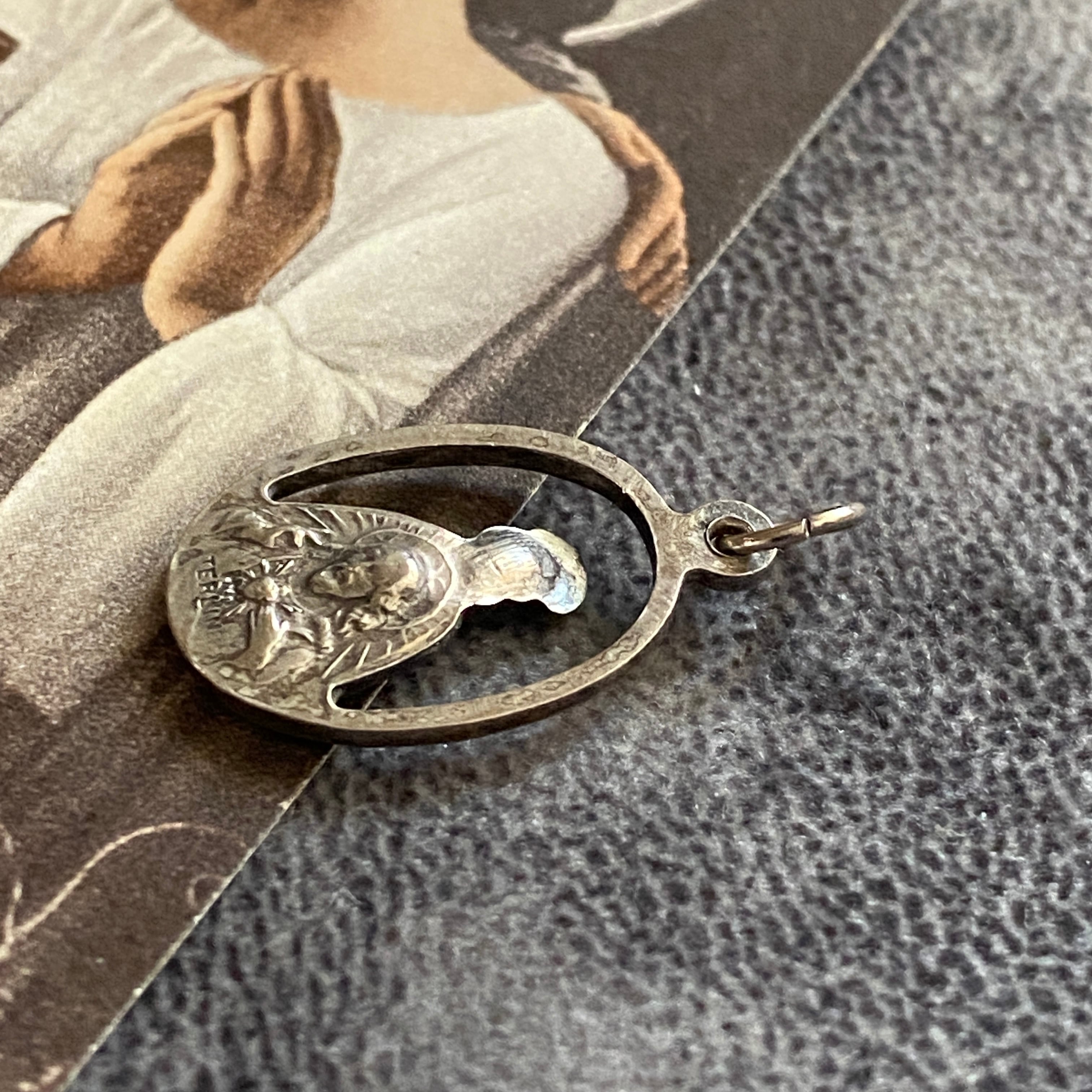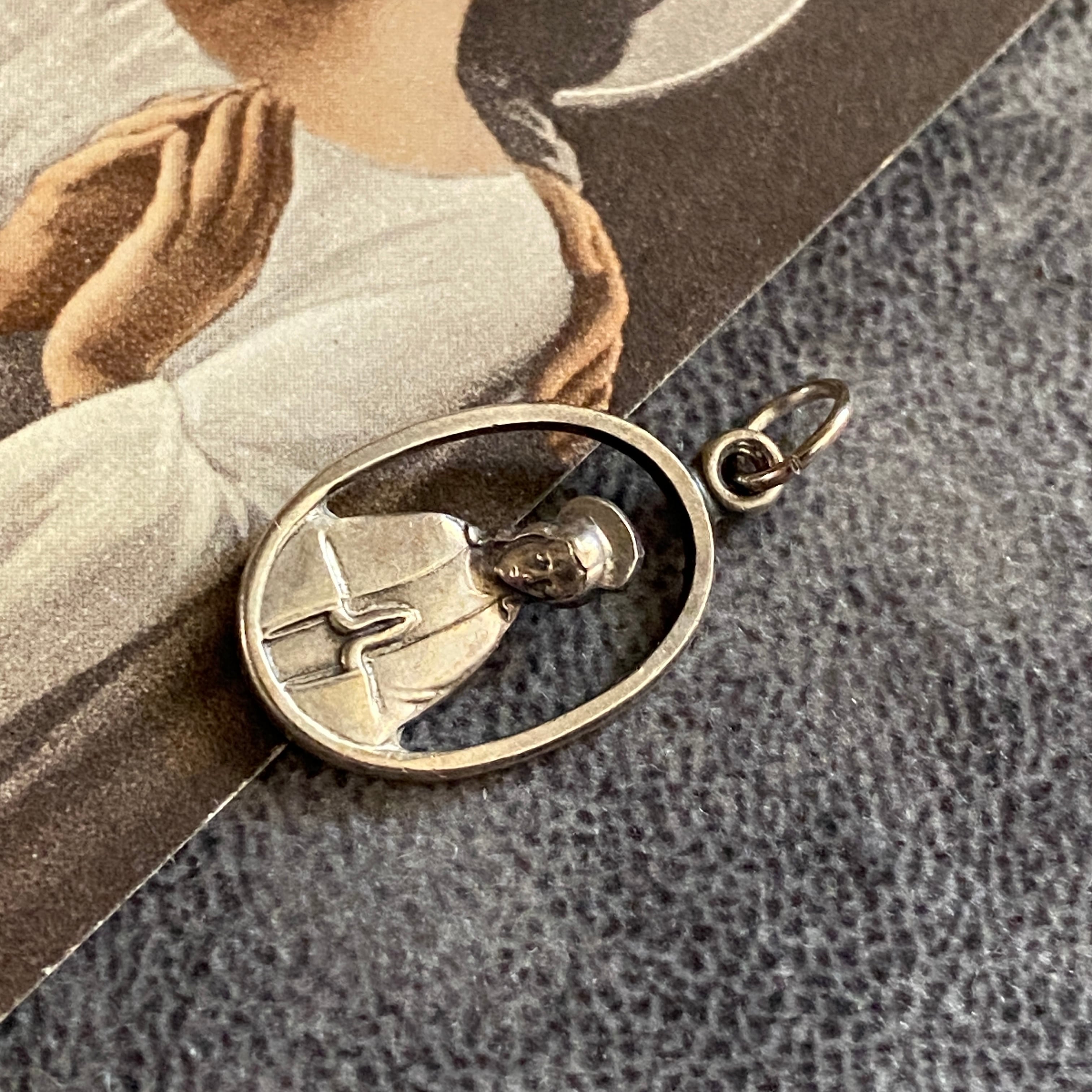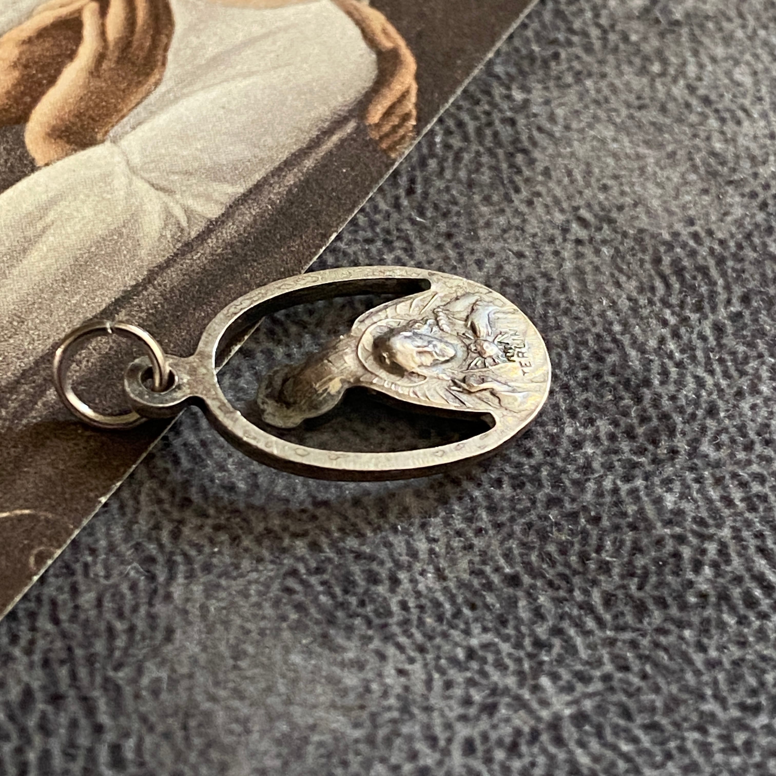 オープンワーク(透かし)構造の祈りのマリアさまのメダイ。