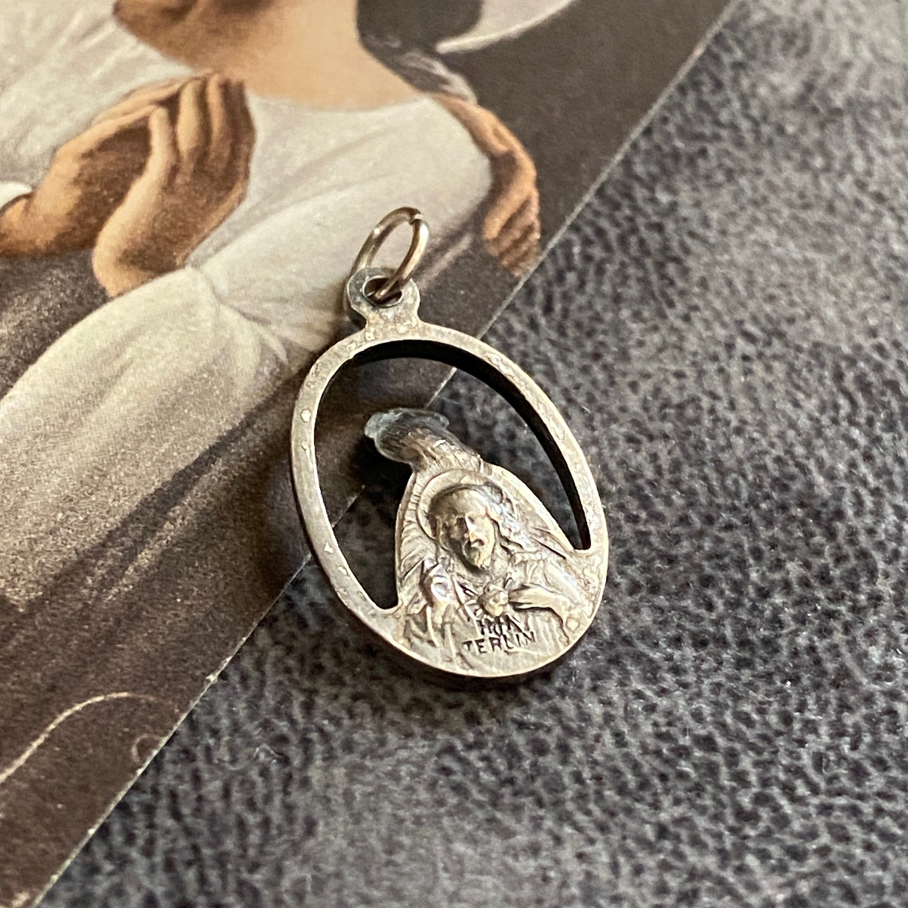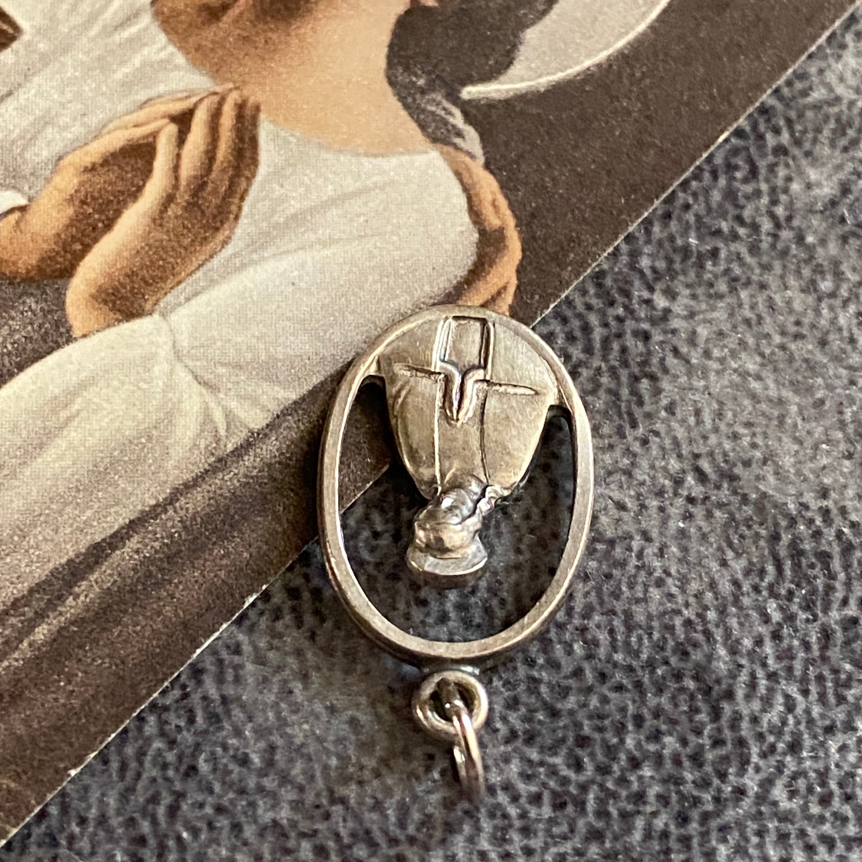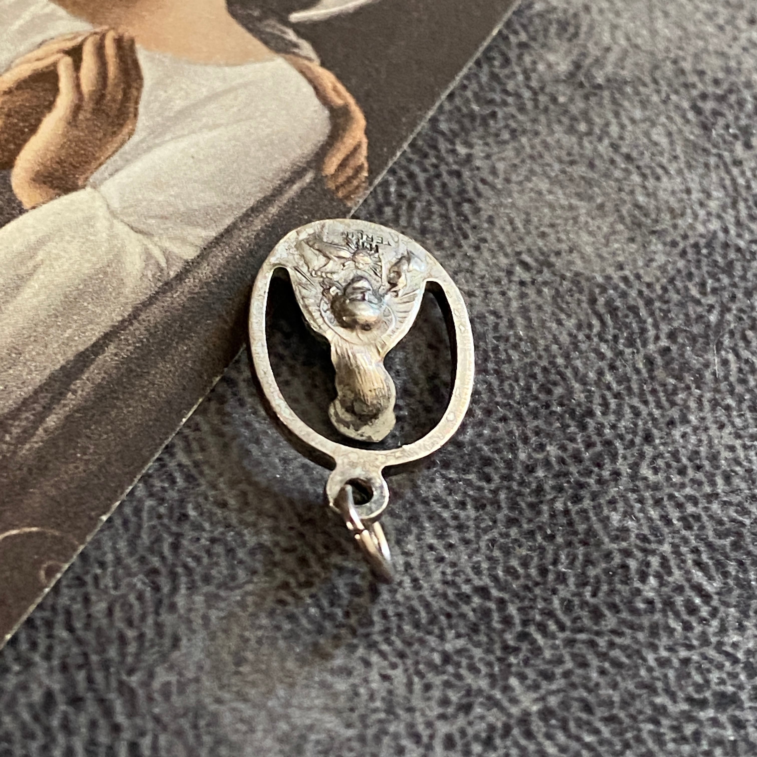 オープンワーク(透かし)構造の祈りのマリアさまのメダイ。