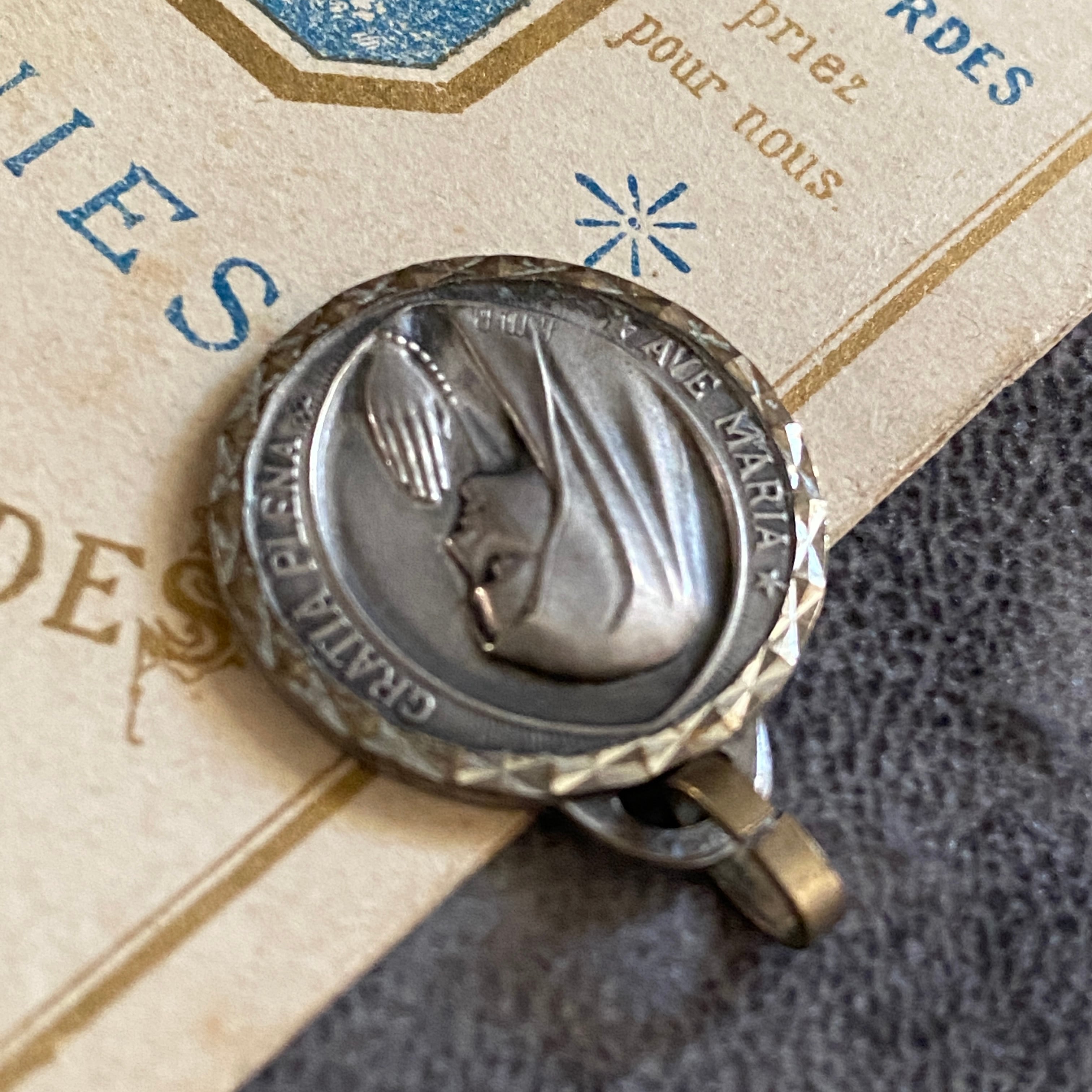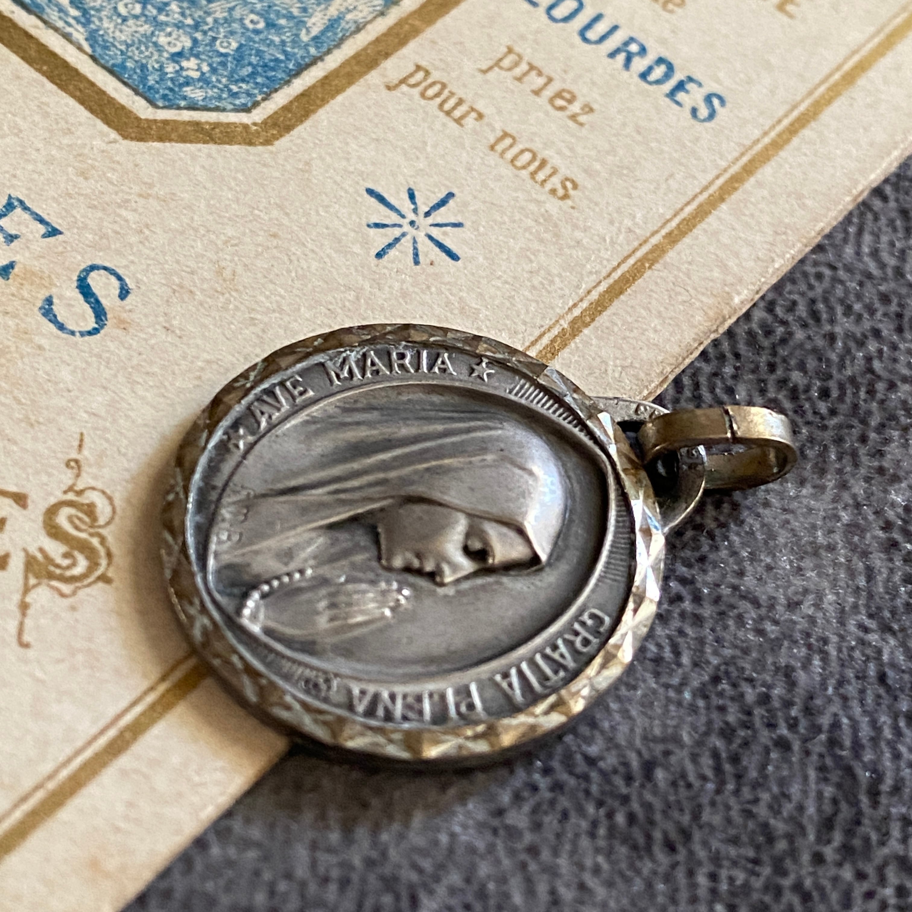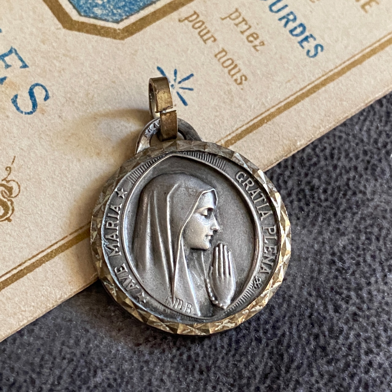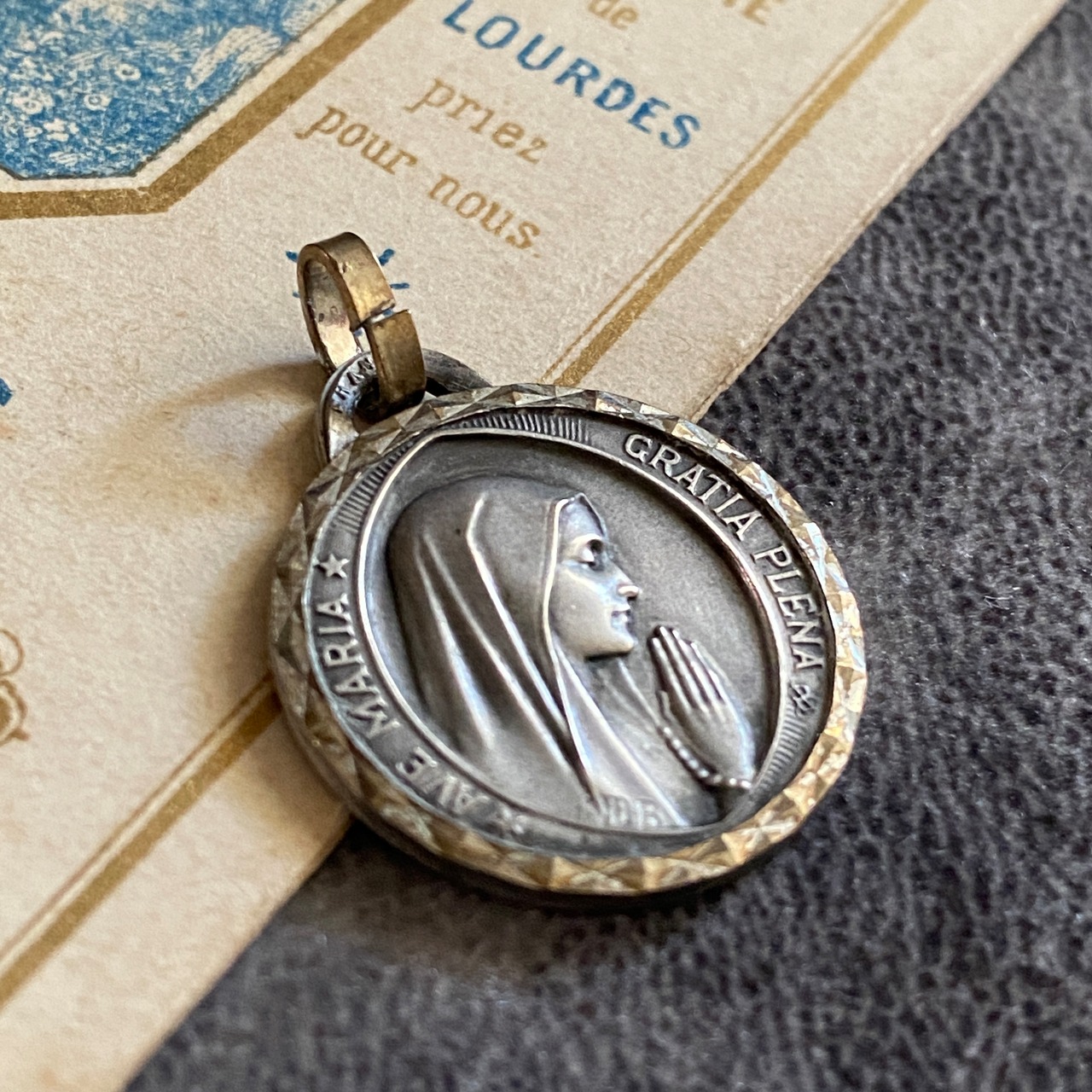 祈りを捧げる聖母マリアの横顔が美しく刻まれたルルドのメダイ。