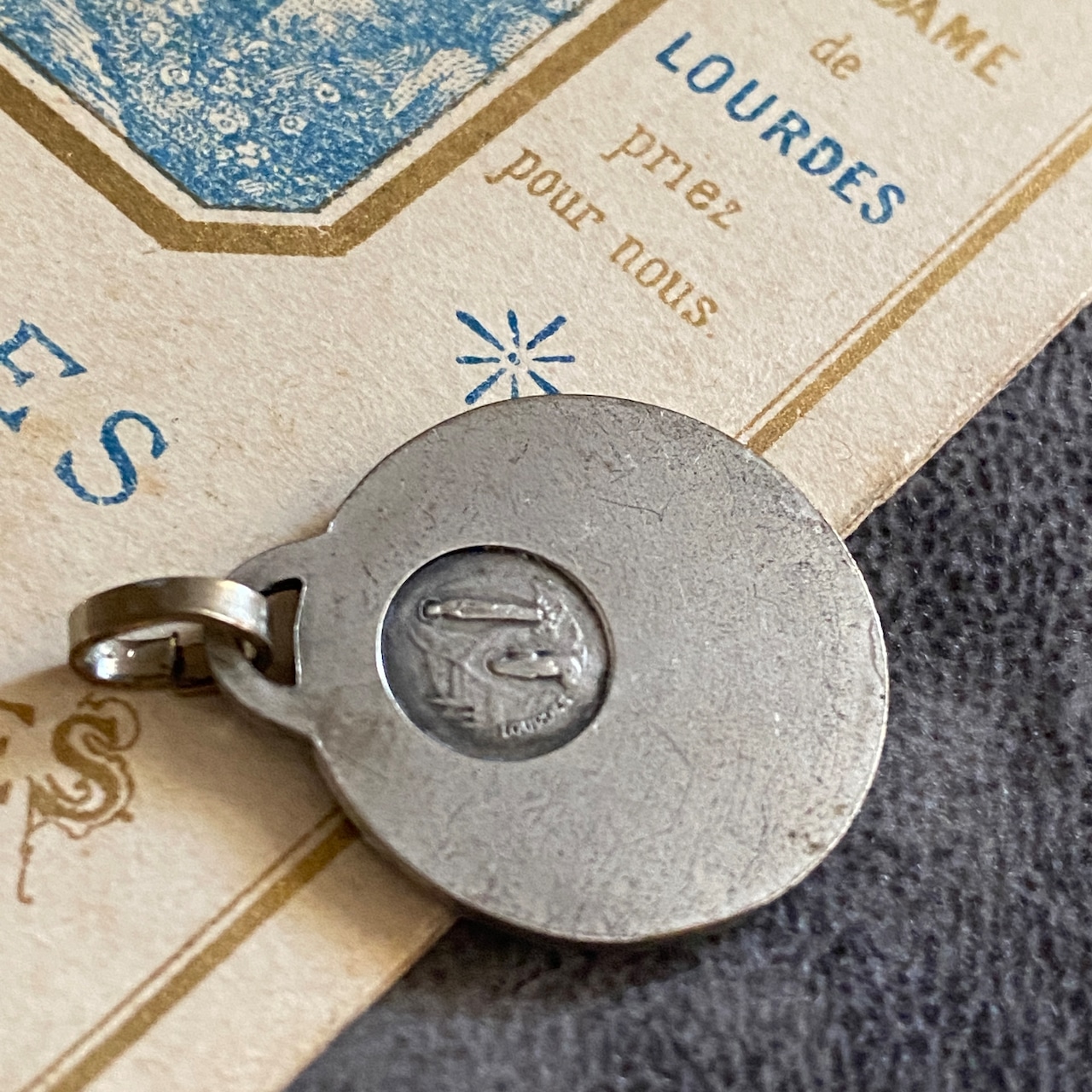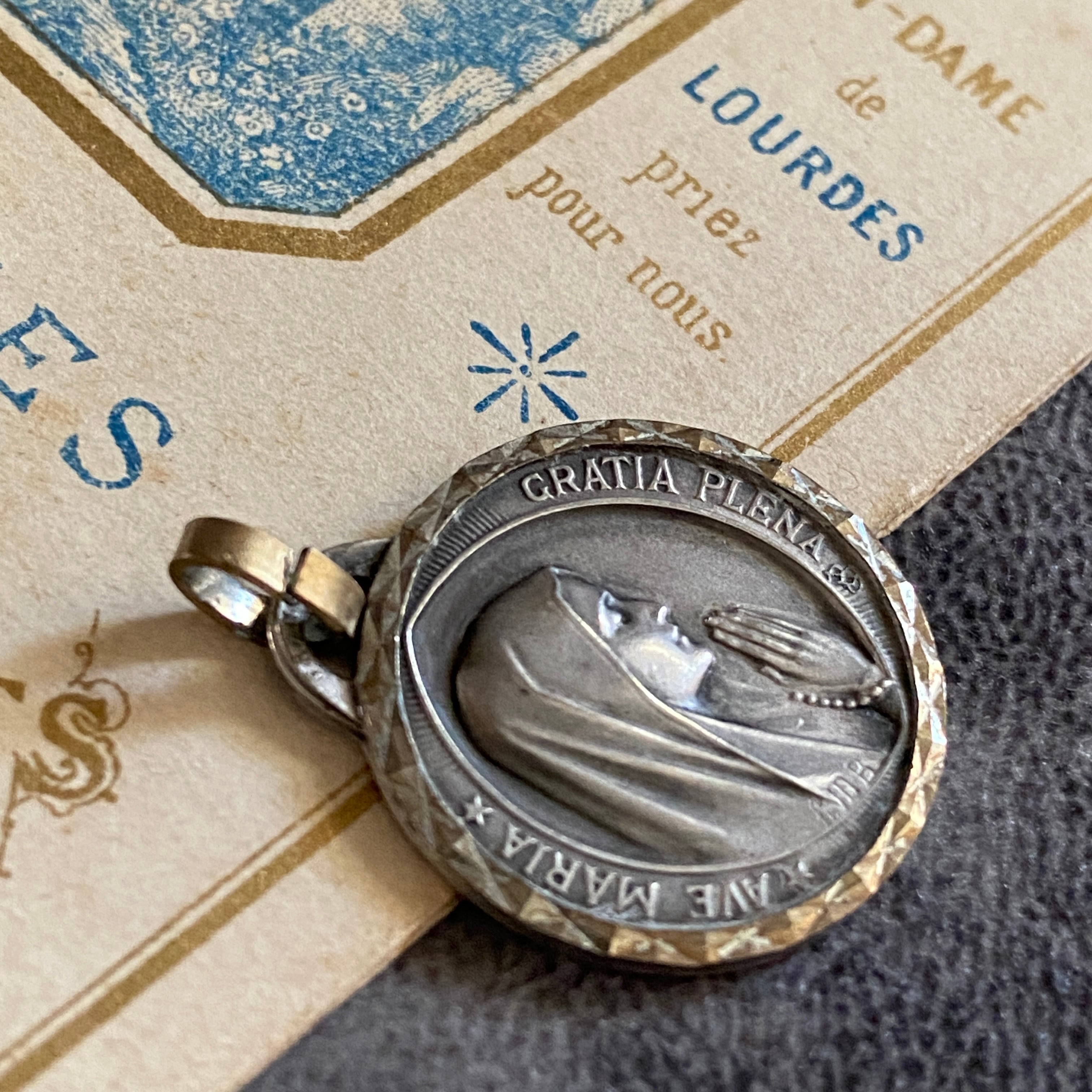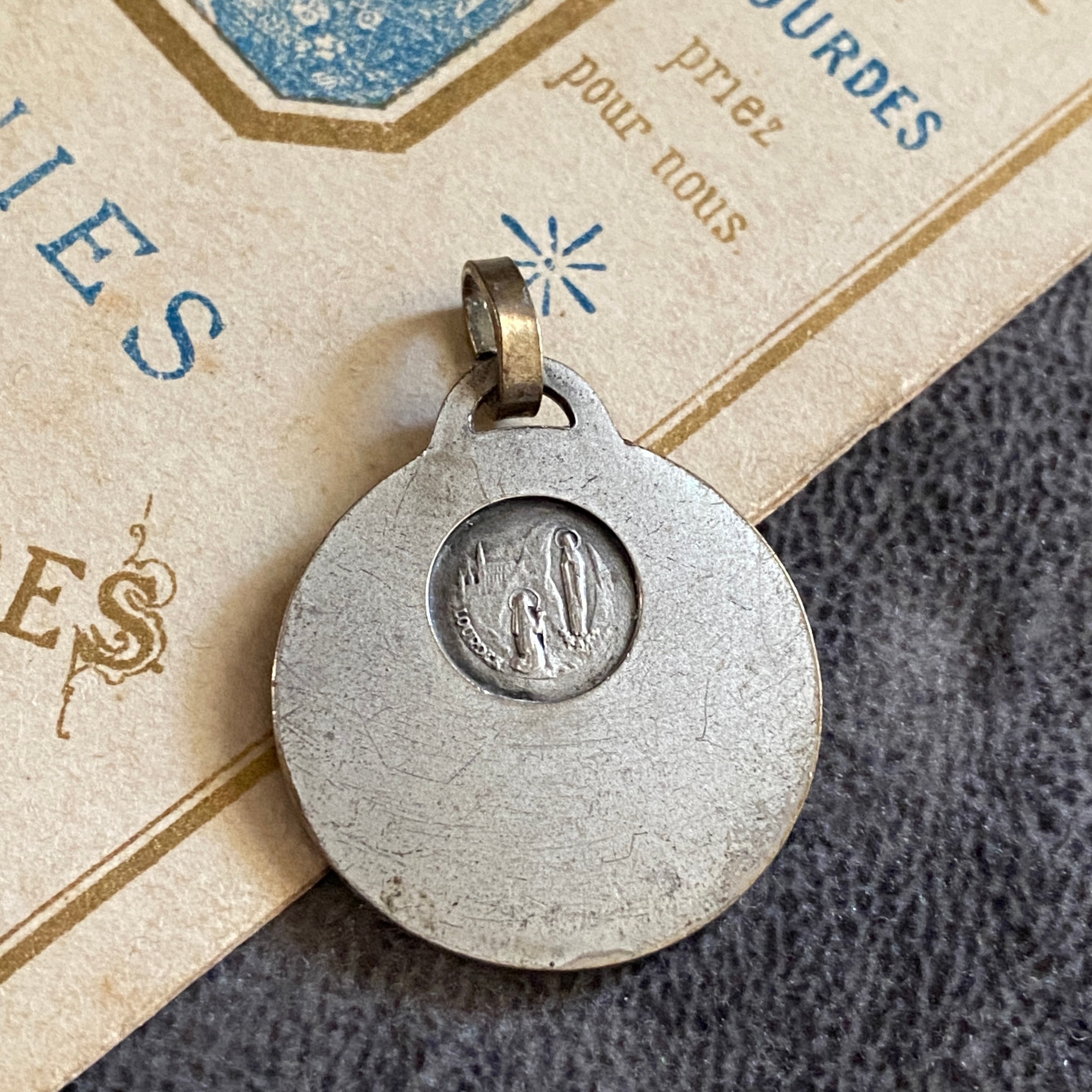 背面にはルルドの出現シーンが小さく描かれ、シンプルでありながら力強い信仰の証が込められています。