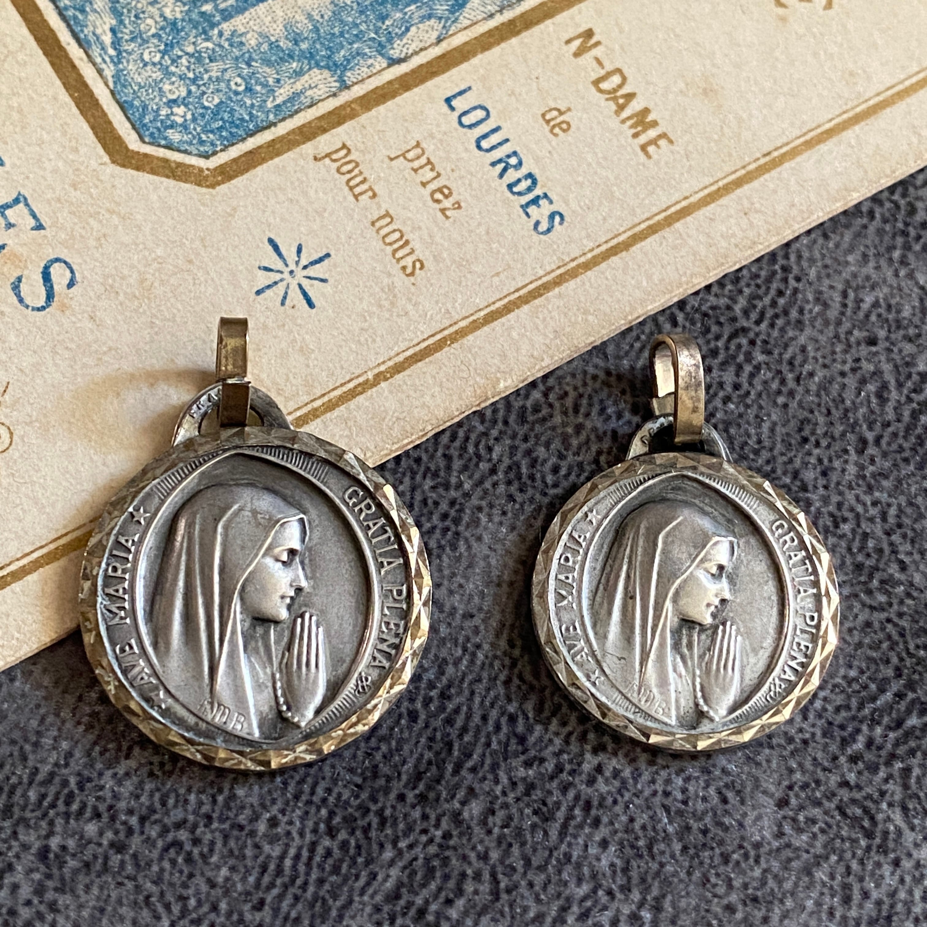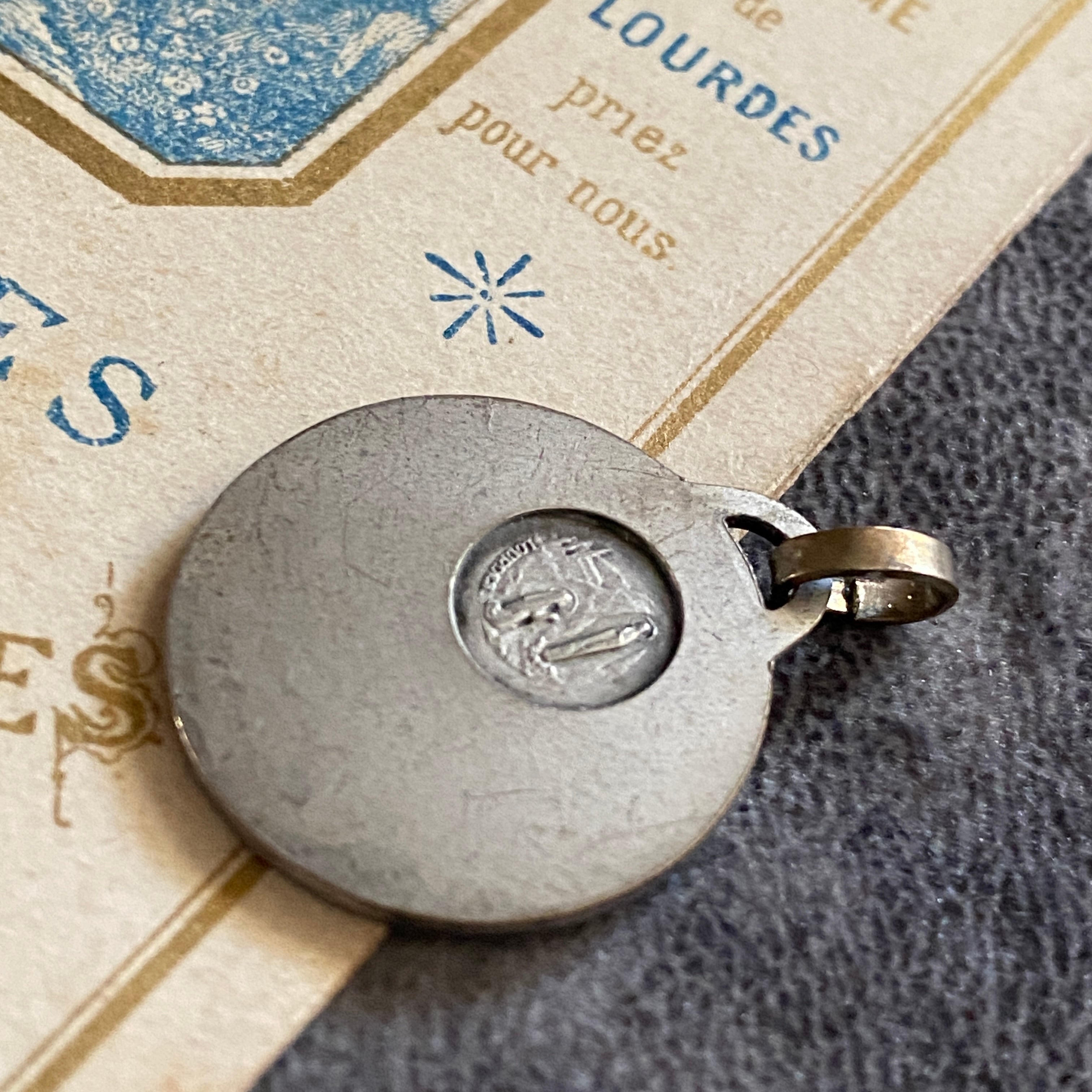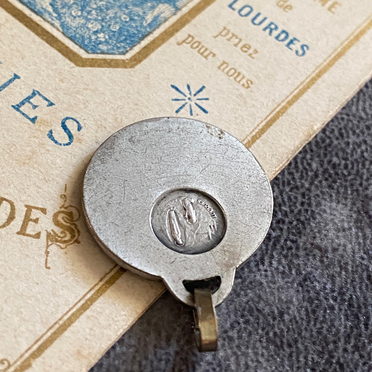 背面にはルルドの出現シーンが小さく描かれ、シンプルでありながら力強い信仰の証が込められています。