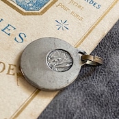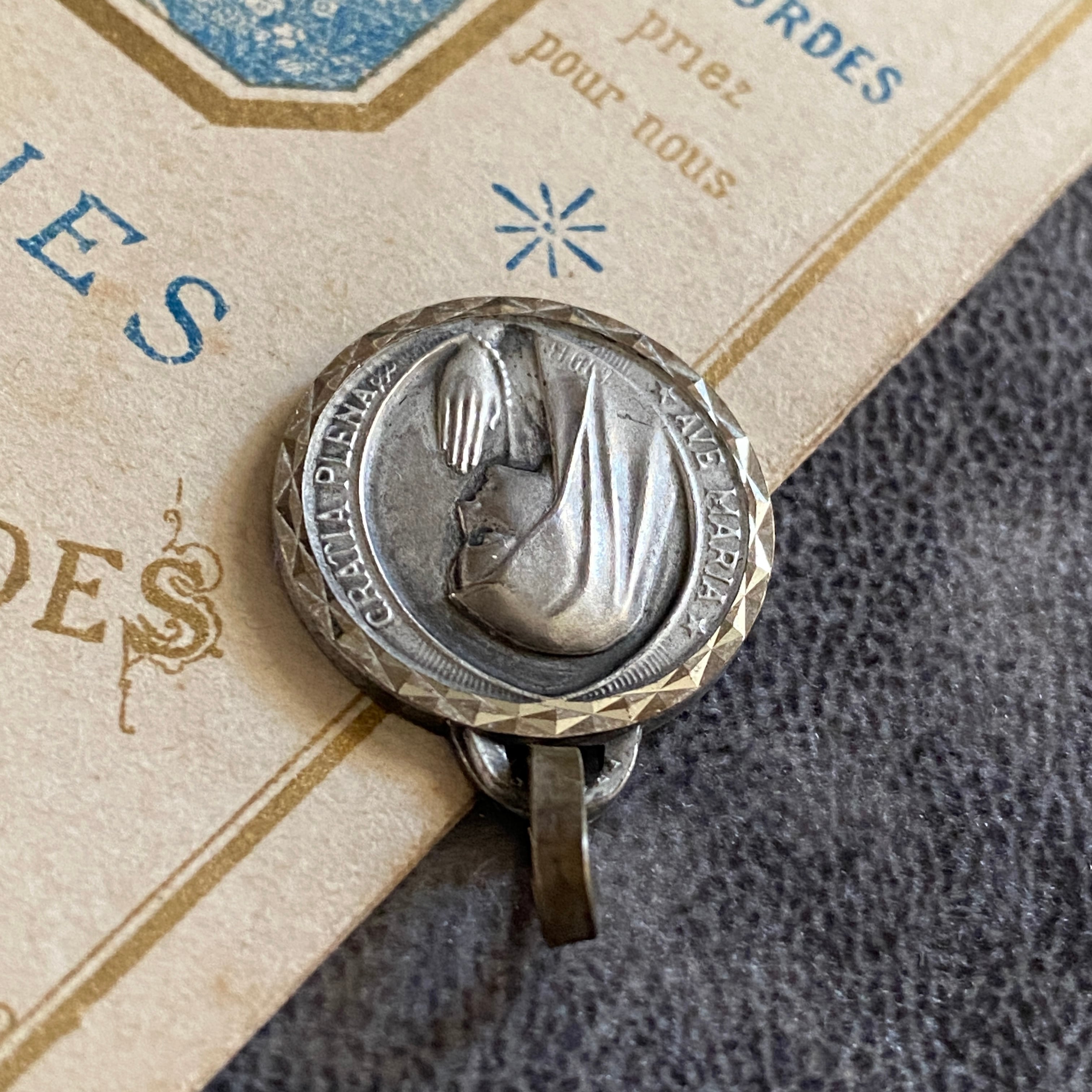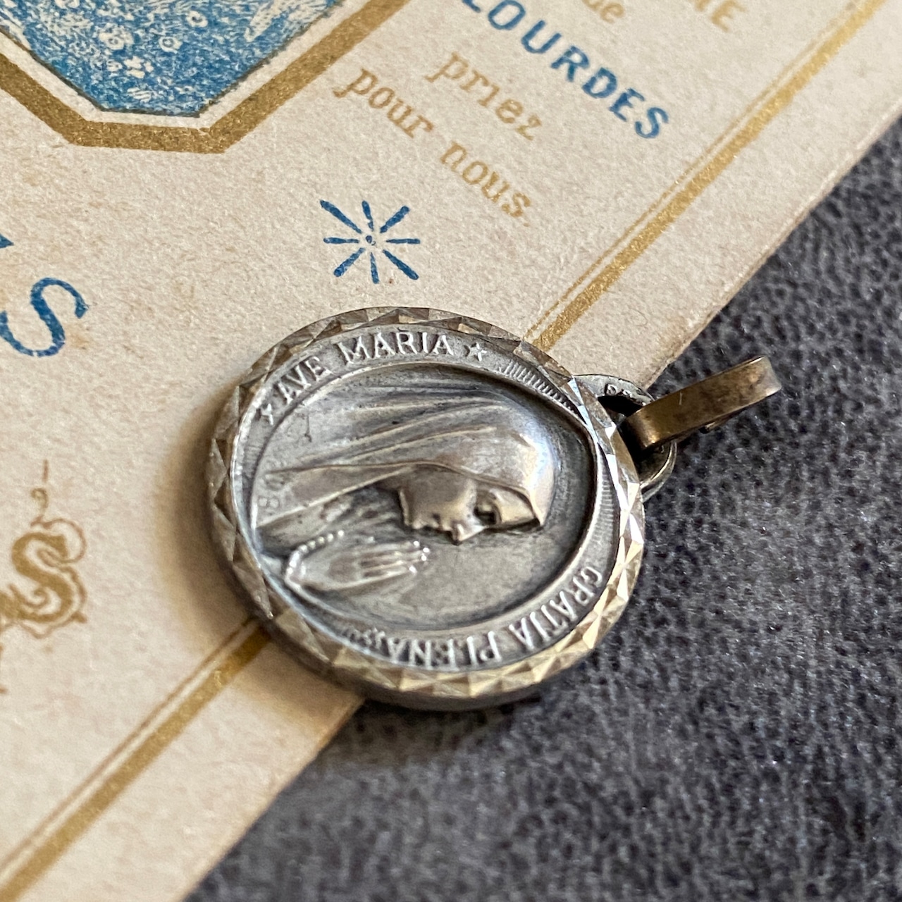 祈りを捧げる聖母マリアの横顔が美しく刻まれたルルドのメダイ。