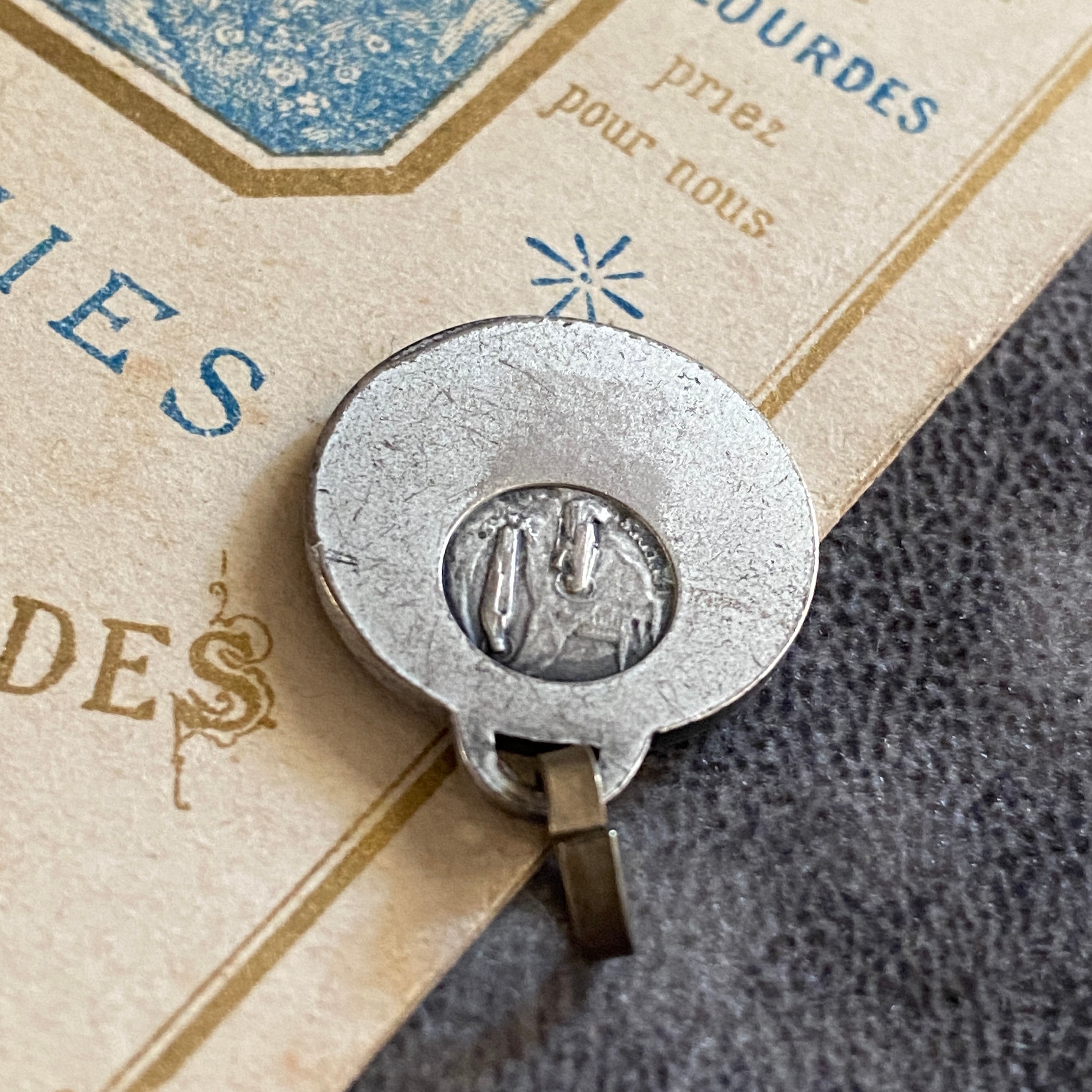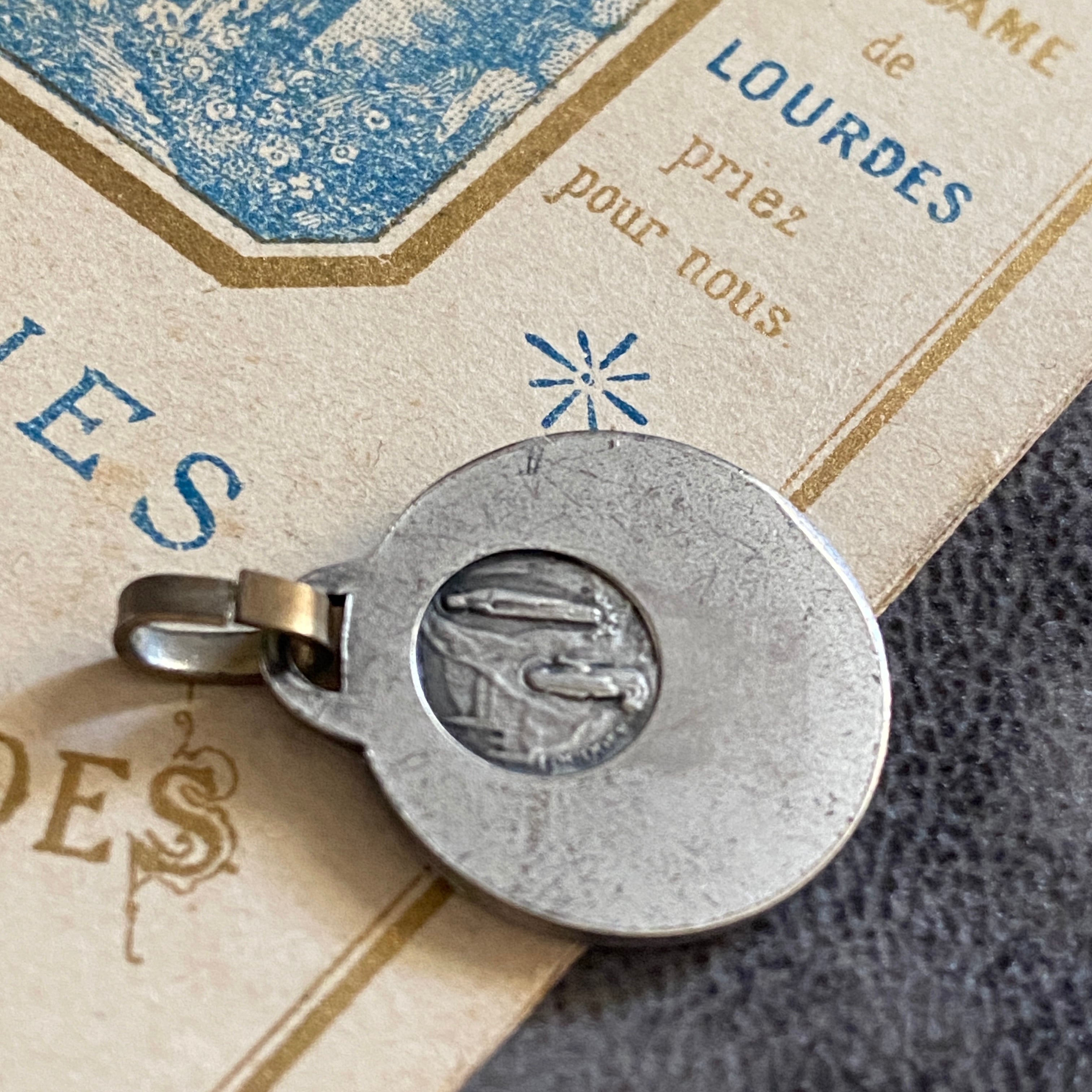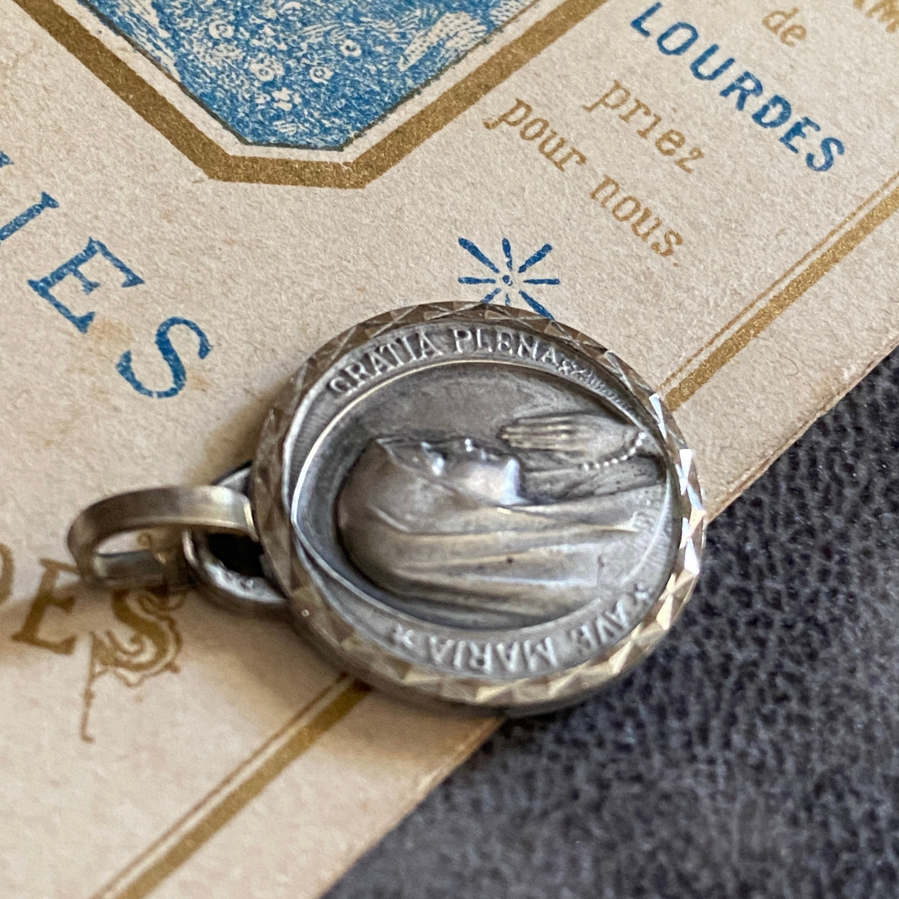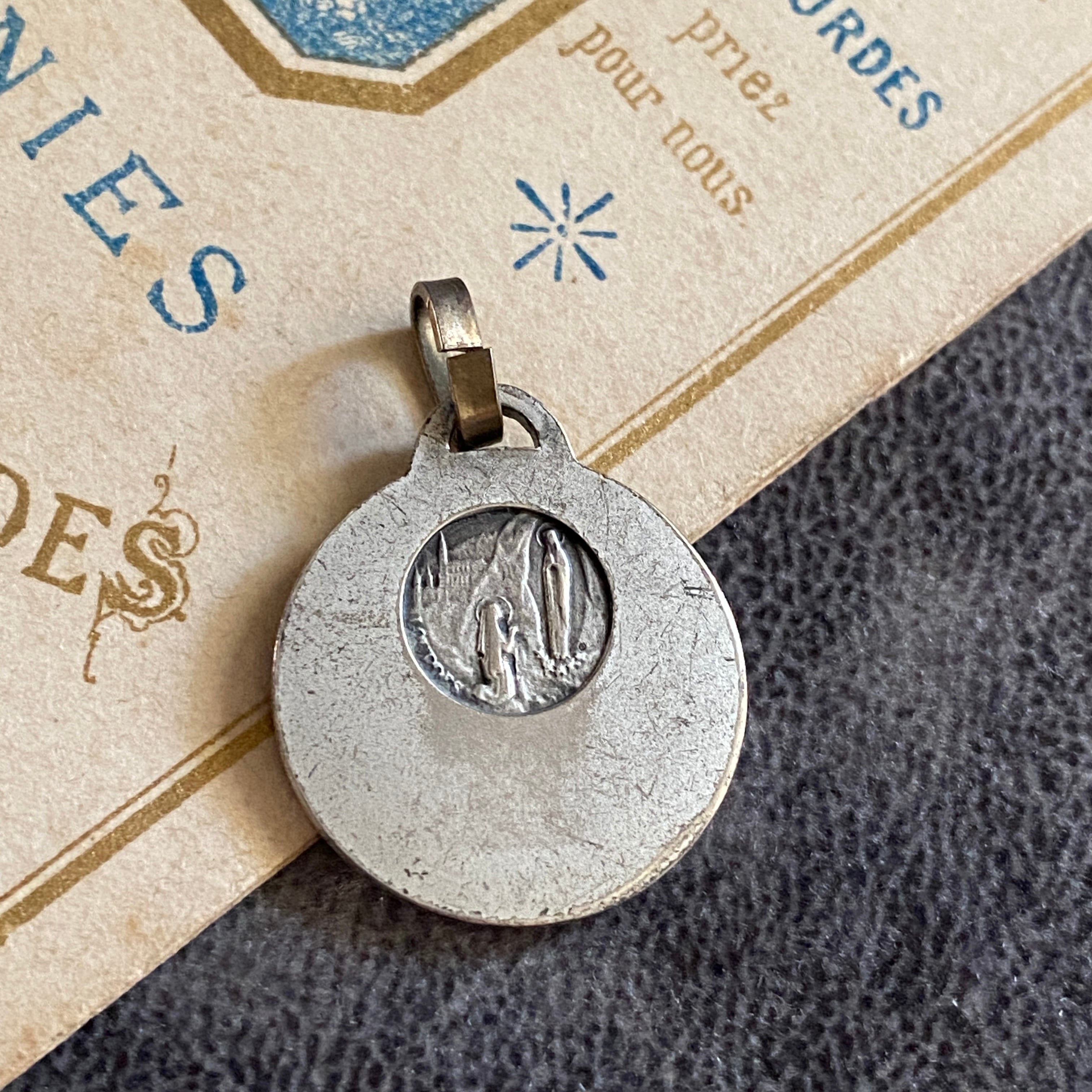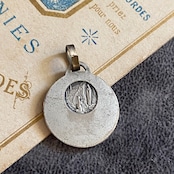 背面にはルルドの出現シーンが小さく描かれ、シンプルでありながら力強い信仰の証が込められています。