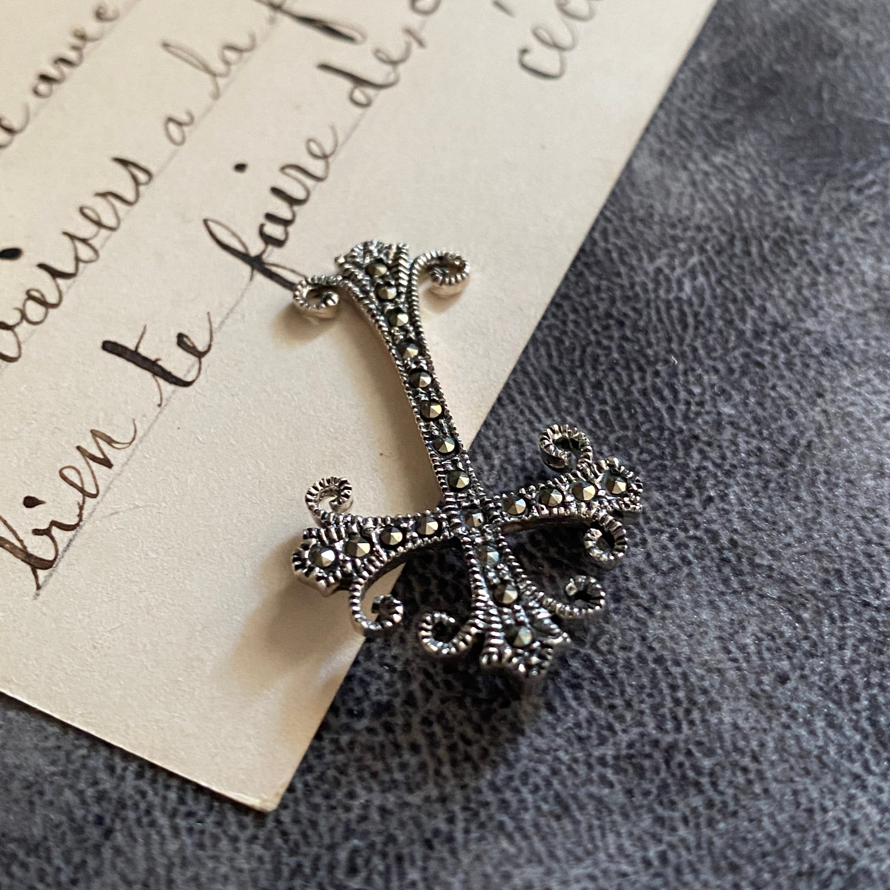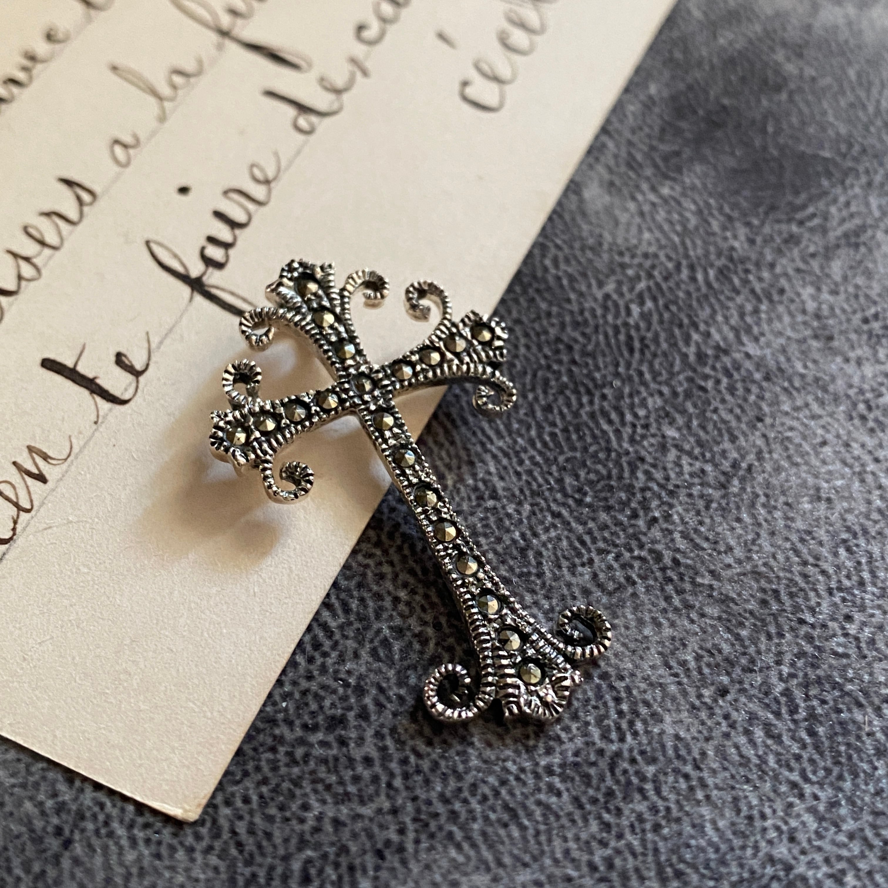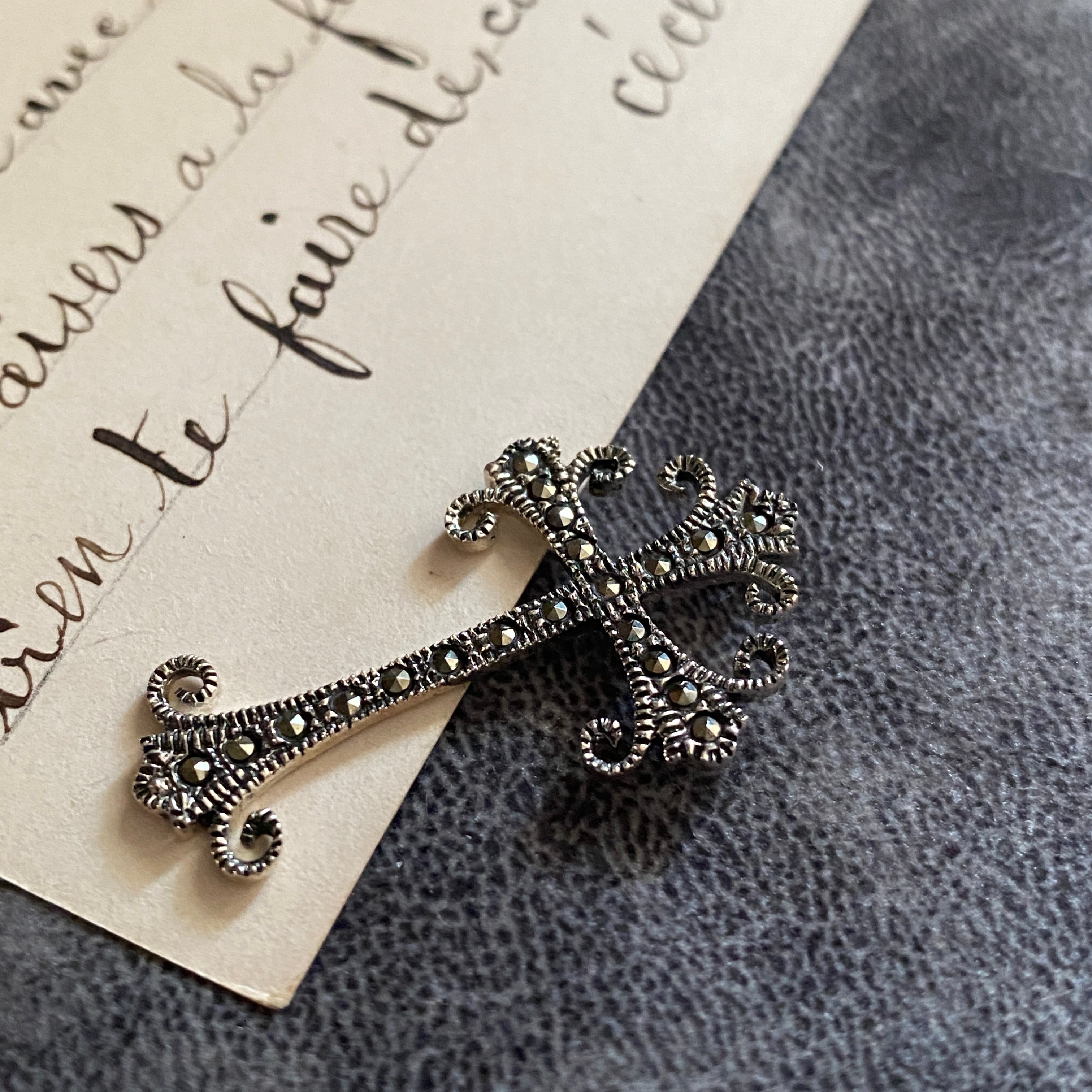 繊細なスクロール装飾と、粒状に配されたマーカサイトが印象的な一点です。