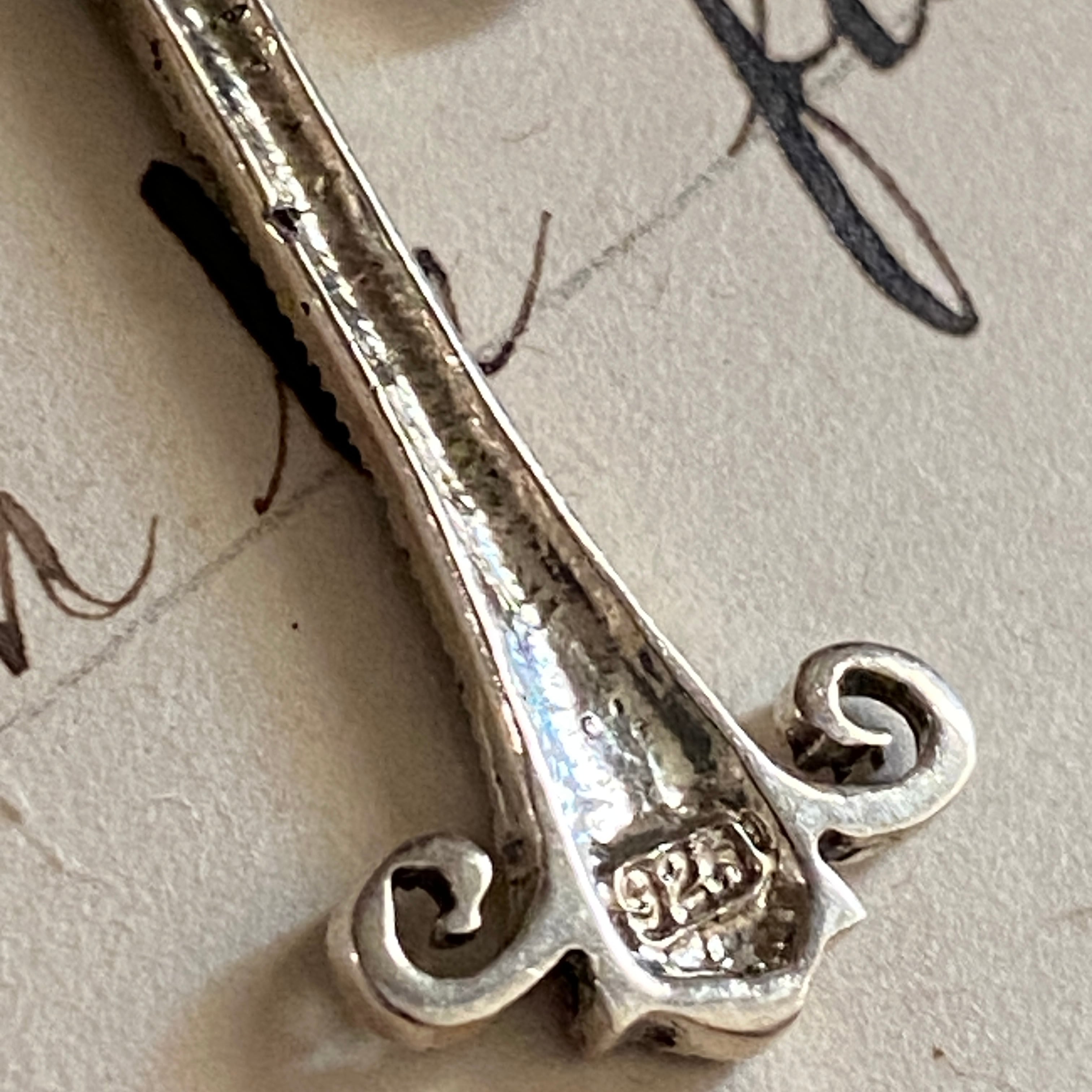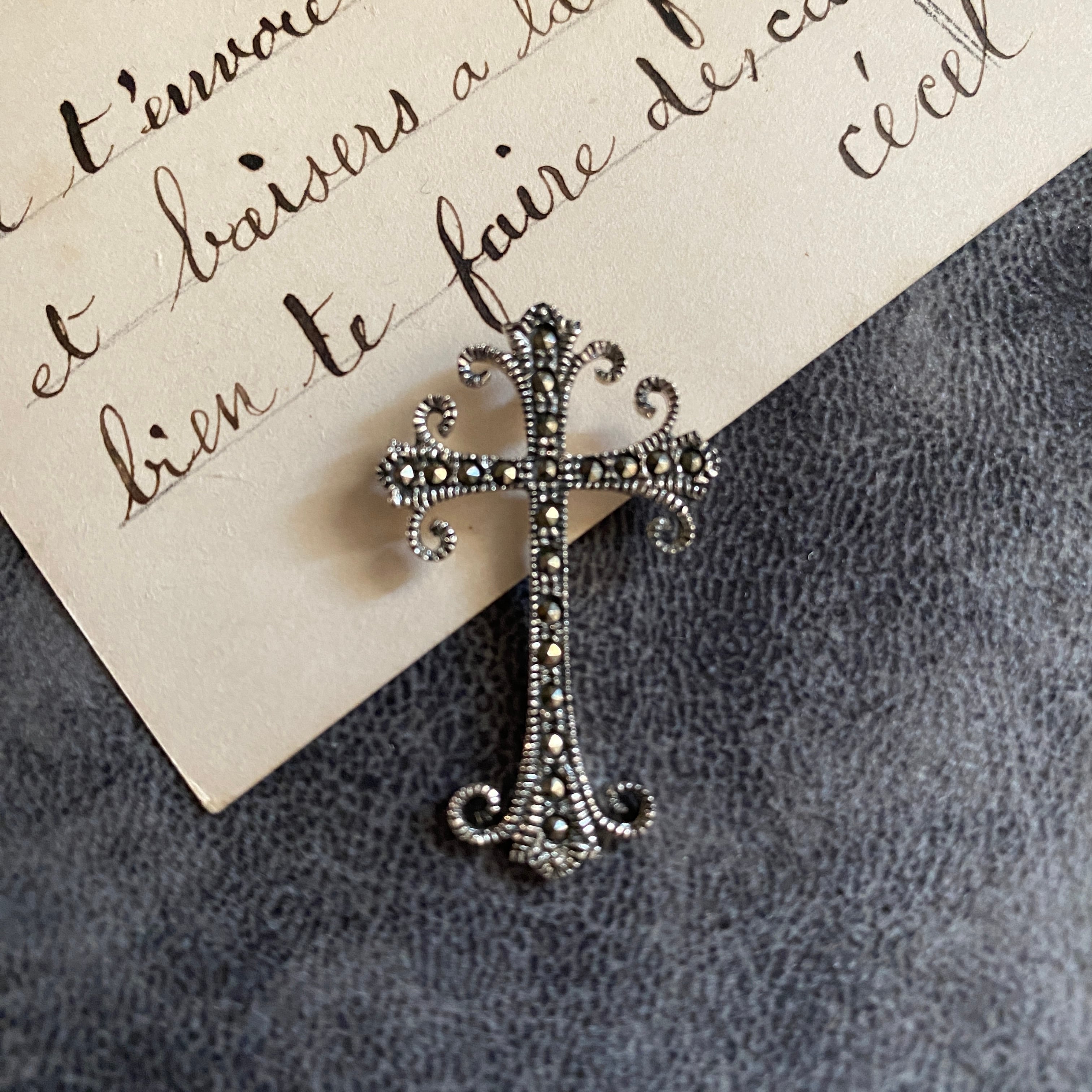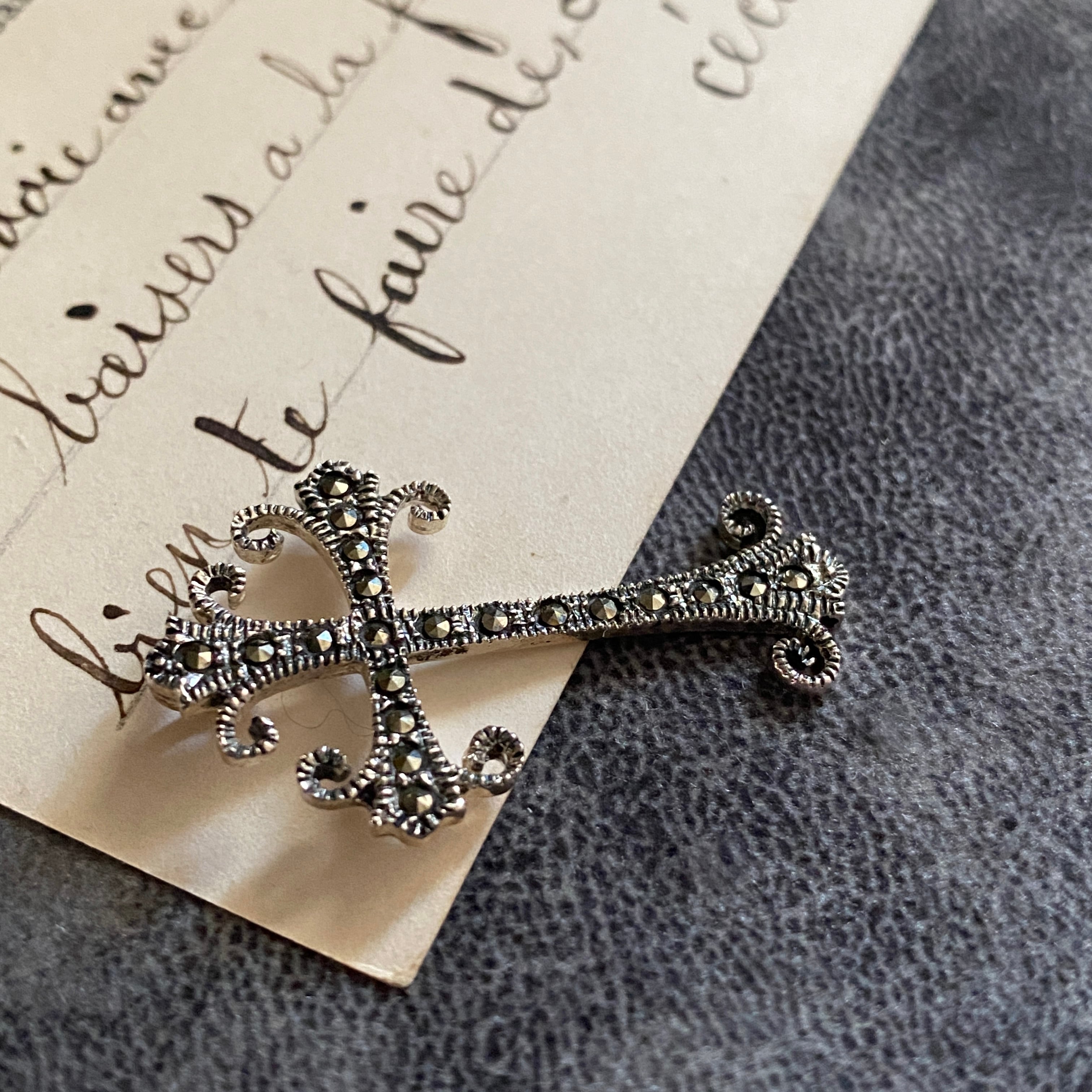 繊細なスクロール装飾と、粒状に配されたマーカサイトが印象的な一点です。