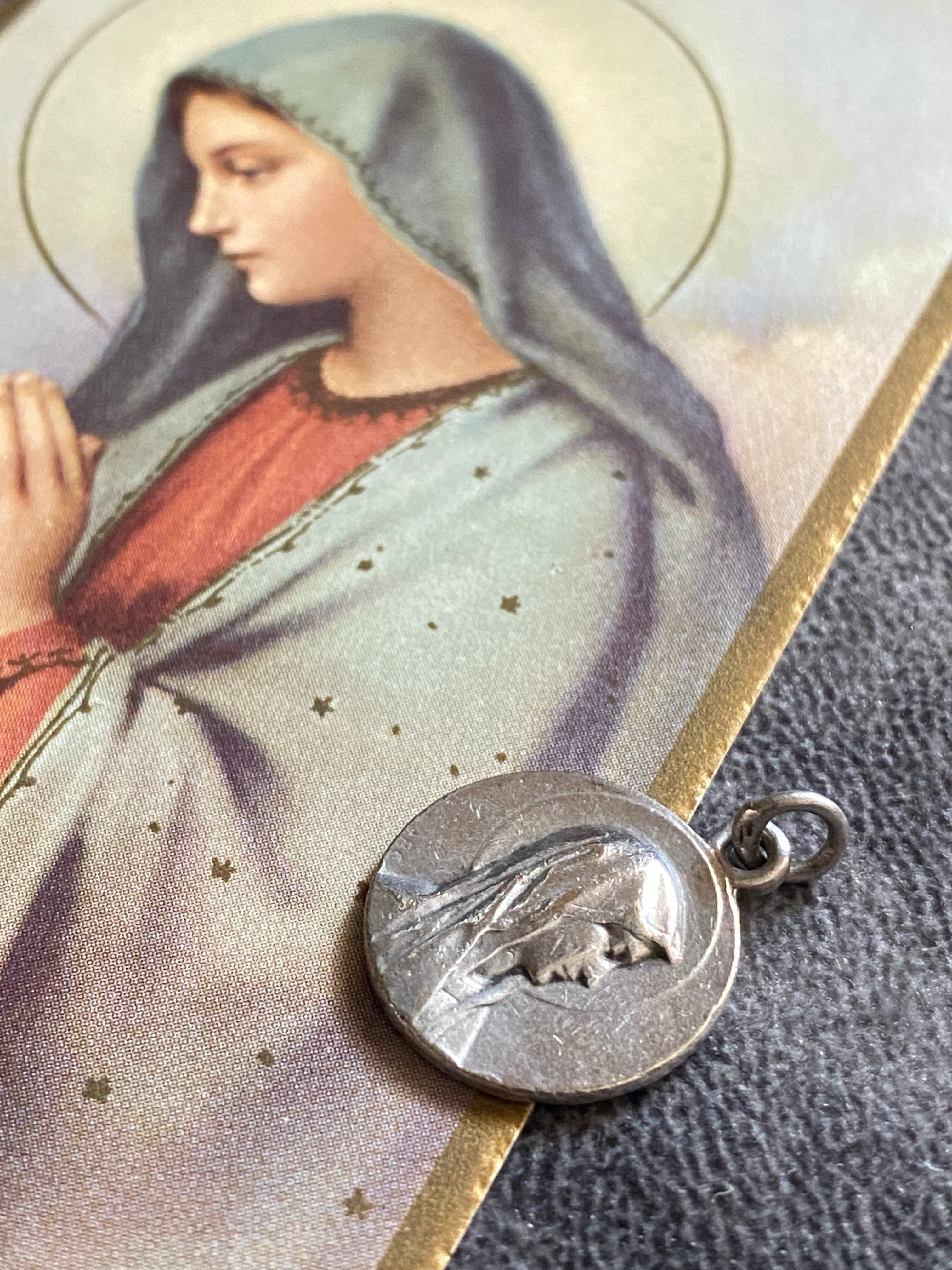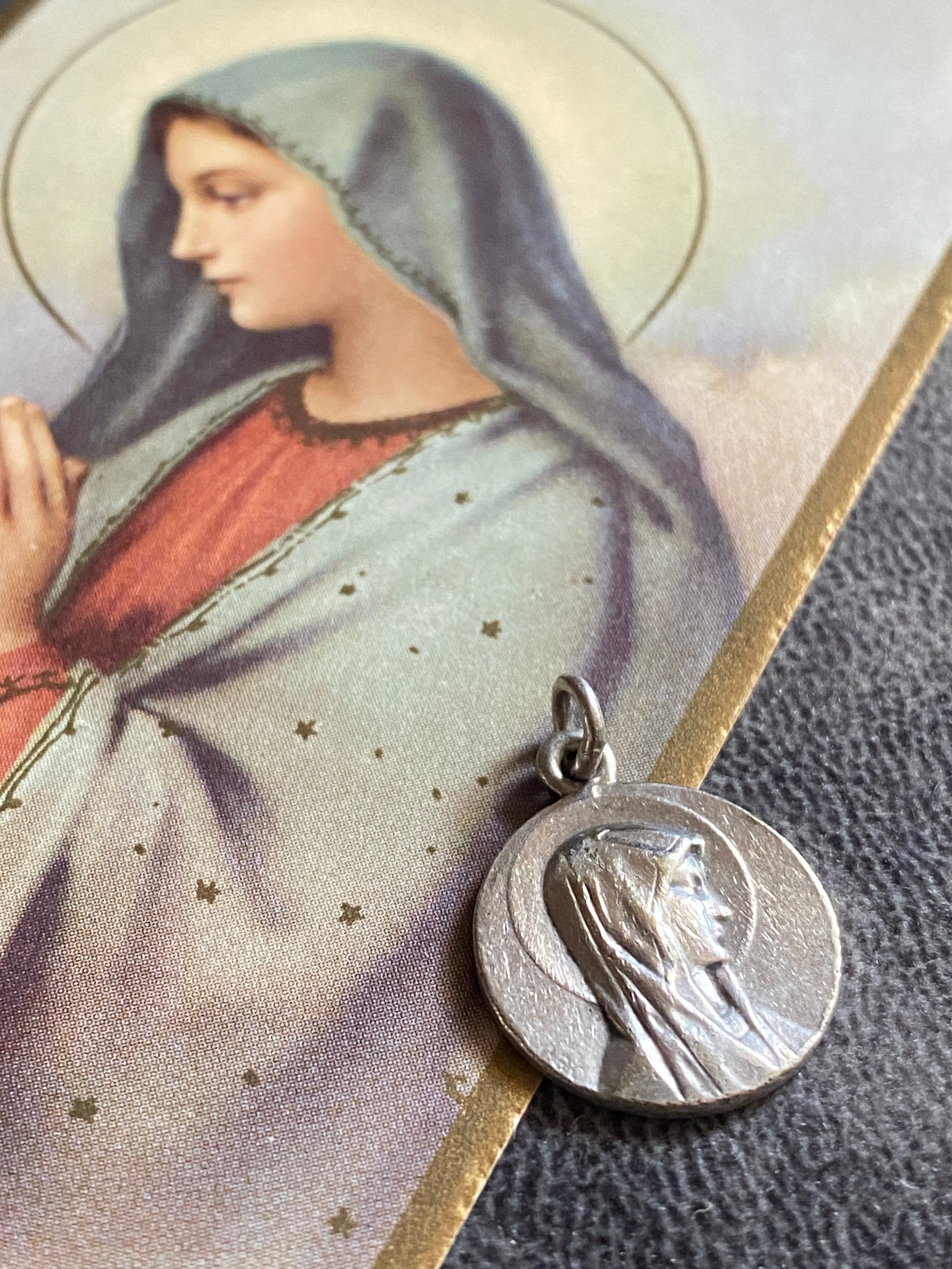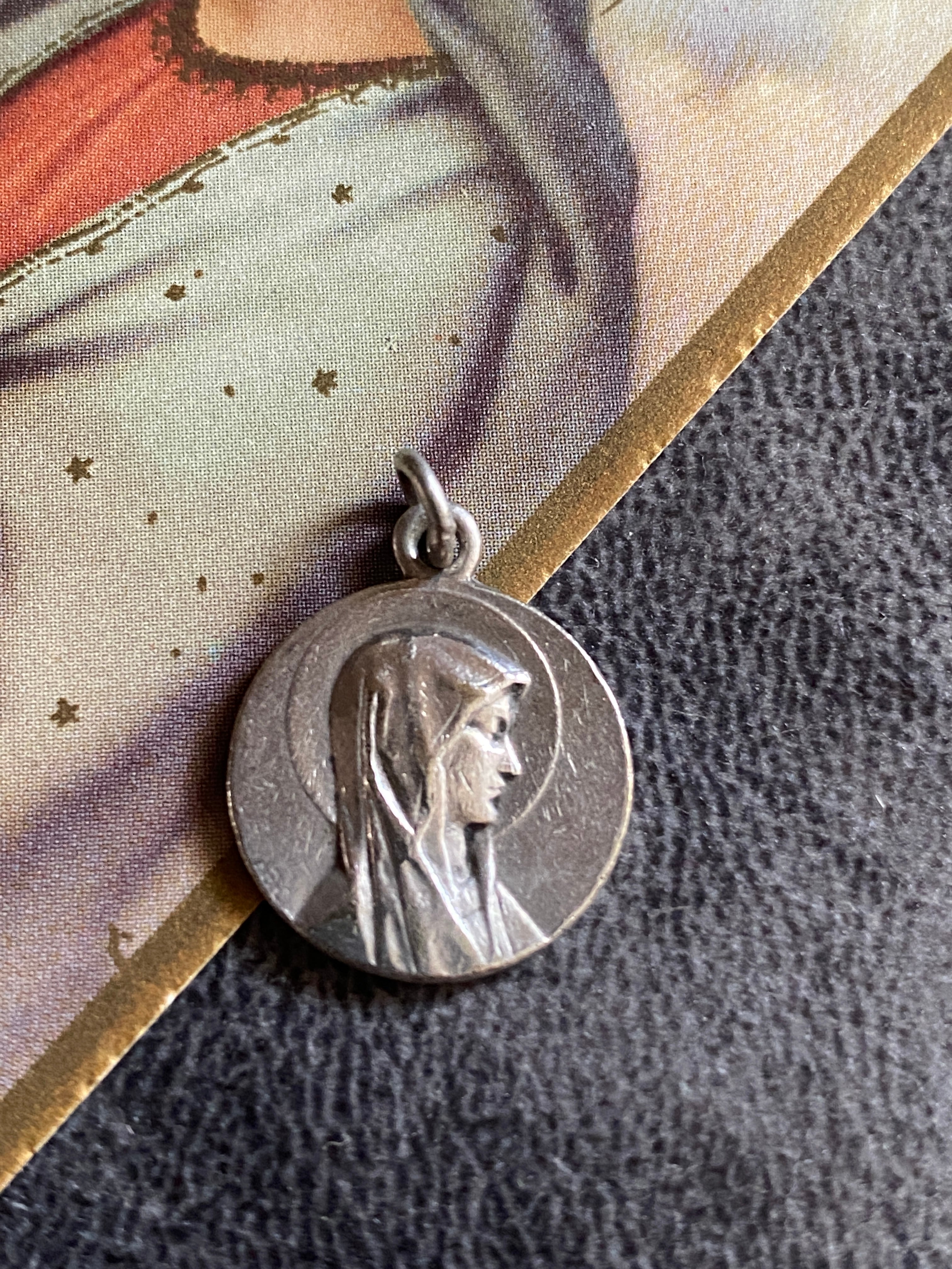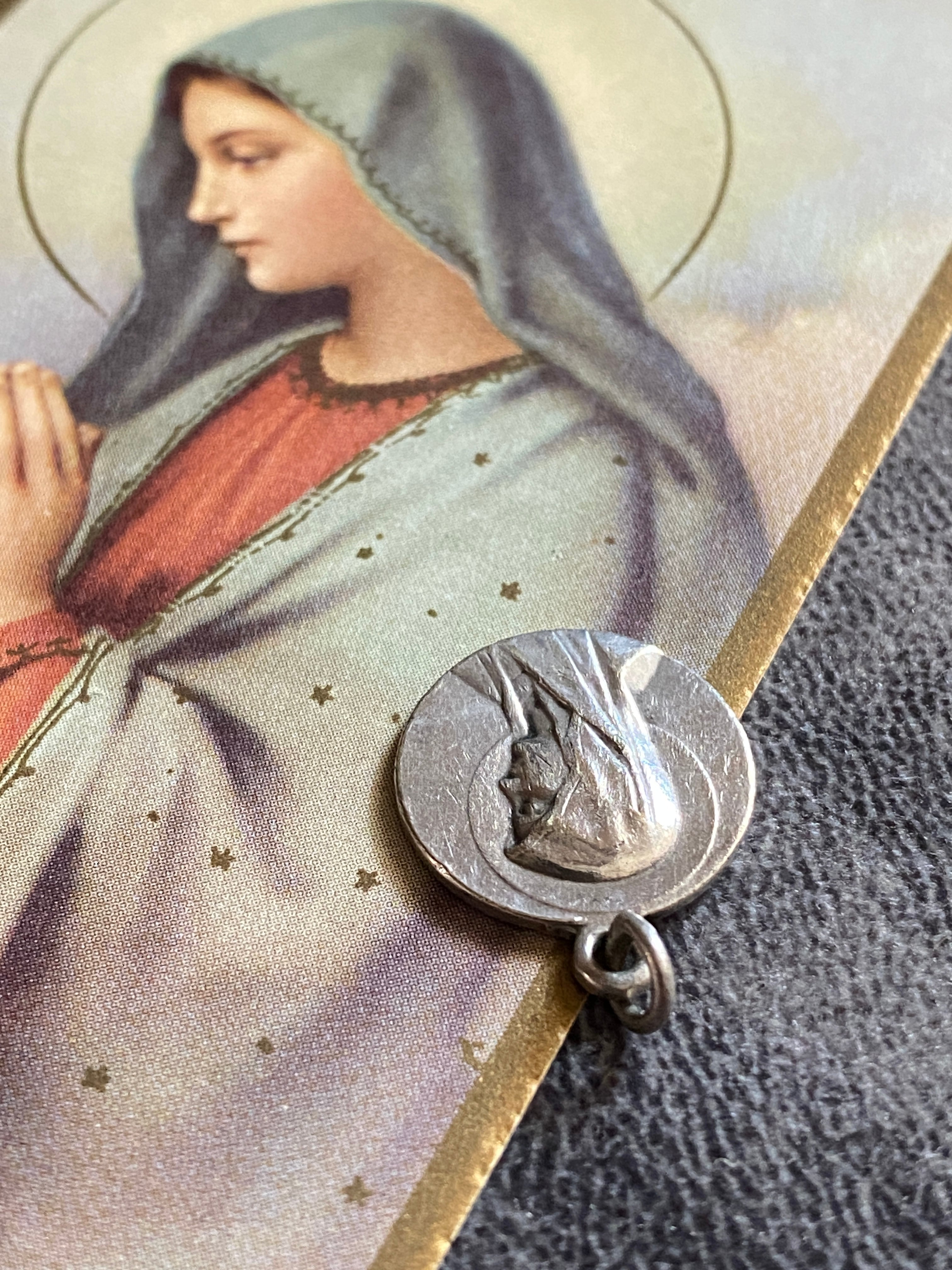 正面を向くメダイとは異なり、視線を落とし、内へと誘うような表情が印象的な一枚です。