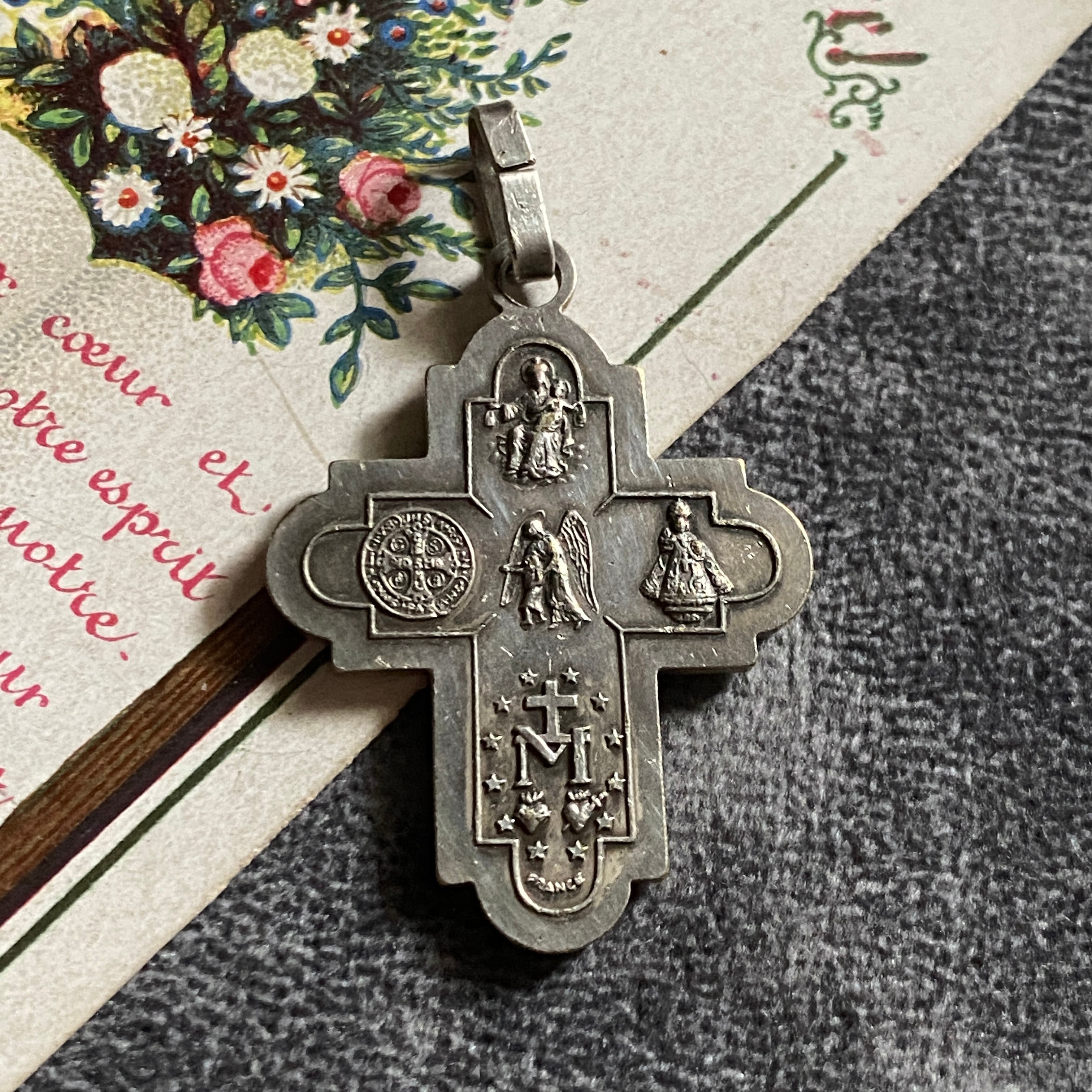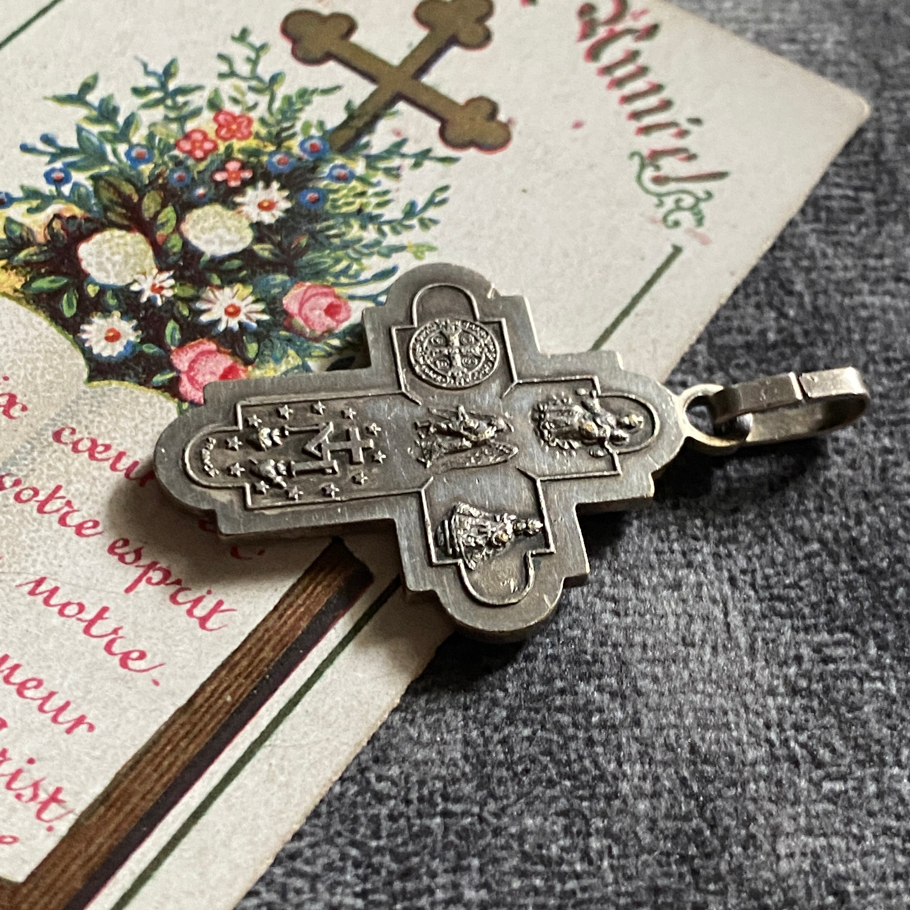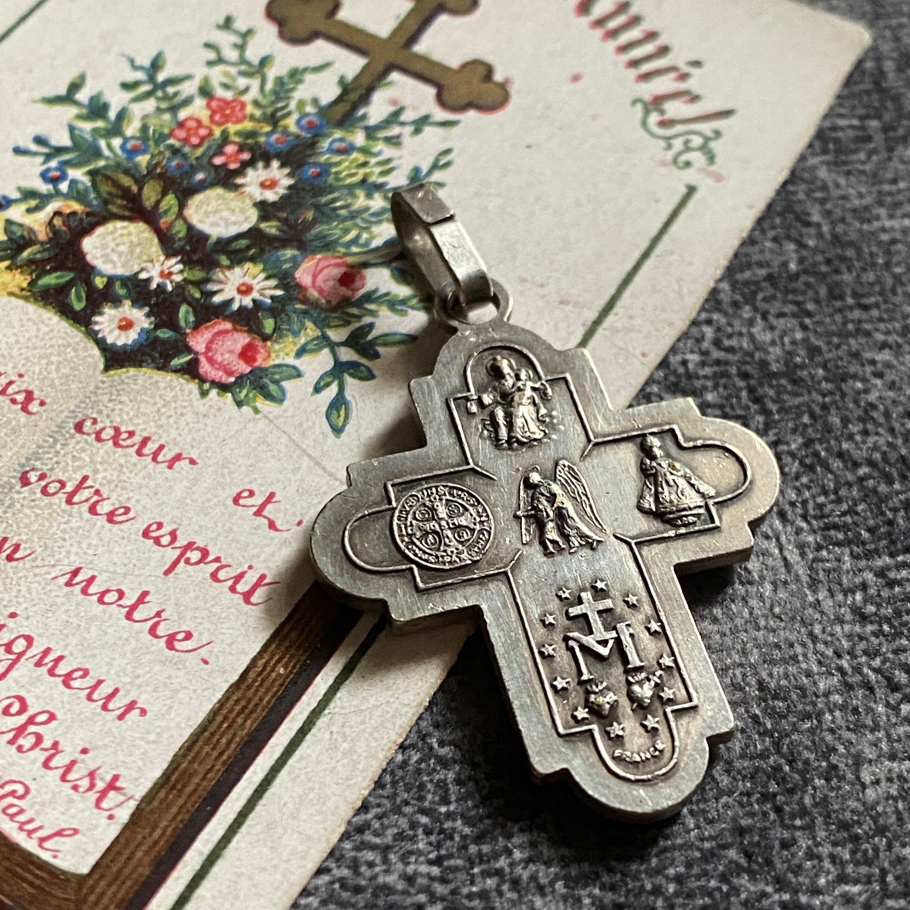 表面には、イエスキリストが御心を指し示すお姿、魔力で悪を封じる聖ベネディクト、1830年に現れたとする不思議のメダイのモチーフになった聖母マリアの表のデザイン、幼子イエスを抱く聖ヨセフ、中央に聖霊。