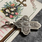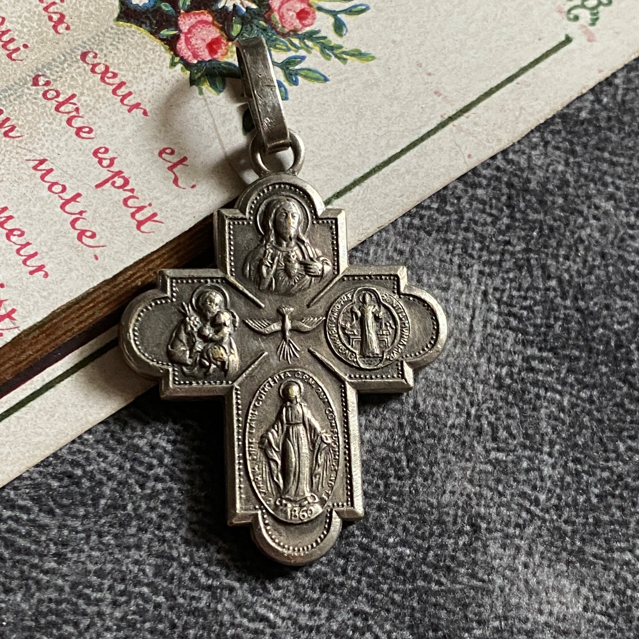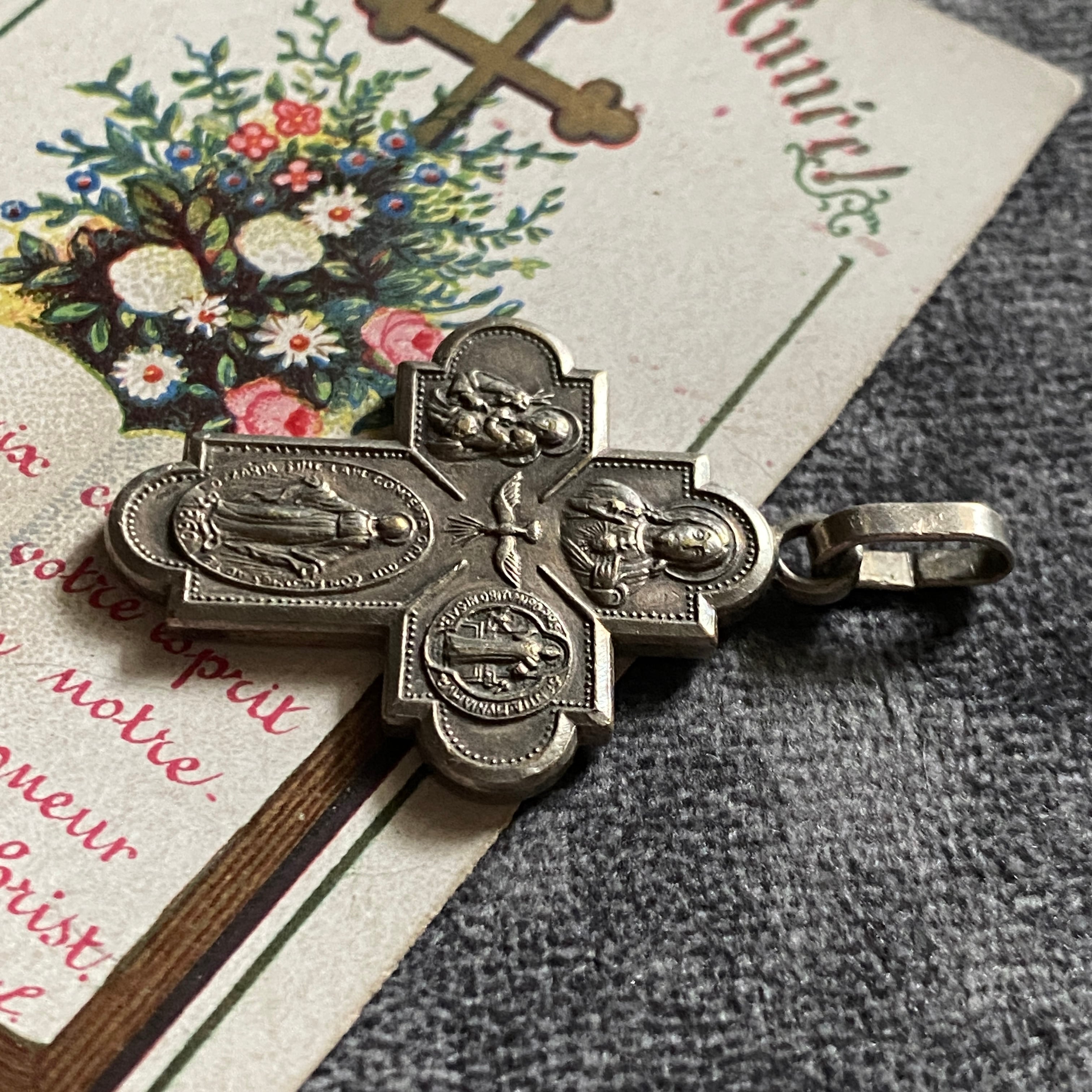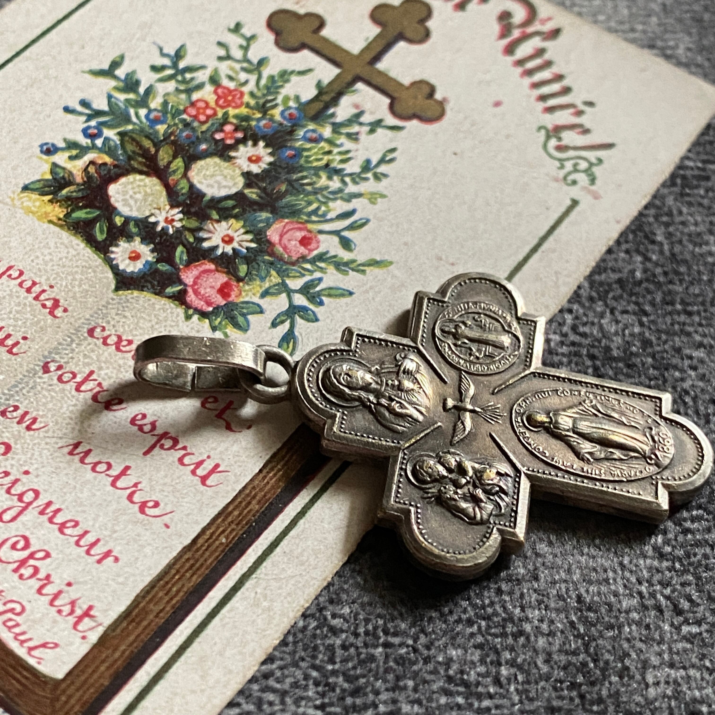 表面には、イエスキリストが御心を指し示すお姿、魔力で悪を封じる聖ベネディクト、1830年に現れたとする不思議のメダイのモチーフになった聖母マリアの表のデザイン、幼子イエスを抱く聖ヨセフ、中央に聖霊。