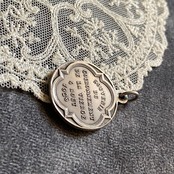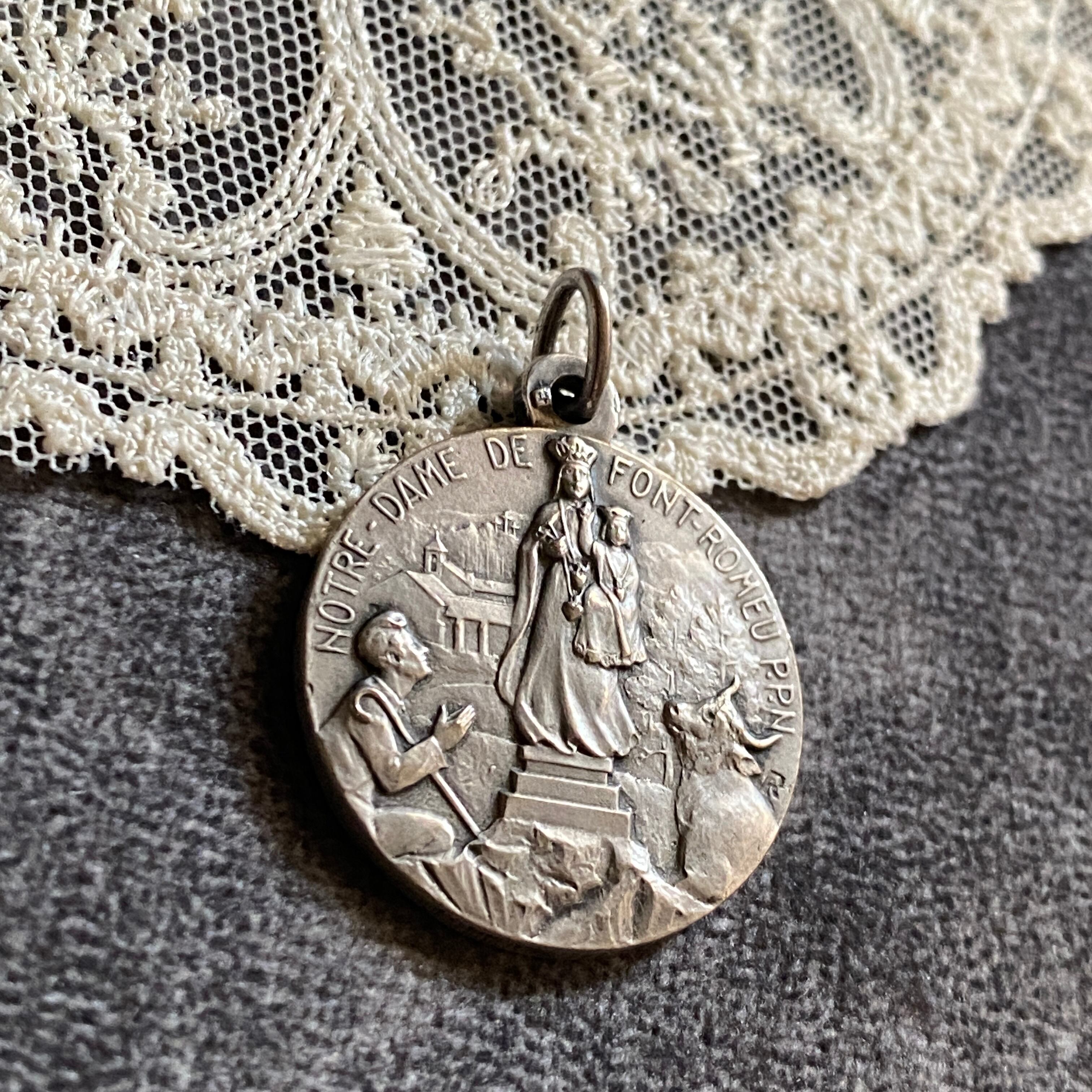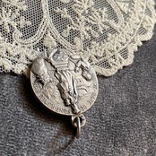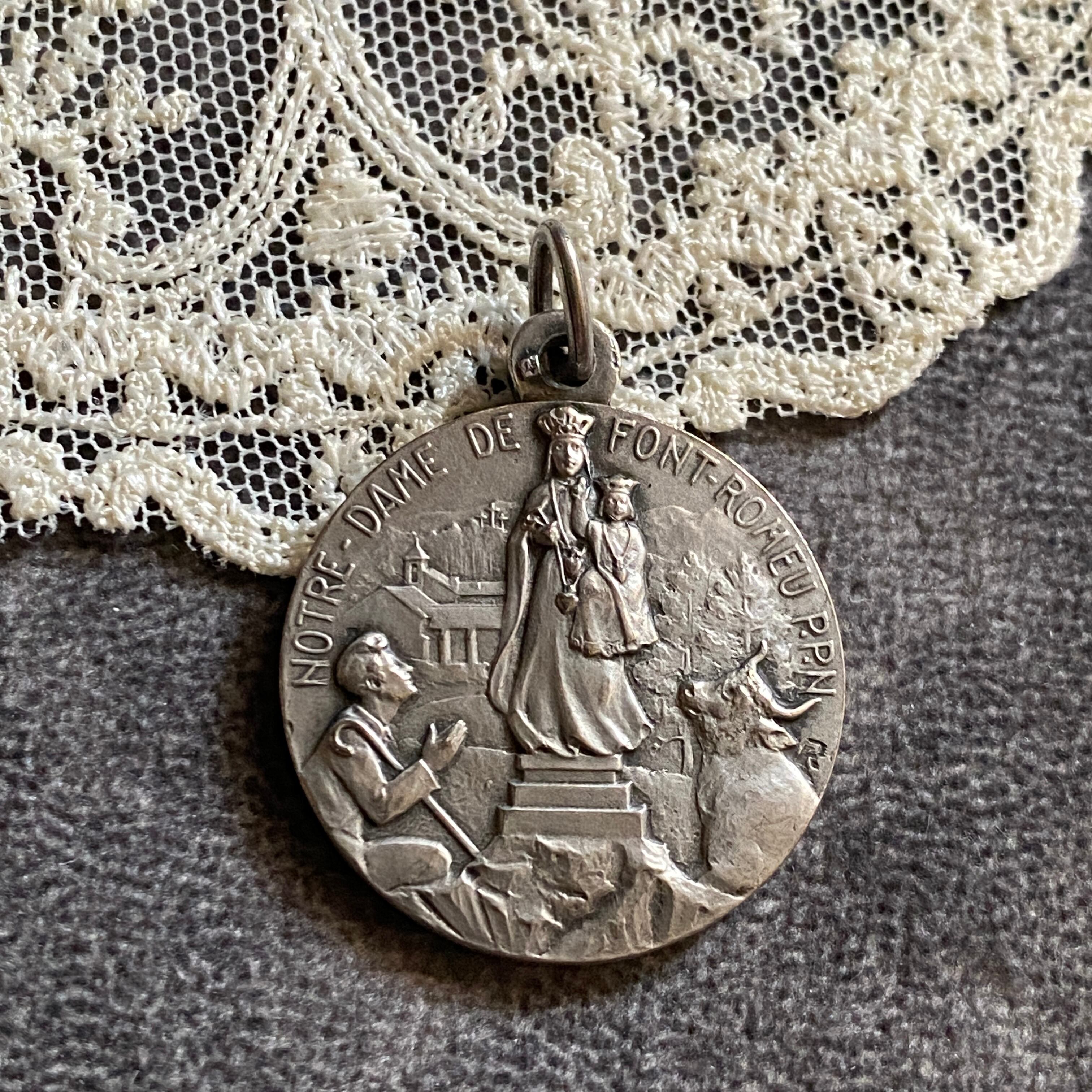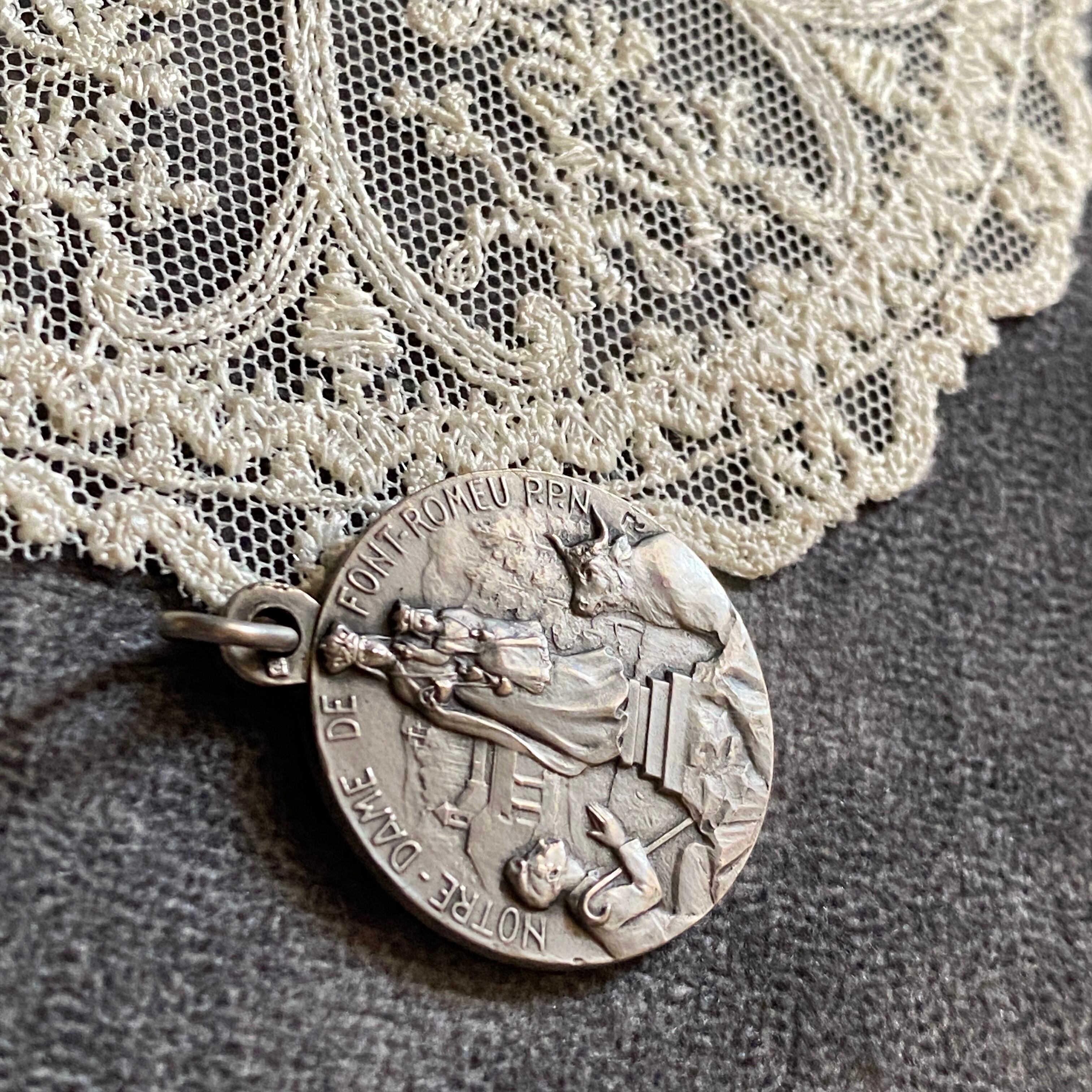 メダイ前面には、聖母子像を見上げる紳士と牛が描かれており、右下には作家Rの刻印が残されています。